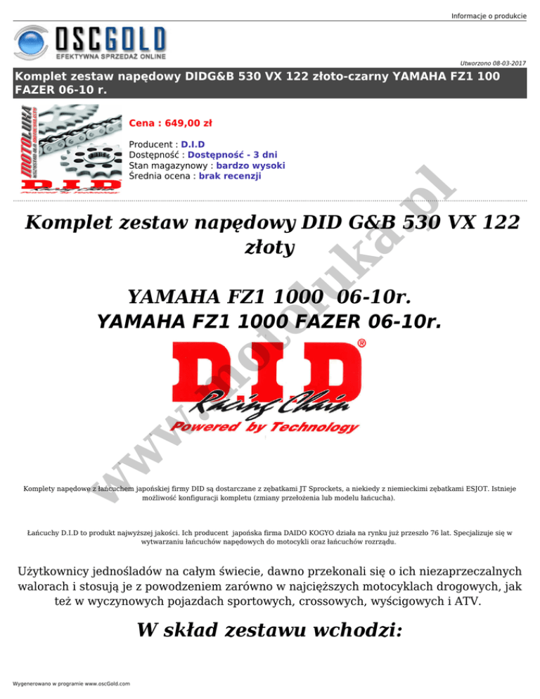 Informacje o produkcie Utworzono 08-03-2017 Komplet zestaw napędowy DIDG&B 530 VX 122 złoto-czarny YAMAHA FZ1 100 FAZER 06-10 r. Cena : 649,00 zł a. pl Producent : D.I.D Dostępność : Dostępność - 3 dni Stan magazynowy : bardzo wysoki Średnia ocena : brak recenzji uk Komplet zestaw napędowy DID G&B 530 VX 122 złoty w w w .m ot ol YAMAHA FZ1 1000 06-10r. YAMAHA FZ1 1000 FAZER 06-10r. Komplety napędowe z łańcuchem japońskiej firmy DID są dostarczane z zębatkami JT Sprockets, a niekiedy z niemieckimi zębatkami ESJOT. Istnieje możliwość konfiguracji kompletu (zmiany przełożenia lub modelu łańcucha). Łańcuchy D.I.D to produkt najwyższej jakości. Ich producent japońska firma DAIDO KOGYO działa na rynku już przeszło 76 lat. Specjalizuje się w wytwarzaniu łańcuchów napędowych do motocykli oraz łańcuchów rozrządu. Użytkownicy jednośladów na całym świecie, dawno przekonali się o ich niezaprzeczalnych walorach i stosują je z powodzeniem zarówno w najcięższych motocyklach drogowych, jak też w wyczynowych pojazdach sportowych, crossowych, wyścigowych i ATV. W skład zestawu wchodzi: Wygenerowano w programie www.oscGold.com w w w .m ot ol uk a. pl - łańcuch napędowy D.I.D G&B 530 VX 122 X-ringowy wzmocniony złoto-czarny - zębatka przednia JT F579-17 - zębatka tylna stalowa JT 479-45
