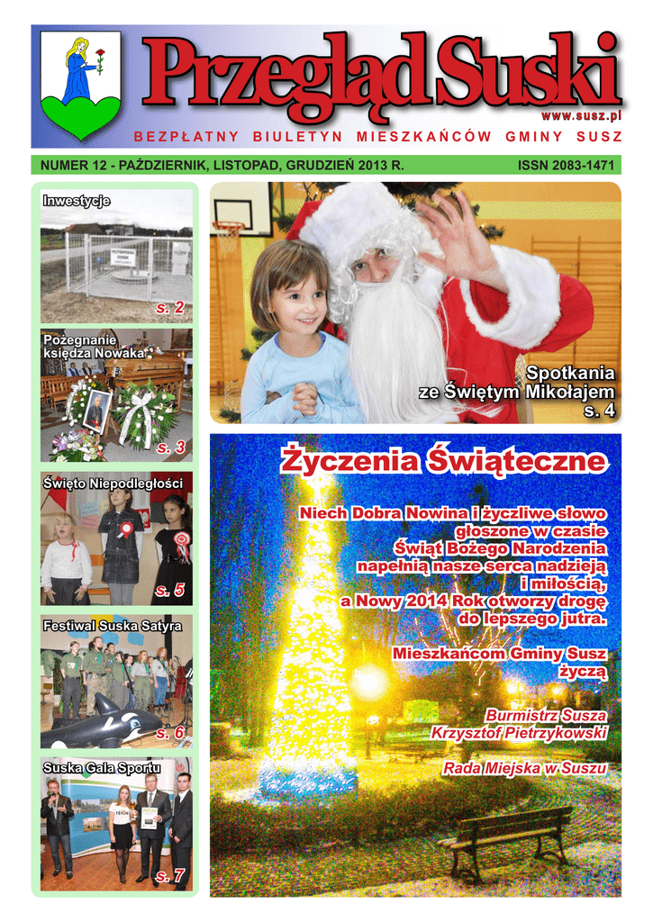Przegląd Suski w w w. su s z . p l B E Z P Ł AT N Y BIULETYN MIESZKAŃCÓW NUMER 12 - PAŹDZIERNIK, LISTOPAD, GRUDZIEŃ 2013 R. GMINY SUSZ ISSN 2083-1471 Inwestycje s. 2 Pożegnanie księdza Nowaka Spotkania ze Świętym Mikołajem s. 4 s. 3 Święto Niepodległości s. 5 Festiwal Suska Satyra Życzenia Świąteczne Niech Dobra Nowina i życzliwe słowo głoszone w czasie Świąt Bożego Narodzenia napełnią nasze serca nadzieją i miłością, a Nowy 2014 Rok otworzy drogę do lepszego jutra. Mieszkańcom Gminy Susz życzą s. 6 Suska Gala Sportu s. 7 Burmistrz Susza Krzysztof Pietrzykowski Rada Miejska w Suszu 2 PrzeglądSuski Obiekty sportowe Jak podaje Burmistrz Susza, wielofunkcyjne boisko „Orlik” okazało się dobrze trafioną inwestycją w infrastrukturę sportową. W sezonie korzysta z niego w ciągu miesiąca od 1700 do 2000 mieszkańców. Duże zapotrzebowanie na obiekty sportowe w mieście sprawia, że wyrównywany jest i podwyższany teren między Parkiem Miejskim a budynkiem gimnazjum z myślą o umiejscowieniu tam kolejnego boiska. Droga nr 521 Jesienią 2013 r. rozpoczęła się przebudowa drogi wojewódzkiej nr 521 na odcinku Iława – Susz o długości ok. 18,8 km. Planowane zakończenie tego etapu inwestycji jest przewidywane na październik 2014 r. Przetarg na rozbudowę drogi wojewódzkiej nr 521 na odcinku granica województwa – Susz wraz z miejscowością Susz odbędzie się w I kwartale 2014 r. Odnowione targowisko 7 listopada br. odbyło się oficjalne otwarcie nowo wybudowanego targowiska miejskiego w Suszu. Zrealizowana w ramach programu „Mój Rynek”inwestycja, poza zmianą wizerunku tej części miasta, wpłynie na znaczną poprawę warunków pracy sprzedających towary. Jubileusz 100-lecia urodzin Czesława Rucka, mieszkanka Januszewa świętowała 13 października br. setną rocznicę urodzin. W uroczystościach jubileuszowych uczestniczyły władze miasta, rodzina i inni goście. Pani Czesława wychowała dwoje dzieci, doczekała się 11 wnuków, 24 prawnuków oraz 5 praprawnuków. PrzeglądSuski Bezpłatny biuletyn Gminy Susz Gmina Biuletyn mieszkańców Gminy Susz Numer 12 - październik, listopad, grudzień 2013 r. mieszkańców Wydawca: Urząd Miejski w Suszu Redakcja i skład: Włodzimierz Paliński, [email protected] Skład numeru zakończony 13.12.2013 r. Druk: Drukarnia Rampi w Iławie Poprawa jakości życia mieszkańców Karolewa Kanalizacja w Karolewie Zakończono budowę sieci kanalizacji sanitarnej tłoczno-grawitacyjnej w Karolewie. Przed realizacją inwestycji nieczystości płynne z obszaru miejscowości odprowadzane były do często nieszczelnych zbiorników bezodpływowych, co stwarzało realne zagrożenie dla środowiska naturalnego. Operacja finansowana była z Europejskiego Funduszu Rolnego na rzecz Rozwoju Obszarów Wiejskich w ramach działania „Podstawowe usługi dla gospodarki i ludności wiejskiej” Programu Rozwoju Obszarów Wiejskich na lata 2007–2013. Na realizację zadania Gmina Susz pozyskała 263.325,00 zł. Całkowita wartość zadania to 431.853,05 zł. W ramach inwestycji powstała sieć kanalizacji o łącznej długości 2358,9 m oraz wodociągowa o długości 39 m. Samorząd Gminy Susz od wielu lat konsekwentnie realizuje politykę rozbudowy infrastruktury wodno-kanalizacyjnej zarówno w mieście jak i na obszarach wiejskich. W roku 2013 do sieci kanalizacji sanitarnej przyłączono także wieś Nipkowie oraz ul. Reja w Suszu. ■ Inwestycje na terenie gminy Nowy chodnik w Lubnowych Mieszkańcy wsi Lubnowy, a w szczególności dzieci, które uczęszczają do szkoły podstawowej, mają powody do zadowolenia. Oddano tam do użytku chodnik, który ułatwi życie mieszkańcom oraz wpłynie na poprawę bezpieczeństwa uczniów zmierzających codziennie do szkoły. Chodnik powstał wzdłuż drogi wojewódzkiej na długości niemal pół kilometra. Inwestycja była możliwa dzięki współpracy gminy Susz z Zarzą- dem Dróg Wojewódzkich w Olsztynie, który przekazał materiały budowlane. Koszty robocizny pokryto z budżetu gminy. ■ Konsultacje społeczne w sprawie pomysłu młodzieży Skatepark dla Susza? 5 grudnia w SOK-u odbyło się spotkanie mieszkańców Susza, władz miasta, radnych oraz inicjatorów budowy skateparku. Był to kolejny element konsultacji społecznych w sprawie ewentualnej budowy skateparku. Jego wizualizacja w 100% odpowiada potrzebom skaterów. Obiekt miałby zajmować wolny obszar 1700 m² przy istniejącym Orliku. Nowoczesny skatepark ma służyć dzieciom i młodzieży do uprawiania sportów ekstremalnych. Przewiduje się zawody sportowe na deskorolkach, BMX’ach, rolkach czy hulajnogach. ■ Gmina Biuletyn mieszkańców Gminy Susz Numer 12 - październik, listopad, grudzień 2013 r. Zmarł Honorowy Obywatel Gminy Susz Pożegnanie księdza Nowaka Kilkudziesięciu kapłanów i wielu mieszkańców Gminy Susz uczestniczyło w dwudniowych uroczystościach pogrzebowych ks. prałata Zbigniewa Nowaka, który od 1967 r. pełnił funkcję proboszcza parafii św. Rozalii, a od 1993 roku parafii św. Antoniego w Suszu. Uroczystości pogrzebowe rozpoczęły się w piątek 15 listopada 2013 r. od wyprowadzenia trumny z ciałem księdza z kaplicy pogrzebowej z przejściem do kościoła św. Rozalii, gdzie wierni modlili się w intencji zmarłego. Następnie kondukt żałobny przeszedł do Sanktuarium Św. Antoniego, w którym została odprawiona msza święta pod przewodnictwem Biskupa Pomocniczego Diecezji Elbląskiej Józefa Wysockiego. W sobotę 16 października po mszy świętej koncelebrowanej przez Biskupa Elbląskiego Jana Styrnę trumna z ciałem zmarłego przeszła w kondukcie żałobnym ulicami miasta, by przy pomniku Chrystusa Króla odjechać w eskorcie Ochotniczych Straży Po- żarnych Gminy Susz do miejsca spoczynku. Ks. Nowak został pochowany na terenie rodzinnej parafii św. Jana Chrzciciela w Sadownem w województwie mazowieckim. Pierwszy Honorowy Obywatel Gminy Susz zają