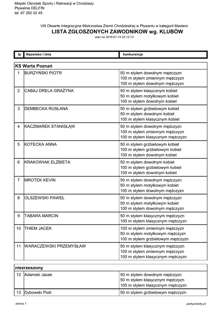 Miejski Ośrodek Sportu i Rekreacji w Chodzieży Pływalnia DELFIN tel. 67 282 02 49 VIII Otwarte Integracyjne Mistrzostwa Ziemii Chodzieskiej w Pływaniu w kategorii Masters LISTA ZGŁOSZONYCH ZAWODNIKOW wg. KLUBÓW stan na 2016-01-14 02:12:13 lp Nazwisko i imię konkurencje KS Warta Poznań 1 BURZYŃSKI PIOTR 50 m stylem dowolnym mężczyzn 100 m stylem zmiennym mężczyzn 100 m stylem dowolnym mężczyzn 2 CABAJ DRELA GRAŻYNA 50 m stylem klasycznym kobiet 50 m stylem motylkowym kobiet 100 m stylem dowolnym kobiet 3 DEMBECKA RUSŁANA 50 m stylem grzbietowym kobiet 50 m stylem dowolnym kobiet 100 m stylem klasycznym kobiet 4 KACZMAREK STANISŁĄW 50 m stylem dowolnym mężczyzn 100 m stylem zmiennym mężczyzn 100 m stylem klasycznym mężczyzn 5 KOTECKA ANNA 50 m stylem grzbietowym kobiet 100 m stylem grzbietowym kobiet 100 m stylem dowolnym kobiet 6 KRAKOWIAK ELŻBIETA 50 m stylem dowolnym kobiet 100 m stylem grzbietowym kobiet 100 m stylem dowolnym kobiet 7 MROTEK KEVIN 50 m stylem dowolnym mężczyzn 50 m stylem motylkowym kobiet 100 m stylem dowolnym mężczyzn 8 OLSZEWSKI PAWEŁ 50 m stylem dowolnym mężczyzn 50 m stylem motylkowym kobiet 100 m stylem dowolnym mężczyzn 9 TABARA MARCIN 50 m stylem klasycznym mężczyzn 100 m stylem klasycznym mężczyzn 10 THIEM JACEK 100 m stylem zmiennym mężczyzn 50 m stylem motylkowym mężczyzn 100 m stylem grzbietowym mężczyzn 11 WARACZEWSKI PRZEMYSŁAW 50 m stylem klasycznym mężczyzn 100 m stylem zmiennym mężczyzn 100 m stylem klasycznym mężczyzn niezrzeszony 12 Adamski Jacek 50 m stylem dowolnym mężczyzn 50 m stylem klasycznym mężczyzn 100 m stylem klasycznym mężczyzn 13 Dybowski Piotr 50 m stylem grzbietowym mężczyzn strona 1 partyumarty.pl lp Nazwisko i imię konkurencje 50 m stylem klasycznym mężczyzn 100 m stylem klasycznym mężczyzn 14 KOSICKI KOSICKI 50 m stylem dowolnym mężczyzn 50 m stylem motylkowym mężczyzn 100 m stylem dowolnym mężczyzn 15 Krzekotowski Piotr 50 m stylem motylkowym mężczyzn 100 m stylem grzbietowym mężczyzn 100 m stylem dowolnym mężczyzn 16 Lewandowski |ygmunt 50 m stylem dowolnym mężczyzn 50 m stylem motylkowym mężczyzn 17 Wiecki Wojciech 50 m stylem dowolnym mężczyzn 50 m stylem klasycznym mężczyzn Start Poznań 18 Beszterda Łukasz 50 m stylem dowolnym mężczyzn 100 m stylem zmiennym mężczyzn 100 m stylem dowolnym mężczyzn 19 MADUZIA ANETA 50 m stylem klasycznym kobiet 50 m stylem motylkowym kobiet 100 m stylem klasycznym kobiet UKS Wodnik 29 Katowice 20 STEFANEK JOLANTA 50 m stylem klasycznym kobiet 100 m stylem klasycznym kobiet Astoria Bydgoszcz 21 Kawecki Krzysztof 50 m stylem grzbietowym mężczyzn 50 m stylem klasycznym mężczyzn 100 m stylem zmiennym mężczyzn Warsaw Masters Team 22 Olszewska Edyta 50 m stylem dowolnym kobiet 100 m stylem zmiennym kobiet 100 m stylem dowolnym kobiet 23 PAWŁOWSKI BARTŁOMIEJ 50 m stylem klasycznym mężczyzn 100 m stylem dowolnym mężczyzn 24 Sobczyk Patryk 100 m stylem zmiennym mężczyzn 50 m stylem motylkowym mężczyzn TS Olimpia Poznań 25 Barełkowska Teresa 50 m stylem grzbietowym kobiet 50 m stylem klasycznym kobiet 100 m stylem grzbietowym kobiet 26 Boryski Jerzy 50 m stylem grzbietowym mężczyzn 100 m stylem grzbietowym mężczyzn 27 Cybertowicz Sławomir 50 m stylem klasycznym mężczyzn 50 m stylem motylkowym mężczyzn 28 Gano-Kosturkiewicz Anna 50 m stylem grzbietowym kobiet strona 2 partyumarty.pl lp Nazwisko i imię konkurencje 50 m stylem dowolnym kobiet 50 m stylem motylkowym kobiet 29 Kujawa Bogusław 50 m stylem dowolnym mężczyzn 30 Lesiński Jacek 50 m stylem grzbietowym mężczyzn 100 m stylem zmiennym mężczyzn 31 Matyszczak Jacek 50 m stylem grzbietowym mężczyzn 50 m stylem motylkowym mężczyzn 100 m stylem dowolnym mężczyzn 32 Niemczyk Krystyna 50 m stylem grzbietowym kobiet 50 m stylem klasycznym kobiet 33 Nochowicz Piotr 50 m stylem grzbietowym mężczyzn 100 m stylem grzbietowym mężczyzn 34 Pietraszewski Zbigniew 100 m stylem zmiennym mężczyzn 50 m stylem motylkowym mężczyzn 100 m stylem dowolnym mężczyzn 35 Puchalska Joanna 50 m stylem klasycznym kobiet 50 m stylem motylkowym kobiet 36 Strzelecka Krystyna 50 m stylem dowolnym kobiet 100 m stylem zmiennym kobiet 100 m stylem dowolnym kobiet 37 Sypniewski Andrzej 50 m stylem grzbietowym mężczyzn 100 m stylem zmiennym mężczyzn 100 m stylem klasycznym mężczyzn 38 Łasińska Małgorzata 50 m stylem grzbietowym kobiet 100 m stylem zmiennym kobiet 50 m stylem motylkowym kobiet 39 Łutowicz Maria 50 m stylem grzbietowym kobiet 50 m stylem klasycznym kobiet 50 m stylem motylkowym kobiet Chodzież 40 Kruszka Szymon 50 m stylem motylkowym mężczyzn Szczecineckie Towarzystwo Pływackie Masters 41 Chitruszko Krzysztof 50 m stylem grzbietowym mężczyzn 50 m stylem klasycznym mężczyzn 100 m stylem klasycznym mężczyzn 42 Dębczyńska Mariola 50 m stylem grzbietowym kobiet 50 m stylem klasycznym kobiet 100 m stylem klasycznym kobiet 43 Dębczyński Ryszard 50 m stylem dowolnym mężczyzn 50 m stylem klasycznym mężczyzn 100 m stylem klasycznym mężczyzn 44 Filipowska Irena 50 m stylem grzbietowym kobiet 50 m stylem klasycznym kobiet 100 m stylem grzbietowym kobiet 45 Jaczewska Barbara 50 m stylem grzbietowym kobiet 50 m stylem dowolnym kobiet strona 3 partyumarty.pl lp Nazwisko i imię konkurencje 50 m stylem klasycznym kobiet 46 Ludwiczak Zbigniew 50 m stylem grzbietowym mężczyzn 100 m stylem grzbietowym mężczyzn 100 m stylem dowolnym mężczyzn 47 Piotrowicz Anna 50 m stylem dowolnym kobiet 100 m stylem grzbietowym kobiet 100 m stylem klasycznym kobiet 48 Rabiej Alfreda 50 m stylem grzbietowym kobiet 50 m stylem klasycznym kobiet 100 m stylem grzbietowym kobiet 49 Wełk Zofia 50 m stylem klasycznym kobiet 50 m stylem motylkowym kobiet 100 m stylem klasycznym kobiet 50 Witkowska Krystyna 50 m stylem grzbietowym kobiet 50 m stylem dowolnym kobiet 100 m stylem dowolnym kobiet 51 Wojnicz Andrzej 50 m stylem klasycznym mężcz