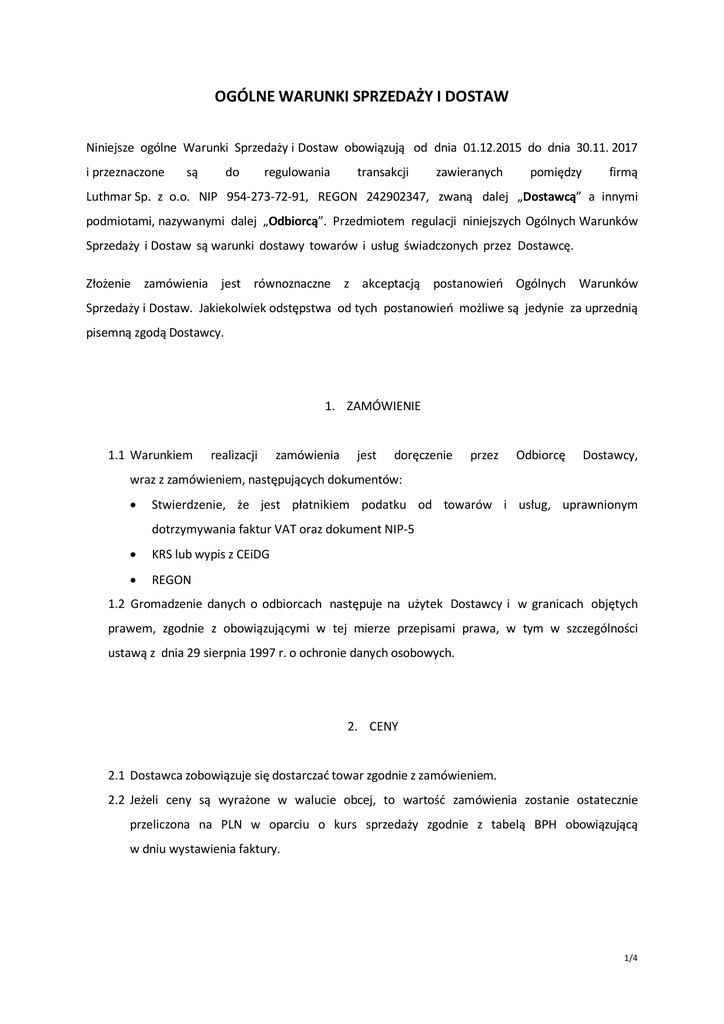 OGÓLNE WARUNKI SPRZEDAŻY I DOSTAW Niniejsze ogólne Warunki Sprzedaży i Dostaw obowiązują od dnia 01.12.2015 do dnia 30.11. 2017 i przeznaczone są do regulowania transakcji zawieranych pomiędzy firmą Luthmar Sp. z o.o. NIP 954-273-72-91, REGON 242902347, zwaną dalej „Dostawcą” a innymi podmiotami, nazywanymi dalej „Odbiorcą”. Przedmiotem regulacji niniejszych Ogólnych Warunków Sprzedaży i Dostaw są warunki dostawy towarów i usług świadczonych przez Dostawcę. Złożenie zamówienia jest równoznaczne z akceptacją postanowień Ogólnych Warunków Sprzedaży i Dostaw. Jakiekolwiek odstępstwa od tych postanowień możliwe są jedynie za uprzednią pisemną zgodą Dostawcy. 1. ZAMÓWIENIE 1.1 Warunkiem realizacji zamówienia jest doręczenie przez Odbiorcę Dostawcy, wraz z zamówieniem, następujących dokumentów: Stwierdzenie, że jest płatnikiem podatku od towarów i usług, uprawnionym dotrzymywania faktur VAT oraz dokument NIP-5 KRS lub wypis z CEiDG REGON 1.2 Gromadzenie danych o odbiorcach następuje na użytek Dostawcy i w granicach objętych prawem, zgodnie z obowiązującymi w tej mierze przepisami prawa, w tym w szczególności ustawą z dnia 29 sierpnia 1997 r. o ochronie danych osobowych. 2. CENY 2.1 Dostawca zobowiązuje się dostarczać towar zgodnie z zamówieniem. 2.2 Jeżeli ceny są wyrażone w walucie obcej, to wartość zamówienia zostanie ostatecznie przeliczona na PLN w oparciu o kurs sprzedaży zgodnie z tabelą BPH obowiązującą w dniu wystawienia faktury. 1/4 3. DOSTAWA 3.1 Jeżeli w formie pisemnej nie zostało ustalone inaczej, to dostawa następuje na koszt odbiorcy wg ustalonych wspólnie zasad spedycji. Jeżeli nie ustalono warunków przesyłki, to następuje ona wg wyboru Dostawcy. 3.2 Dostawca nie ponosi odpowiedzialności za ubytki, zmiany i uszkodzenia powstałe podczas transportu. Na wyraźne żądanie Odbiorcy Dostawca zobowiązuje się do ubezpieczenia transportu na warunkach i koszt Odbiorcy. 4. TERMIN DOSTAWY 4.1 Termin dostawy liczony jest od daty złożenia zamówienia, wyjątkiem jest przedpłata, gdzie termin dostawy jest liczony od dnia zaksięgowania płatności na naszym koncie. W przypadku zmiany terminu dostawy Dostawca ustala każdorazowo z Odbiorcą nowy termin. 4.2 W przypadku zwłoki w terminie płatności na rzecz dostawcy dostawca zastrzega sobie prawo zmiany terminu dostawy przedmiotu umowy. Przypadki działania siły wyższej, strajki a także zakłócenia ruchu, zakłócenia w funkcjonowaniu zakładu, braki surowców, przedłużony okres oczekiwania na odprawę celną, jak również inne zdarzenia będące następstwem w/w, które powodują przedłużenie terminu produkcji lub wysyłki zarówno u sprzedawcy jak również u jego dostawców, zwalniają Dostawcę na czas ich trwania od obowiązku dostawy. 5. ODSTĄPIENIE OD WARUNKÓW DOSTAW 5.1 Odbiorca ma prawo od odstąpienia od realizacji zamówienia w ciągu 3 dni roboczych od dnia złożenia zamówienia. Oświadczenie o odstąpieniu powinno nastąpić w formie pisemnej. Pisemne oświadczenie o odstąpieniu od realizacji zamówienia dotyczy wszystkich zamówień, zarówno tych realizowanych z odroczoną datą płatności jak i przy wpłacie Proforma. 5.2 W przypadku odstąpienia przez Odbiorcę od części lub całości realizacji przedmioty zamówienia po terminie wymienionym w pkt. 5.1. Odbiorca zapłaci Dostawcy karę umowną w wysokości 40% wartości zamówionego towaru, z którego rezygnuje, plus poniesione przez Dostawcę udokumentowane koszty. 2/4 5.3 Po wysłaniu towaru przez Dostawcę odstąpienie przez Odbiorcę od realizacji zamówienia powoduje naliczenie kary w wysokości 50% wartości towaru, z którego rezygnuje. 5.4 Brak zapłaty za fakturę proformę w terminie 14 dni od daty jej wystawienia, będzie traktowany równoznacznie z odstąpieniem od realizacji zamówienia. Zastrzegamy sobie prawo do naliczenia kary umownej wynikającej z pkt. 5.2 lub 5.3. 6. WARUNKI PŁATNOŚCI 6.1 Termin płatności ustalany jest każdorazowo w procesie ofertowania. 6.2 W szczególnych przypadkach Dostawca zastrzega sobie prawo, przed przystąpieniem do realizacji zamówienia, nieodwołalnych do wystąpienia zabezpieczeń do finansowych Odbiorcy w postaci z żądaniem gwarancji przedstawienia bankowej, polisy ubezpieczeniowej, cesji lub porozumienia trójstronnego z wiarygodnym płatnikiem. 6.3 Opóźnienie w terminowym uregulowaniu należności powoduje obowiązek zapłaty odsetek wysokości czterokrotności wysokości stopy kredytu lombardowego Narodowego Banku Polskiego w stosunku rocznym. 7. GWARANCJA Jeżeli nie uzgodniono inaczej Dostawca udziela Odbiorcy gwarancji na dostarczony towar na niżej wymienionych warunkach gwarancyjnych: 7.1 Okres gwarancji wynosi 18 miesięcy od daty dostawy lecz nie dłużej niż 12 miesięcy od daty uruchomienia urządzenia. Gwarancja obejmuje sprawność techniczną urządzeń i uzyskanie parametrów technologicznych. 7.2 Z gwarancji są wyłączone uszkodzenia wynikłe z niewłaściwej eksploatacji, montażu oraz naturalnego zużycia elementów zużywających się . Gwarancja nie obejmuje również uszkodzeń powstałych w skutek ingerencji naprawczej bez zgody Dostawcy. 7.3 Zakres naprawy gwarancyjnej ustala Dostawca po stwierdzeniu przyczyny uszkodzenia, po ewentualnej konsultacji z producentem. 7.4 W związku z udzieloną gwarancją, wyłączone zostają uprawnienia z tytułu rękojmi. 7.5 Naprawy czystego sprzętu realizowane są wyłącznie w siedzibie firmy Luthmar Sp. z o.o. 7.6 Aby mieć prawo do gwarancji, klient musi uregulować płatności. Produkt musi zostać dostarczony do siedziby firmy Luthmar Sp. z o.o. 3/4 8. REKLAMACJE 8.1 Odbiorca jest zobowiązany do niezwłocznego, nie później jednak niż w terminie 7 dni od daty nadejścia towaru do miejsca przeznaczenia , powiadomienia Dostawcy o wadliwości towaru lub o jego brakach ilościowych. 9. USTALENIA KOŃCOWE 9.1 Odbiorca nie jest uprawniony, bez