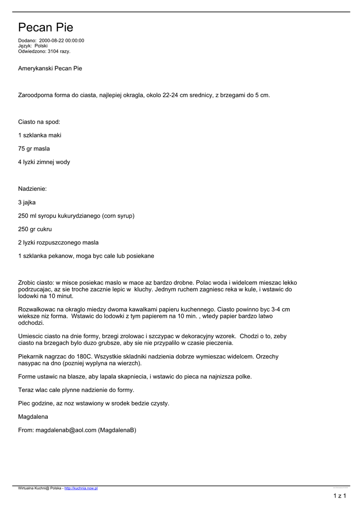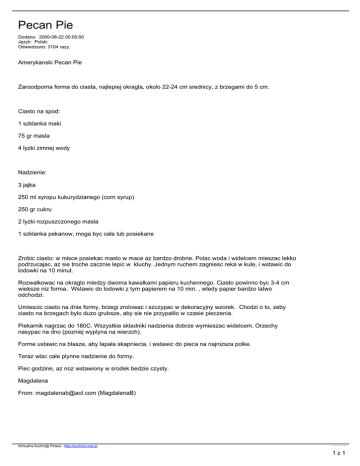 Pecan Pie Dodano: 2000-08-22 00:00:00 Język: Polski Odwiedzono: 3104 razy. Amerykanski Pecan Pie Zaroodporna forma do ciasta, najlepiej okragla, okolo 22-24 cm srednicy, z brzegami do 5 cm. Ciasto na spod: 1 szklanka maki 75 gr masla 4 lyzki zimnej wody Nadzienie: 3 jajka 250 ml syropu kukurydzianego (corn syrup) 250 gr cukru 2 lyzki rozpuszczonego masla 1 szklanka pekanow, moga byc cale lub posiekane Zrobic ciasto: w misce posiekac maslo w mace az bardzo drobne. Polac woda i widelcem mieszac lekko podrzucajac, az sie troche zacznie lepic w kluchy. Jednym ruchem zagniesc reka w kule, i wstawic do lodowki na 10 minut. Rozwalkowac na okraglo miedzy dwoma kawalkami papieru kuchennego. Ciasto powinno byc 3-4 cm wieksze niz forma. Wstawic do lodowki z tym papierem na 10 min. , wtedy papier bardzo latwo odchodzi. Umiescic ciasto na dnie formy, brzegi zrolowac i szczypac w dekoracyjny wzorek. Chodzi o to, zeby ciasto na brzegach bylo duzo grubsze, aby sie nie przypalilo w czasie pieczenia. Piekarnik nagrzac do 180C. Wszystkie skladniki nadzienia dobrze wymieszac widelcem. Orzechy nasypac na dno (pozniej wyplyna na wierzch). Forme ustawic na blasze, aby lapala skapniecia, i wstawic do pieca na najnizsza polke. Teraz wlac cale plynne nadzienie do formy. Piec godzine, az noz wstawiony w srodek bedzie czysty. Magdalena From: [email protected] (MagdalenaB) Wirtualna Kuchni@ Polska - http://kuchnia.now.pl przepis nr 6766, plik wygenerowano 2017.03.08 02:59 1z1