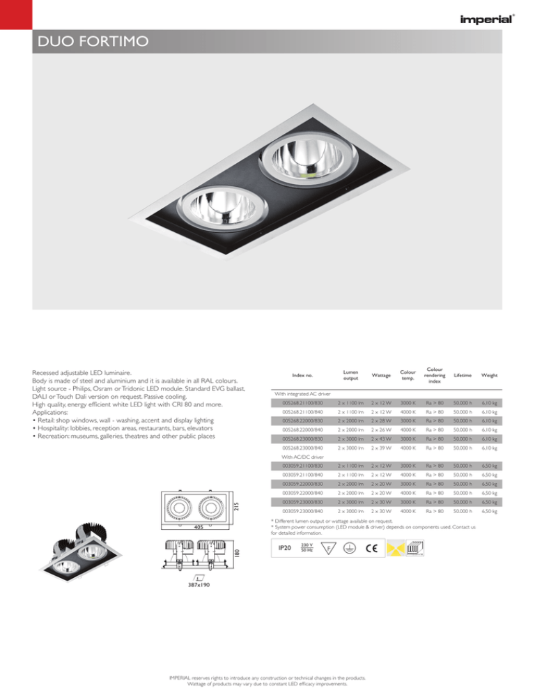 DUO FORTIMO Recessed adjustable LED luminaire. Body is made of steel and aluminium and it is available in all RAL colours. Light source - Philips, Osram or Tridonic LED module. Standard EVG ballast, DALI or Touch Dali version on request. Passive cooling. High quality, energy efficient white LED light with CRI 80 and more. Applications: • Retail: shop windows, wall - washing, accent and display lighting • Hospitality: lobbies, reception areas, restaurants, bars, elevators • Recreation: museums, galleries, theatres and other public places Lumen output Wattage Colour temp. Colour rendering index Lifetime Weight 005268.21100/830 2 x 1100 lm 2 x 12 W 3000 K Ra > 80 50.000 h 6,10 kg 005268.21100/840 2 x 1100 lm 2 x 12 W 4000 K Ra > 80 50.000 h 6,10 kg 005268.22000/830 2 x 2000 lm 2 x 28 W 3000 K Ra > 80 50.000 h 6,10 kg 005268.22000/840 2 x 2000 lm 2 x 26 W 4000 K Ra > 80 50.000 h 6,10 kg 005268.23000/830 2 x 3000 lm 2 x 43 W 3000 K Ra > 80 50.000 h 6,10 kg 005268.23000/840 2 x 3000 lm 2 x 39 W 4000 K Ra > 80 50.000 h 6,10 kg 003059.21100/830 2 x 1100 lm 2 x 12 W 3000 K Ra > 80 50.000 h 6,50 kg 003059.21100/840 2 x 1100 lm 2 x 12 W 4000 K Ra > 80 50.000 h 6,50 kg 003059.22000/830 2 x 2000 lm 2 x 20 W 3000 K Ra > 80 50.000 h 6,50 kg 003059.22000/840 2 x 2000 lm 2 x 20 W 4000 K Ra > 80 50.000 h 6,50 kg 003059.23000/830 2 x 3000 lm 2 x 30 W 3000 K Ra > 80 50.000 h 6,50 kg 003059.23000/840 2 x 3000 lm 2 x 30 W 4000 K Ra > 80 50.000 h 6,50 kg Index no. With integrated AC driver 215 With AC/DC driver * Different lumen output or wattage available on request. * System power consumption (LED module & driver) depends on components used. Contact us for detailed information. 180 405 IP20 230 V 50 Hz 387x190 IMPERIAL reserves rights to introduce any construction or technical changes in the products. Wattage of products may vary due to constant LED efficacy improvements. PASSIVE