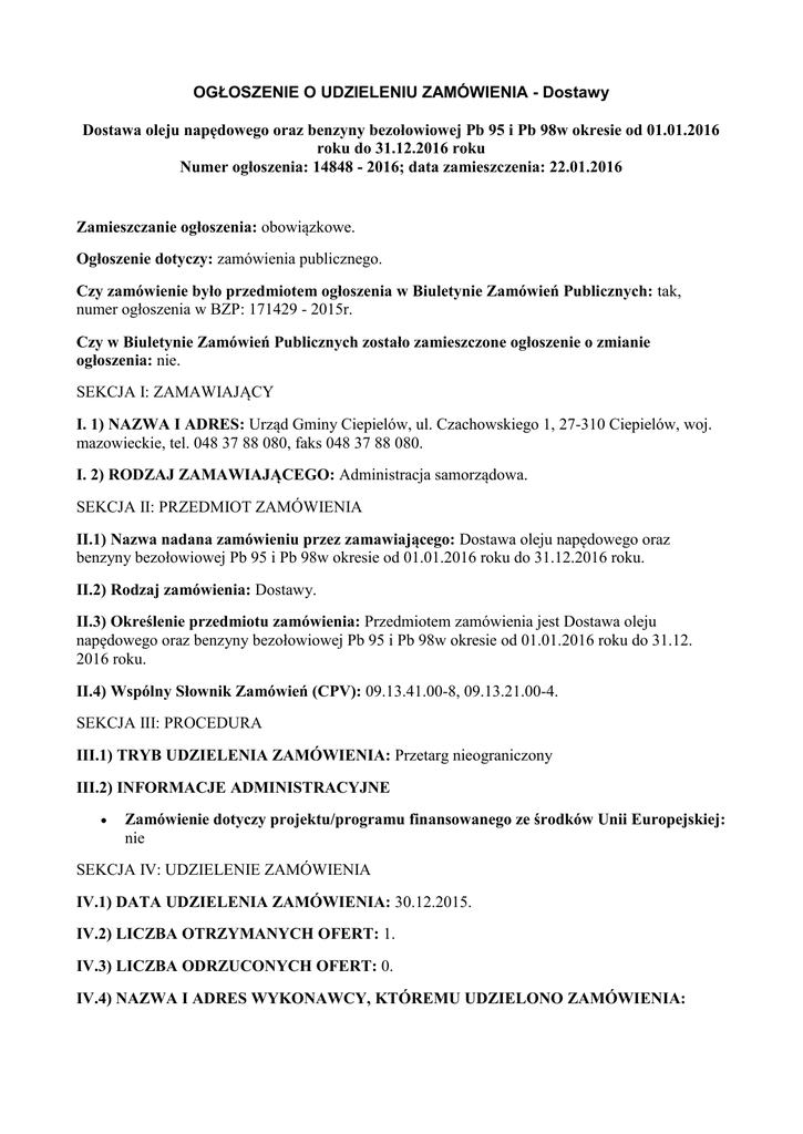 OGŁOSZENIE O UDZIELENIU ZAMÓWIENIA - Dostawy Dostawa oleju napędowego oraz benzyny bezołowiowej Pb 95 i Pb 98w okresie od 01.01.2016 roku do 31.12.2016 roku Numer ogłoszenia: 14848 - 2016; data zamieszczenia: 22.01.2016 Zamieszczanie ogłoszenia: obowiązkowe. Ogłoszenie dotyczy: zamówienia publicznego. Czy zamówienie było przedmiotem ogłoszenia w Biuletynie Zamówień Publicznych: tak, numer ogłoszenia w BZP: 171429 - 2015r. Czy w Biuletynie Zamówień Publicznych zostało zamieszczone ogłoszenie o zmianie ogłoszenia: nie. SEKCJA I: ZAMAWIAJĄCY I. 1) NAZWA I ADRES: Urząd Gminy Ciepielów, ul. Czachowskiego 1, 27-310 Ciepielów, woj. mazowieckie, tel. 048 37 88 080, faks 048 37 88 080. I. 2) RODZAJ ZAMAWIAJĄCEGO: Administracja samorządowa. SEKCJA II: PRZEDMIOT ZAMÓWIENIA II.1) Nazwa nadana zamówieniu przez zamawiającego: Dostawa oleju napędowego oraz benzyny bezołowiowej Pb 95 i Pb 98w okresie od 01.01.2016 roku do 31.12.2016 roku. II.2) Rodzaj zamówienia: Dostawy. II.3) Określenie przedmiotu zamówienia: Przedmiotem zamówienia jest Dostawa oleju napędowego oraz benzyny bezołowiowej Pb 95 i Pb 98w okresie od 01.01.2016 roku do 31.12. 2016 roku. II.4) Wspólny Słownik Zamówień (CPV): 09.13.41.00-8, 09.13.21.00-4. SEKCJA III: PROCEDURA III.1) TRYB UDZIELENIA ZAMÓWIENIA: Przetarg nieograniczony III.2) INFORMACJE ADMINISTRACYJNE Zamówienie dotyczy projektu/programu finansowanego ze środków Unii Europejskiej: nie SEKCJA IV: UDZIELENIE ZAMÓWIENIA IV.1) DATA UDZIELENIA ZAMÓWIENIA: 30.12.2015. IV.2) LICZBA OTRZYMANYCH OFERT: 1. IV.3) LICZBA ODRZUCONYCH OFERT: 0. IV.4) NAZWA I ADRES WYKONAWCY, KTÓREMU UDZIELONO ZAMÓWIENIA: LENARD SPÓŁKA Jawna, Stacja Paliw w Ciepielowie, ul. Norblina 26, 24-100 Puławy, kraj/woj. mazowieckie. IV.5) Szacunkowa wartość zamówienia (bez VAT): 80000,00 PLN. IV.6) INFORMACJA O CENIE WYBRANEJ OFERTY ORAZ O OFERTACH Z NAJNIŻSZĄ I NAJWYŻSZĄ CENĄ Cena wybranej oferty: 54427,20 Oferta z najniższą ceną: 54427,20 / Oferta z najwyższą ceną: 54427,20 Waluta: PLN . Wójt Gminy Ciepielów Artur Szewczyk