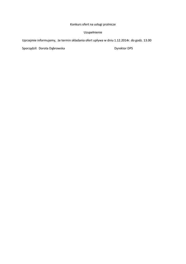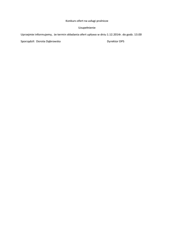Konkurs ofert na usługi pralnicze Uzupełnienie Uprzejmie informujemy, że termin składania ofert upływa w dniu 1.12.2014r. do godz. 13.00 Sporządził: Dorota Dąbrowska Dyrektor DPS