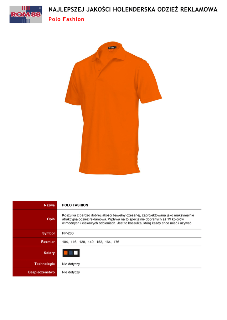 NAJLEPSZEJ JAKOŚCI HOLENDERSKA ODZIEŻ REKLAMOWA Polo Fashion 000,00 zł Nazwa Opis Symbol Rozmiar POLO FASHION Koszulka z bardzo dobrej jakości bawełny czesanej, zaprojektowana jako maksymalnie atrakcyjna odzież reklamowa. Wpływa na to specjalnie dobranych aż 19 kolorów w modnych i ciekawych odcieniach. Jest to koszulka, którą każdy chce mieć i używać. PP-200 104, 116, 128, 140, 152, 164, 176 Kolory Technologia Nie dotyczy Bezpieczenstwo Nie dotyczy