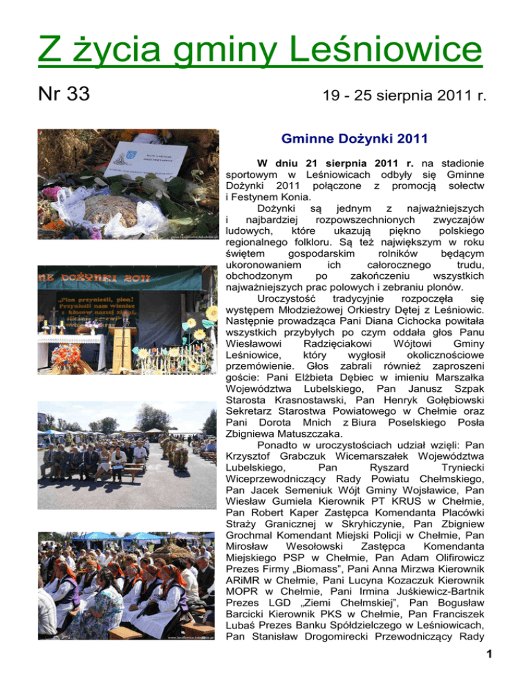 Z życia gminy Leśniowice Nr 33 19 - 25 sierpnia 2011 r. Gminne Dożynki 2011 W dniu 21 sierpnia 2011 r. na stadionie sportowym w Leśniowicach odbyły się Gminne Dożynki 2011 połączone z promocją sołectw i Festynem Konia. Dożynki są jednym z najważniejszych i najbardziej rozpowszechnionych zwyczajów ludowych, które ukazują piękno polskiego regionalnego folkloru. Są też największym w roku świętem gospodarskim rolników będącym ukoronowaniem ich całorocznego trudu, obchodzonym po zakończeniu wszystkich najważniejszych prac polowych i zebraniu plonów. Uroczystość tradycyjnie rozpoczęła się występem Młodzieżowej Orkiestry Dętej z Leśniowic. Następnie prowadząca Pani Diana Cichocka powitała wszystkich przybyłych po czym oddała głos Panu Wiesławowi Radzięciakowi Wójtowi Gminy Leśniowice, który wygłosił okolicznościowe przemówienie. Głos zabrali również zaproszeni goście: Pani Elżbieta Dębiec w imieniu Marszałka Województwa Lubelskiego, Pan Janusz Szpak Starosta Krasnostawski, Pan Henryk Gołębiowski Sekretarz Starostwa Powiatowego w Chełmie oraz Pani Dorota Mnich z Biura Poselskiego Posła Zbigniewa Matuszczaka. Ponadto w uroczystościach udział wzięli: Pan Krzysztof Grabczuk Wicemarszałek Województwa Lubelskiego, Pan Ryszard Tryniecki Wiceprzewodniczący Rady Powiatu Chełmskiego, Pan Jacek Semeniuk Wójt Gminy Wojsławice, Pan Wiesław Gumiela Kierownik PT KRUS w Chełmie, Pan Robert Kaper Zastępca Komendanta Placówki Straży Granicznej w Skryhiczynie, Pan Zbigniew Grochmal Komendant Miejski Policji w Chełmie, Pan Mirosław Wesołowski Zastępca Komendanta Miejskiego PSP w Chełmie, Pan Adam Olifirowicz Prezes Firmy „Biomass”, Pani Anna Mirzwa Kierownik ARiMR w Chełmie, Pani Lucyna Kozaczuk Kierownik MOPR w Chełmie, Pani Irmina Juśkiewicz-Bartnik Prezes LGD „Ziemi Chełmskiej”, Pan Bogusław Barcicki Kierownik PKS w Chełmie, Pan Franciszek Lubaś Prezes Banku Spółdzielczego w Leśniowicach, Pan Stanisław Drogomirecki Przewodniczący Rady 1 Gminy Leśniowice, Pan Czesław Michalczuk Prezes ZG PSL Leśniowice, dyrektorzy zakładów pracy, radni Rady Gminy Leśniowice, sołtysi, dzieci i młodzież szkolna oraz bardzo licznie przybyli mieszkańcy gminy oraz wielu miłośników obrzędów i tradycji dożynkowych. Ponadto listy do organizatorów i rolników skierowali: Pani Genowefa Tokarska Wojewoda Lubelski, Pan Arkadiusz Bratkowski Przewodniczący Sejmiku Województwa Lubelskiego, Pan Jerzy Stefaniuk Poseł na Sejm RP oraz Pan Tadeusz Sławecki Poseł na Sejm RP. Następnie odbyła się uroczysta Msza Święta, którą odprawiali księża: ks. Andrzej Jacenty Pyter Proboszcz Parafii Kumów Plebański oraz ks. Andrzej Walencik Proboszcz Parafii w Rakołupach. Podczas mszy świętej odbył się korowód dożynkowy poprowadzony przez starostów dożynek Państwa Dorotę i Andrzeja Ziarek, podczas którego przekazali oni tradycyjny bochen chleba wypieczony z tegorocznej mąki na ręce Wójta Gminy. W korowodzie zaprezentowano 14 wieńców przygotowanych przez: Sołectwo Leśniowice: KGW Leśniowice, Panie z Polskiego Związku Emerytów i Rencistów Koło Gminne Nr 7 w Leśniowicach i Szkołę Podstawową w Leśniowicach; Sołectwo Majdan Leśniowski: KGW Majdan Leśniowski; Sołectwo Kumów Majoracki: Zespół Śpiewaczy „Kumowianki” z Kumowa Majorackiego; Sołectwo Nowy Folwark: mieszkanki wsi Nowy Folwark; Sołectwo Plisków: mieszkańcy wsi Plisków; Sołectwo Poniatówka: mieszkanki wsi Poniatówka; Sołectwo Rakołupy: Zespół Śpiewaczy „Rakołupianki” z Rakołup i Szkołę Podstawową w Rakołupach; Sołectwo Sarniak: KGW Sarniak; Sołectwo Teresin: mieszkanki wsi Teresin oraz Sołectwo Sielec: Szkołę Podstawową w Sielcu oraz Zespół Śpiewaczy „Sielanki” z Sielca. Podczas korowodu można było usłyszeć tradycyjne pieśni dożynkowe czy też wiersze. Po zakończeniu mszy św. Wójt Gminy i starostowie dożynek podzielili się ze wszystkimi gośćmi poświęconym dożynkowym chlebem. Podczas uroczystości przeprowadzono i rozstrzygnięto konkursy dożynkowe. W konkursie „Najładniejszy Wieniec Dożynkowy” zwyciężył wieniec uwity przez Panie z Zespołu Śpiewaczego „Kumowianki” z Kumowa natomiast w konkursie „Najsmaczniejszy chleb wiejski” I miejsce zajął chleb upieczony przez Panią Kazimierę Zawiślak z Leśniowic. Nagrody finansowe za wieńce wręczył Pan Wiesław Radzięciak Wójt Gminy oraz Pan Stanisław Drogomirecki Przewodniczący Rady Gminy Leśniowice, natomiast nagrody rzeczowe oraz bony 2 towarowe za chleby wiejskie wręczali: Wójt Gminy oraz sponsorzy: Pani Irmina Juśkiewicz-Bartnik Prezes LGD „Ziemi Chełmskiej” i Pan Włodzimierz Miśkiewicz przedstawiciel Firmy E.ON. Energie Odnawialne w Szczecinie. Zwycięski wieniec i chleb zyskały prawo reprezentacji naszej gminy na Dożynkach Powiatowych w Siedliszczu w dniu 4 września br. Po rozstrzygnięciu obu konkursów, przeprowadzono także Loterię Fantową, w której do wygrania były atrakcyjne nagrody ufundowane przez: PB „Parter” w Srebrzyszczu, „Elektromet” w Chełmie, Gospodarstwo Ogrodnicze „Wilgosowie” z Białopola oraz Panią Monikę Mazur z Sielca. Warunkiem odbioru nagrody była osobista obecność przy scenie podczas losowania. Nagrody losowali starostowie dożynek a wręczył je Pan Wiesław Radzięciak Wójt Gminy Leśniowice. Ponadto organizatorzy zapewnili wiele innych atrakcji m.in. pokazy bractwa rycerskiego „Towarzystwo Szabli i Miecza” z Zamościa oraz bogatą część artystyczną, w której zaprezentowały się zespoły śpiewacze z terenu gminy: „Kumowianki”, „Sielanki” i „Rakołupianki”, Zespół „Show-Dance” z Alojzowa, Zespół Muzyczny z Leśniowic, Kapela Ludowa „Siennica” z Siennicy Różanej oraz Zespół „Ventus” z Hrubieszowa. Tradycyjnie już na przygotowanych przez było skosztować sołectwa stoiskach można tradycyjnych regionalnyc