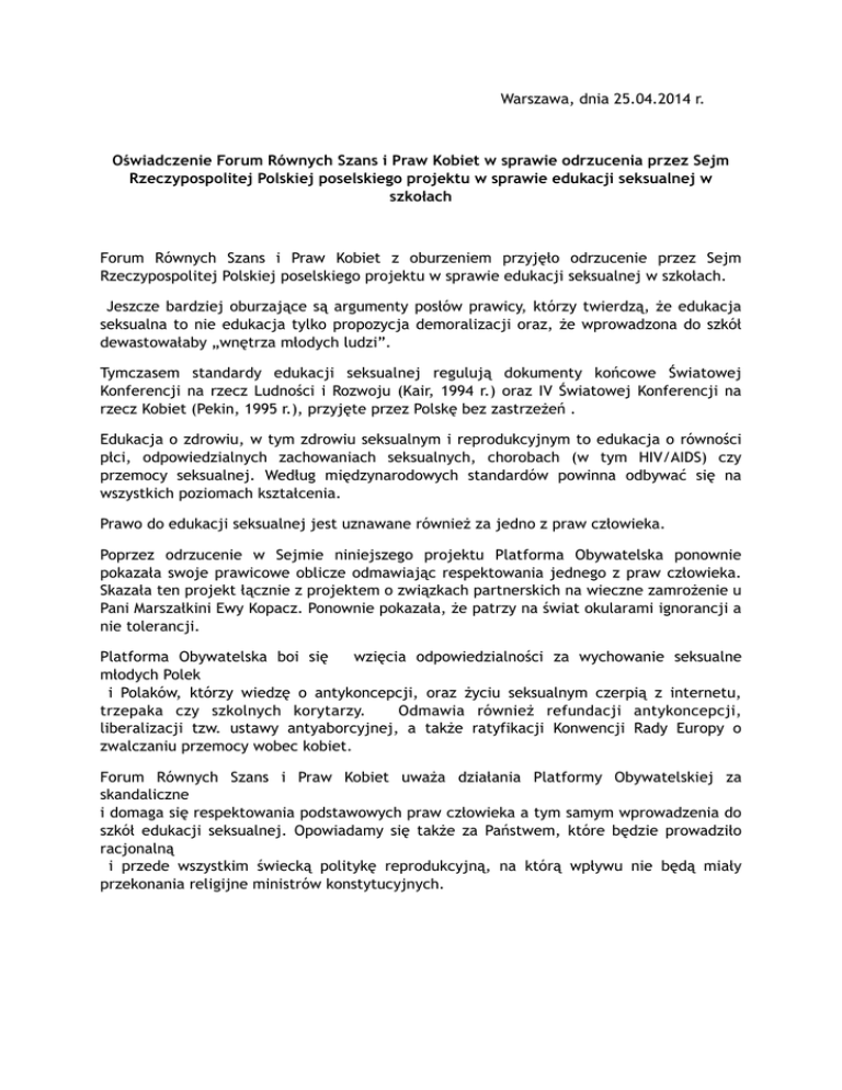 Warszawa, dnia 25.04.2014 r. ! Oświadczenie Forum Równych Szans i Praw Kobiet w sprawie odrzucenia przez Sejm Rzeczypospolitej Polskiej poselskiego projektu w sprawie edukacji seksualnej w szkołach ! Forum Równych Szans i Praw Kobiet z oburzeniem przyjęło odrzucenie przez Sejm Rzeczypospolitej Polskiej poselskiego projektu w sprawie edukacji seksualnej w szkołach. Jeszcze bardziej oburzające są argumenty posłów prawicy, którzy twierdzą, że edukacja seksualna to nie edukacja tylko propozycja demoralizacji oraz, że wprowadzona do szkół dewastowałaby „wnętrza młodych ludzi”. Tymczasem standardy edukacji seksualnej regulują dokumenty końcowe Światowej Konferencji na rzecz Ludności i Rozwoju (Kair, 1994 r.) oraz IV Światowej Konferencji na rzecz Kobiet (Pekin, 1995 r.), przyjęte przez Polskę bez zastrzeżeń . Edukacja o zdrowiu, w tym zdrowiu seksualnym i reprodukcyjnym to edukacja o równości płci, odpowiedzialnych zachowaniach seksualnych, chorobach (w tym HIV/AIDS) czy przemocy seksualnej. Według międzynarodowych standardów powinna odbywać się na wszystkich poziomach kształcenia. Prawo do edukacji seksualnej jest uznawane również za jedno z praw człowieka. Poprzez odrzucenie w Sejmie niniejszego projektu Platforma Obywatelska ponownie pokazała swoje prawicowe oblicze odmawiając respektowania jednego z praw człowieka. Skazała ten projekt łącznie z projektem o związkach partnerskich na wieczne zamrożenie u Pani Marszałkini Ewy Kopacz. Ponownie pokazała, że patrzy na świat okularami ignorancji a nie tolerancji. Platforma Obywatelska boi się wzięcia odpowiedzialności za wychowanie seksualne młodych Polek i Polaków, którzy wiedzę o antykoncepcji, oraz życiu seksualnym czerpią z internetu, trzepaka czy szkolnych korytarzy. Odmawia również refundacji antykoncepcji, liberalizacji tzw. ustawy antyaborcyjnej, a także ratyfikacji Konwencji Rady Europy o zwalczaniu przemocy wobec kobiet. Forum Równych Szans i Praw Kobiet uważa działania Platformy Obywatelskiej za skandaliczne i domaga się respektowania podstawowych praw człowieka a tym samym wprowadzenia do szkół edukacji seksualnej. Opowiadamy się także za Państwem, które będzie prowadziło racjonalną i przede wszystkim świecką politykę reprodukcyjną, na którą wpływu nie będą miały przekonania religijne ministrów konstytucyjnych. ! !