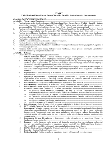 STATUT PKO Absolutnej Stopy Zwrotu Europa Wschód – Zachód – fundusz inwestycyjny zamknięty Rozdział I. POSTANOWIENIA OGÓLNE ----------------------------------------------------------------------------------------Artykuł 1. Nazwa i rodzaj Funduszu -------------------------------------------------------------------------------------------1. Fundusz inwestycyjny działa pod nazwą: „PKO Absolutnej Stopy Zwrotu Europa Wschód – Zachód – fundusz inwestycyjny zamknięty” (dalej: „Fundusz” lub „AFI”). Fundusz może używać odpowiednika nazwy w języku angielskim PKO Absolute Return Europe East – West – closed – end investment fund. --------------------2. Fundusz może używać zamiennie skróconej nazwy „PKO Absolutnej Stopy Zwrotu Europa Wschód –Zachód – fiz” oraz jej odpowiednika w języku angielskim PKO Absolute Return Europe East – West – cif. -------------3. Fundusz jest publicznym funduszem inwestycyjnym zamkniętym. Fundusz jest alternatywnym funduszem inwestycyjnym w rozumieniu Ustawy o Funduszach Inwestycyjnych. Fundusz działa zgodnie z Ustawą o Funduszach Inwestycyjnych i Statutem. ---------------------------------------------------------------------------------------4. Fundusz jest osobą prawną. ------------------------------------------------------------------------------------------------------5. Siedzibą i adresem Funduszu jest siedziba i adres Towarzystwa. ---------------------------------------------------------6. Fundusz utworzony został na czas nieograniczony. -------------------------------------------------------------------------7. Niniejszy Statut został nadany Funduszowi przez PKO Towarzystwo Funduszy Inwestycyjnych S.A. zgodnie z obowiązującym prawem. ---------------------------------------------------------------------------------------------------------8. Niniejszy Statut określa cel i zasady funkcjonowania Funduszu, a także prawa i obowiązki Uczestników Funduszu oraz zasady zarządzania Funduszem.------------------------------------------------------------------------------Artykuł 2. Definicje ---------------------------------------------------------------------------------------------------------------1. Użyte w Statucie definicje mają następujące znaczenie: ------------------------------------------------------------------------1) Aktywa Funduszu, Aktywa – mienie Funduszu obejmujące środki pieniężne, w tym z tytułu wpłat Uczestników Funduszu, prawa nabyte przez Fundusz oraz pożytki z tych praw. ----------------------------------2) Aktywny Rynek – rynek spełniający łącznie następujące kryteria: (i) instrumenty będące przedmiotem obrotu na rynku są jednorodne, (ii) zazwyczaj w każdym czasie występują zainteresowani nabywcy i sprzedawcy, (iii) ceny są podawane do publicznej wiadomości. -------------------------------------------------3) Certyfikat – certyfikaty inwestycyjne emitowane przez Fundusz będące Papierami Wartościowymi na okaziciela, nieposiadające formy dokumentu, reprezentujące jednakowe prawa majątkowe Uczestników Funduszu. ------------------------------------------------------------------------------------------------------------------4) Depozytariusz – Bank Handlowy w Warszawie S.A. z siedzibą w Warszawie, ul. Senatorska 16, 00923 Warszawa. -----------------------------------------------------------------------------------------------------------5) Dyspozycja Deponowania - dyspozycja składana jednocześnie z Zapisem, na podstawie której przydzielone przez Fundusz Certyfikaty zostaną zapisane na rachunku papierów wartościowych Inwestora lub Uczestnika albo na odpowiednim rachunku zbiorczym. -----------------------------------------6) Dzień Giełdowy – każdy dzień, w którym odbywa się regularna sesja na GPW. -----------------------------7) Dzień Roboczy – dzień roboczy w rozumieniu Ustawy o Funduszach Inwestycyjnych. --------------------8) Dzień Wyceny – dzień wyceny Aktywów Funduszu, ustalenia Wartości Aktywów Netto Funduszu i Wartości Aktywów Netto Funduszu na Certyfikat, przypadający: -----------------------------------------------a) na pierwszy Dzień Giełdowy, następujący po dniu, w którym Towarzystwo otrzymało dokumenty potwierdzające wpis Funduszu do Rejestru Funduszy Inwestycyjnych; -----------------b) na ostatni Dzień Giełdowy w kwartale kalendarzowym; --------------------------------------------------c) na 7 (słownie: siedem) dni przed rozpoczęciem przyjmowania Zapisów na Certyfikaty kolejnej emisji; --------------------------------------------------------------------------------------------------------------d) na dzień przydziału Certyfikatów kolejnej emisji; ---------------------------------------------------------e) na dzień rozpoczęcia likwidacji Funduszu. ------------------------------------------------------------------9) Dzień Wykupu – Dzień Wyceny, o którym mowa w pkt 8) lit. b) definicji „Dnia Wyceny”. --------------10) GPW – Giełda Papierów Wartościowych w Warszawie S.A. ----------------------------------------------------11) Instrumenty Pochodne – prawa majątkowe, których cena rynkowa zależy bezpośrednio lub pośrednio od ceny lub wartości Papierów Wartościowych, o których mowa w art. 3 pkt 1 lit. a) Ustawy o Obrocie Instrumentami Finansowymi, oraz inne prawa majątkowe, których cena rynkowa bezpośrednio lub pośrednio zależy od kształtowania się ceny rynkowej walut obcych lub od zmiany wysokości stóp procentowych. -------------------------------------------------------------------------------------------------------------12) Instrumenty Rynku Pieniężnego – instrumenty rynku pieniężnego w rozumieniu Ustawy o Funduszach Inwestycyjnych. -------------------------------------------------------------------------------------------13) Inwestor – osoba fizyczna, osoba prawna lub jednostka organizacyjna nieposiadająca osobowości prawnej – rezydent lub nierezyd