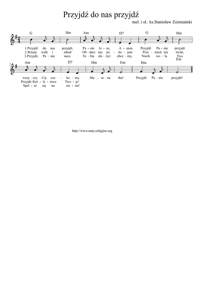 Przyjdź do nas przyjdź mel. i sł.: ks.Stanisław Zeimiański G 42 Hm 1.Przyjdź do nas 2.Wśród walk i 3.Przyjdź, Pa nie 7 Am wszy scy Przyjdź Kró Speł ni Am przyjdź, zdrad nasz, D7 Cię cze le stwo się na ka my. Two je! zie mi! D7 Pa nie Je zu, Ob darz nas po To bie słu żyć Em Hm Ma A men. ko jem chce my, ra na http://www.nuty.religijne.org tha! G Hm Przyjdź Pa nie Prze mień ten Niech wo la przyjdź świat, Twa Em Hm Przyjdź Pa nie przyjdź!