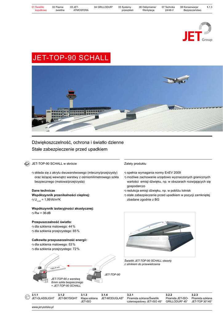 01 Świetliki kopułkowe 02 Pasma świetlne 03 JETATMOSFERA 04 GRILLODUR® 05 Systemy przeszkleń 06 Oddymianie/ Wentylacja 07 Technika 24/48-V 08 Konserwacja/ Bezpieczeństwo 1.1.3 JET-TOP-90 SCHALL Dźwiękoszczelność, ochrona i światło dzienne Stałe zabezpieczenie przed upadkiem JET-TOP-90 SCHALL w skrócie Zalety produktu s kłada się z akrylu dwuwarstwowego (mleczny/przejrzysty) oraz leżącej wewnątrz warstwy z ośmiomilimetrowego szkła bezpiecznego (matowa/przejrzysta) Dane technicze Współczynnik przenikalności cieplnej: Un,LK = 1,99 W/m²K s pełnia wymagania normy EnEV 2009 możliwe zachowanie urzędowo wyznaczonych granicznych wartości emisji dźwięku, np. w obszarach rozwijających się gospodarczo redukcja emisji dźwięku, np. w pobliżu lotnisk stałe zabezpieczenie przed upadkiem w pozycji zamkniętej zbadane zgodnie z BG Współczynnik izolacyjności akustycznej: Rw = 36 dB Przepuszczalność światła: dla szklenia matowego: 44 % dla szklenia przejrzystego: 65 % Całkowita przepuszczalność energii: dla szklenia matowego: 53 % dla szklenia przejrzystego: 72 % Świetlik JET-TOP-90 SCHALL otwarty z silnikiem do przewietrzania 7P816 mm -SG CS PV JET-TOP-90 JET-TOP-90 z warstwą 8 mm szkła bezpiecznego = JET-TOP-90 SCHALL 3.1.1 JET-GLASSLIGHT www.jet-polska.pl 3.1.2 JET-SKYSIGHT 3.1.3 Klapa szklana JET-ISO 3.1.4 JET-MODUGLAS® 3.2.1 Piramida szklana/Świetlik czterospadowy JET-ISO 45° 3.2.2 Piramida JET-ISOGRILLODUR® 45° 3.2.3 Piramida szklana JET-TOP 30°/45° 01 Świetliki kopułkowe 02 P asma świetlne 03 JETATMOSFERA 04 GRILLODUR® 05 Systemy przeszkleń 06 Oddymianie/ Wentylacja 07 Technika 24/48-V 08 Konserwacja/ Bezpieczeństwo 1.1.3 PROGRAM DOSTAW ŚWIETLIKÓW KOPUŁKOWYCH JET-TOP-90 SCHALL JET-TOP-90 SCHALL ze standardową podstawą JET typ AK JET-TOP-90 SCHALL z podstawą JET typ RAK 60 x 60 • - 60 x 90 • - 80 x 80 • - 90 x 90 • - 90 x 120 • - 100 x 100 • • 100 x 150 • • 100 x 200 • • 100 x 250 • • 120 x 120 • • 120 x 150 • • 120 x 180 • • 120 x 240 • • 120 x 270 • - 125 x 125 • • 125 x 250 • • 150 x 150 • • 150 x 180 • • 150 x 210 • • 150 x 240 • • 150 x 250 • • 150 x 270 • - 180 x 180 • • 180 x 240 • • 180 x 250 • • Obowiązuje od daty wydania aż do nowego nakładu. Stan: lipiec 2014. Za błędy w druku, pomyłki i zmiany techniczne nie ponosimy odpowiedzialności. Wymiary do zamówienia dolna szer. podstawy w świetle cm x cm • = dostępny - = niedostępny KONTAKT Z NAMI: JET Grupa Polska Sp. z o.o. · ul. Kaliska 38 · PL-62-300 Września Tel. +48 (61) 640 34 10 · Faks +48 (61) 640 34 11 www.jet-polska.pl · [email protected] DRIVEN BY DAYLIGHT