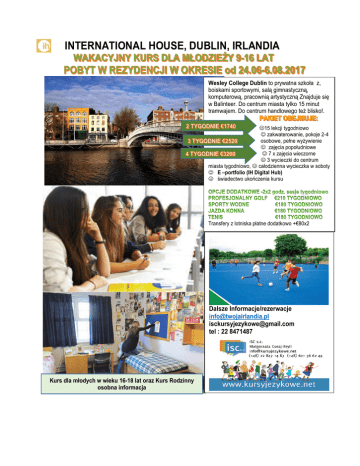 INTERNATIONAL HOUSE, DUBLIN, IRLANDIA Wesley College Dublin to prywatna szkoła z, boiskami sportowymi, salą gimnastyczną, komputerową, pracownią artystyczną Znajduje się w Balinteer. Do centrum miasta tylko 15 minut tramwajem. Do centrum handlowego też blisko!. 15 lekcji tygodniowo zakwaterowanie, pokoje 2-4 osobowe, pełne wyżywienie zajęcia popołudniowe 7 x zajęcia wieczorne 3 wycieczki do centrum miasta tygodniowo, całodzienna wycieczka w soboty E –portfolio (IH Digital Hub) świadectwo ukończenia kursu Transfery z lotniska płatne dodatkowo +€80x2 Dalsze Informacje/rezerwacje [email protected] [email protected] tel : 22 8471487 Kurs dla młodych w wieku 16-18 lat oraz Kurs Rodzinny osobna informacja