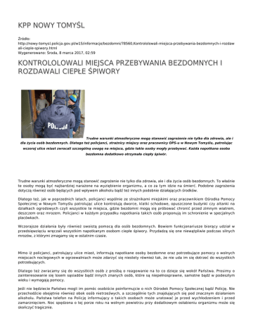 KPP NOWY TOMYŚL Źródło: http://nowy-tomysl.policja.gov.pl/w15/informacje/bezdomni/78560,Kontrololowali-miejsca-przebywania-bezdomnych-i-rozdaw ali-cieple-spiwory.html Wygenerowano: Środa, 8 marca 2017, 02:59 KONTROLOLOWALI MIEJSCA PRZEBYWANIA BEZDOMNYCH I ROZDAWALI CIEPŁE ŚPIWORY Trudne warunki atmosferyczne mogą stanowić zagrożenie nie tylko dla zdrowia, ale i dla życia osób bezdomnych. Dlatego też policjanci, strażnicy miejscy oraz pracownicy OPS-u w Nowym Tomyślu, patrolując wczoraj ulice miast zwracali szczególną uwagę na miejsca, gdzie takie osoby mogły przebywać. Każda napotkana osoba bezdomna dodatkowo otrzymała ciepły śpiwór. Trudne warunki atmosferyczne mogą stanowić zagrożenie nie tylko dla zdrowia, ale i dla życia osób bezdomnych. To właśnie te osoby mogą być najbardziej narażone na wyziębienie organizmu, a co za tym idzie na śmierć. Podobne zagrożenia dotyczą również osób będących pod wpływem alkoholu bądź też innych podobnie działających środków. Dlatego też, jak w poprzednich latach, policjanci wspólnie ze strażnikami miejskimi oraz pracownikiem Ośrodka Pomocy Społecznej w Nowym Tomyślu patrolując ulice kontrolują dworce, klatki schodowe, opuszczone budynki czy altanki na działkach ogrodowych czyli wszystkie te miejsca, gdzie bezdomni mogą się próbować chronić przed zimnym wiatrem, deszczem oraz mrozem. Policjanci w każdym przypadku napotkania takich osób proponują im schronienie w specjalnych placówkach. Wczorajsze działania były również swoistą pomocą dla osób bezdomnych. Bowiem funkcjonariusze biorący udział w przedsięwzięciu wręczali wszystkim napotkanym osobom ciepłe śpiwory. Przydadzą się one niewątpliwie podczas silnych mrozów, z którymi zmagamy się w ostatnim czasie. Mimo iż policjanci, patrolujący ulice miast, informują napotkane osoby bezdomne oraz potrzebujące pomocy o wolnych miejscach noclegowych w ogrzewalniach może zdarzyć się niestety również tak, że nie uda im się dotrzeć do wszystkich potrzebujących. Dlatego też zwracamy się do wszystkich osób z prośbą o reagowanie na to co dzieje się wokół Państwa. Prosimy o zainteresowanie się losem sąsiadów bądź innych znanych osób, które są niepełnosprawne, samotne bądź w podeszłym wieku i wymagają pomocy. Jeśli nie będziecie Państwo mogli im pomóc osobiście poinformujcie o nich Ośrodek Pomocy Społecznej bądź Policję. Nie przechodźcie obojętnie również obok osób nietrzeźwych, a szczególnie tych znajdujących się pod znacznym działaniem alkoholu. Państwa telefon na Policję informujący o takich osobach może uratować je przed wychłodzeniem i przed zamarznięciem. Noc spędzona o tej porze roku na wolnym powietrzu przy dodatkowym osłabieniu organizmu może się skończyć tragicznie. Wszystkie zgłoszenia można kierować pod alarmowe numery Policji 997 lub 112. zima policja radzi/bezdomni/2016 Ocena: 0/5 (0) Tweetnij