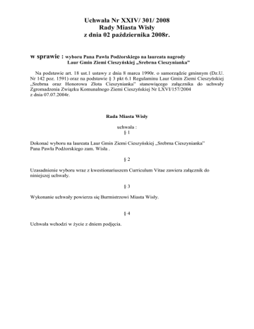 Uchwała Nr XXIV/ 301/ 2008 Rady Miasta Wisły z dnia 02 października 2008r. w sprawie : wyboru Pana Pawła PodŜorskiego na laureata nagrody Laur Gmin Ziemi Cieszyńskiej „Srebrna Cieszynianka” Na podstawie art. 18 ust.1 ustawy z dnia 8 marca 1990r. o samorządzie gminnym (Dz.U. Nr 142 poz. 1591) oraz na podstawie § 3 pkt 6.1 Regulaminu Laur Gmin Ziemi Cieszyńskiej „Srebrna oraz Honorowa Złota Cieszynianka” stanowiącego załącznika do uchwały Zgromadzenia Związku Komunalnego Ziemi Cieszyńskiej Nr LXVI/157/2004 z dnia 07.07.2004r. Rada Miasta Wisły uchwala : §1 Dokonać wyboru na laureata Laur Gmin Ziemi Cieszyńskiej „Srebrna Cieszynianka” Pana Pawła PodŜorskiego zam. Wisła . §2 Uzasadnienie wyboru wraz z kwestionariuszem Curriculum Vitae zawiera załącznik do niniejszej uchwały. §3 Wykonanie uchwały powierza się Burmistrzowi Miasta Wisły. §4 Uchwała wchodzi w Ŝycie z dniem podjęcia. Załącznik do Uchwały Nr XXIV/ 301/ 2008 Rady Miasta Wisły z dnia 02 października 2008 r. „Laur Gmin Ziemi Cieszyńskiej” 1. Imię Nazwisko – Paweł PodŜorski 2. Adres – ul. Dziechcinka 20, 43-460 Wisła 3. Telefon - 0338552622 4. Data urodzenia – 29 styczeń 1921 r. 5. Miejsce urodzenia- Wisła 6. Stan cywilny – wdowiec II. Aktywność zawodowa 1. Wykształcenie – zawodowe 2. Zawód – mechanik-kierowca 3. Miejsce pracy – emeryt III. Uzasadnienie wyboru Paweł PodŜorski w roku 1928 miał zaszczyt, jako uczeń Szkoły Podstawowej w Wiśle Centrum, witać Prezydenta RP Ignacego Mościckiego, który przybył do Wisły. - Po wybuchu II wojny światowej w roku 1939 został wywieziony na roboty przymusowe do Niemiec. Został osadzony w obozie Braunschweig, gdzie przebywał do roku 1941. Następnie przewieziony do Verdun we Francji a później do Włoch, gdzie zajmował się budową bunkrów. W 1944 roku wpadł w ręce aliantów i przyznając się do polskiej narodowości uniknął rozstrzelania. Został osadzony w polskim obozie przejściowym w Bari a następnie dobrowolnie wstąpił i został przyjety do Wojska polskiego pod Dowództwem Brytyjskim. SłuŜył 15 Pułku Ułanów Poznańskich, 14-tej Wielkopolskiej Brygadzie Pancernej wchodzącej w skład 2 Korpusu Polski pod dowództwem gen. Władysława Andersa. Korpus składał się z dwóch Dywizji Piechoty, jednej Brygady Pancernej i Grupy Artylerii. Paweł PodŜorski trafił do Brygady Pancernej, jako mechanik czołgowy. W maju 1944 roku z 2 Korpusem Polskim brał czynny udział w Kampanii Włoskiej i słynnej bitwie o Monte Cassino, otwierającą drogę do Rzymu wojskom aliantów. Następnie Korpus walczył w bitwie o Ankonę, o ,,linię Gotów'' i w Apeninach Emiliańskich. Następnie został Paweł PodŜorski przerzucony do Egiptu, gdzie czekał na rozkaz walki na froncie wschodnim z Japonią. Po zakończeniu wojny w 1945 roku wiślanina przerzucono do Anglii, gdzie głównym zadaniem Polaków było rozminowywanie wybrzeŜy kanału La Manche. W 1947 roku zostaje zaszczytnie zwolniony ze słuŜby w wojsku i wraca do rodzinnej Wisły. - Jako członek chóru przy Kościele Ewangelicko-Augsburskim, przekształconego w Wiślańską Grupę Regionalną brał udział w roku 1937 w legendarnym Święcie Gór. Jest to impuls do kultywowania tradycji regionalnych i współtworzenia w 1950 roku legendarnego Zespołu Regionalnego "Wisła", którego przez kilka lat jest członkiem. Paweł PodŜorski przez wiele lat aktywnie uczestniczył w organizacji Tygodnia Kultury Beskidzkiej (od 1964 roku), najstarszej i największej imprezy folklorystycznej w Europie. Przez 20 lat jest aktywny członek Rady Parafialnej Kościoła Ewangelicko-Augsburskiego w Wiśle. Za jego kadencji budowano kaplice i kościoły w Jaworniku, Malince, Czarnym i Głębcach. - W Wiśle Paweł PodŜorski przez wiele lat aktywnie działał w Ochotniczej StraŜy PoŜarnej. W roku 1946 wstąpił do jednostki w Wiśle Centrum, by juŜ od roku 1947 do roku 1979 pełnić funkcję naczelnika OSP Wisła Centrum. Po odbyciu kursów doszkalających przez dwa lata szkolił młodych adeptów sztuki poŜarniczej w Ośrodku Szkolenia PoŜarniczego w Wiśle. W późniejszych latach był komendantem i prezesem Zarządu Miejskiego OSP w Wiśle, przyczyniając się do rozbudowy nowych straŜnic, wyposaŜenia i modernizacji sprzętu i bazy samochodowej wiślańskiej straŜy poŜarnej. Jako radny kilku kadencji w Miejskiej Radzie Narodowej dba o bezpieczeństwo i ochronę przeciwpoŜarową i przeciwpowodziową miasta. Przez lata popularyzował wiedzę poŜarniczą, poprzez organizację konkursów dla młodzieŜy i zawodów sportowo-poŜarniczych. Jako dowódca wiślańskiej straŜy bierze udział w licznych akcjach gaśniczych (m.in. gaszeniu Rafinerii w CzechowicachDziedzicach), a takŜe pomaga w zabezpieczaniu imprez kulturalnych, sportowych i świąt narodowych, które odbywały się w Wiśle. Był członkiem władz wojewódzkich OSP. Za swoją społeczną działalność w straŜy poŜarnej został uhonorowany Złotą Odznaką „Wzorowy StraŜak” za wysługę 50 lat w poŜarnictwie i Złotym KrzyŜem Zasługi Ochotniczych StraŜy PoŜarnych Rzeczpospolitej Polskiej. - W latach 1952-1980 działał w Kółkach Rolniczych na terenie Wisły i okolic. - Od roku 1980 naleŜy do Miejskiego Koła Związku Bojowników o Wolność i Demokrację przekształconego później w Związek Kombatantów Rzeczpospolitej Polskiej i Byłych Więźniów Politycznych. Pełnił w nim funkcje skarbnika, z której w roku 2008 z powodów zdrowotnych musiał zrezygnować. IV. Oświadczenie kandydata: Niniejszym wyraŜam zgodę na przetwarzanie przez Związek Komunalny Ziemi Cieszyńskiej w Cieszynie moich danych, w tym danych osobowych zawartych w „śyciorysie kandydata” zgodnie z zasadami zawartymi w „Regulaminie przyznawania Złotej, Srebrnej i Honorowej Cieszynianki”, stanowiącym załącznik do Uchwały Nr LXVI/157/2004 z dnia 07.07.2004r. Zgromadzenia Związku Komunalneg