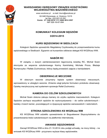 WARSZAWSKI OKRĘGOWY ZWIĄZEK KOSZYKÓWKI WOJEWÓDZTWA MAZOWIECKIEGO www.wozkosz.pl e-mail: [email protected] 02-548 Warszawa, ul. Grażyny 13/15 tel./fax. (22) 621-91-62; Konto: 27 1240 6218 1111 0000 4614 2557 NIP 526-16-67-094 KOMUNIKAT KOLEGIUM SĘDZIÓW 3/2014-2015 KURS SĘDZIOWSKI W SIEDLCACH Kolegium Sędziów upoważniło Magdalenę Czyżkowską do przeprowadzenia kursu sędziowskiego w Siedlcach. Egzamin od kursantów odbierze delegat KS WOZKosz WM. NABÓR RC W związku z dużym zainteresowaniem tegoroczną ścieżką RC, Michał Sosin skorzysta ze wsparcia szkoleniowego Kariny Kamińskiej, Michała Proca, Błażeja Rymarczyka i Rafała Zuchowicza, którzy będą prowadzić zajęcia z kandydatami. OBSERWACJE MECZOWE W obecnym sezonie utrzymany będzie system obserwacji meczowych, wprowadzony w ubiegłym sezonie. Zmianie uległ jedynie formularz protokołu obserwacji. Opiekę merytoryczną nad systemem sprawuje Rafał Zuchowicz. KAMERA DO CELÓW SZKOLENIOWYCH Michał Sosin dokona zakupu kamery do użytku sędziów mazowieckich. Kolegium Sędziów zachęca wszystkich sędziów do wykorzystywania – do celów szkoleniowych każdej z trzech kamer, pozostających w dyspozycji sędziów warszawskich i radomskich. STRONA SZKOLENIOWA KS WOZKosz WM KS WOZKosz WM udzieliło upoważnienia dr Bogusławowi Słupczyńskiemu do prezentowania treści szkoleniowych na platformie internetowej. AWANSE SĘDZIOWSKIE Zarząd WOZKosz WM w dniu 21.10.2014 roku podjął uchwałę, na mocy której – na wniosek KS WOZKosz WM - przyznano wyższe klasy sędziowskie. I klasę sędziowską otrzymują: Marcin Bielak, Krzysztof Kulma, Agnieszka Orzechowska oraz Justyna Wójcik. GRATULACJE!!! Wnioski o nadanie II klasy sędziowskiej zostaną przedstawione na kolejnym posiedzeniu Zarządu WOZKosz WM. W imieniu Kolegium Przewodniczący KS WOZKosz WM /-/ Jacek RZESZOTARSKI