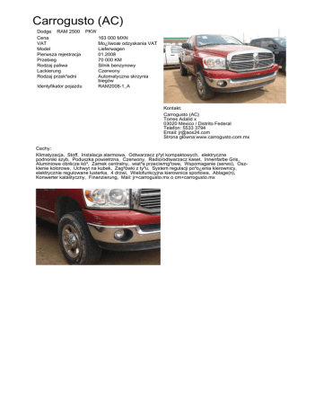 Carrogusto (AC) Dodge RAM 2500 PKW Cena 163 000 MXN VAT Mo¿liwoæ odzyskania VAT Model Lieferwagen Pierwsza rejestracja 01.2008 Przebieg 70 000 KM Rodzaj paliwa Silnik benzynowy Lackierung Czerwony Rodzaj przek³adni Automatyczna skrzynia biegów Identyfikator pojazdu RAM2008-1_A Kontakt: Carrogusto (AC) Torres Adalid x 03020 Mexico / Distrito Federal Telefon: 5533 3794 Email: [email protected] Strona główna:www.carrogusto.com.mx Cechy: Klimatyzacja, Stoff, Instalacja alarmowa, Odtwarzacz p³yt kompaktowych, elektryczne podnoniki szyb, Poduszka powietrzna, Czerwony, Radio/odtwarzacz kaset, Innenfarbe Gris, Aluminiowe obrêcze kó³, Zamek centralny, wiat³a przeciwmg³owe, Wspomaganie (serwo), Oszklenie kolorowe, Uchwyt na kubek, Zag³ówki z ty³u, System regulacji po³o¿enia kierownicy, elektrycznie regulowane lusterka, 4 drzwi, Wielofunkcyjna kierownica sportowa, Ablage(n), Konwerter katalityczny, Finanzierung, Mail: jr+carrogusto.mx o cm+carrogusto.mx