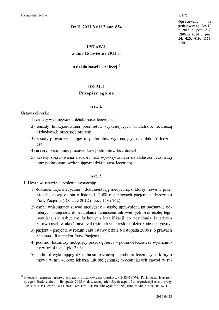 ©Kancelaria Sejmu s. 1/73 Opr acowano na podstawie: t.j. Dz. U. z 2013 r . poz. 217, 1290, z 2014 r . poz. 24, 423, 619, 1138, 1146. Dz.U. 2011 Nr 112 poz. 654 USTAWA z dnia 15 kwietnia 2011 r. o działalności leczniczej 1) DZIAŁ I Przepisy ogólne Art. 1. Ustawa określa: 1) zasady wykonywania działalności leczniczej; 2) zasady funkcjonowania podmiotów wykonujących działalność leczniczą niebędących przedsiębiorcami; 3) zasady prowadzenia rejestru podmiotów wykonujących działalność leczniczą; 4) normy czasu pracy pracowników podmiotów leczniczych; 5) zasady sprawowania nadzoru nad wykonywaniem działalności leczniczej oraz podmiotami wykonującymi działalność leczniczą. Art. 2. 1. Użyte w ustawie określenia oznaczają: 1) dokumentacja medyczna – dokumentację medyczną, o której mowa w przepisach ustawy z dnia 6 listopada 2008 r. o prawach pacjenta i Rzeczniku Praw Pacjenta (Dz. U. z 2012 r. poz. 159 i 742); 2) osoba wykonująca zawód medyczny – osobę uprawnioną na podstawie odrębnych przepisów do udzielania świadczeń zdrowotnych oraz osobę legitymującą się nabyciem fachowych kwalifikacji do udzielania świadczeń zdrowotnych w określonym zakresie lub w określonej dziedzinie medycyny; 3) pacjent – pacjenta w rozumieniu ustawy z dnia 6 listopada 2008 r. o prawach pacjenta i Rzeczniku Praw Pacjenta; 4) podmiot leczniczy niebędący przedsiębiorcą – podmiot leczniczy wymieniony w art. 4 ust. 1 pkt 2 i 3; 5) podmiot wykonujący działalność leczniczą – podmiot leczniczy, o którym mowa w art. 4, oraz lekarza lub pielęgniarkę wykonujących zawód w ra- 1) Przepisy niniejszej ustawy wdrażają postanowienia dyrektywy 2003/88/WE Parlamentu Europejskiego i Rady z dnia 4 listopada 2003 r. dotyczącej niektórych aspektów organizacji czasu pracy (Dz. Urz. UE L 299 z 18.11.2003; Dz. Urz. UE Polskie wydanie specjalne, rozdz. 5, t. 4, str. 381). 2014-09-23 ©Kancelaria Sejmu s. 2/73 mach działalności leczniczej jako praktykę zawodową, o której mowa w art. 5; 6) podmiot tworzący – podmiot albo organ, który utworzył podmiot leczniczy w formie samodzielnego publicznego zakładu opieki zdrowotnej albo jednostki budżetowej; 7) promocja zdrowia – działania umożliwiające poszczególnym osobom i społeczności zwiększenie kontroli nad czynnikami warunkującymi stan zdrowia i przez to jego poprawę, promowanie zdrowego stylu życia oraz środowiskowych i indywidualnych czynników sprzyjających zdrowiu; 8) przedsiębiorstwo – zespół składników majątkowych, za pomocą którego podmiot leczniczy wykonuje określony rodzaj działalności leczniczej; 9) szpital – przedsiębiorstwo podmiotu leczniczego, w którym podmiot ten wykonuje działalność leczniczą w rodzaju świadczenia szpitalne; 10) świadczenie zdrowotne – działania służące zachowaniu, ratowaniu, przywracaniu lub poprawie zdrowia oraz inne działania medyczne wynikające z procesu leczenia lub przepisów odrębnych regulujących zasady ich wykonywania; 11) świadczenie szpitalne – wykonywane całą dobę kompleksowe świadczenia zdrowotne polegające na diagnozowaniu, leczeniu, pielęgnacji i rehabilitacji, które nie mogą być realizowane w ramach innych stacjonarnych i całodobowych świadczeń zdrowotnych lub ambulatoryjnych świadczeń zdrowotnych; świadczeniami szpitalnymi są także świadczenia udzielane z zamiarem zakończenia ich udzielania w okresie nieprzekraczającym 24 godzin; 12) stacjonarne i całodobowe świadczenie zdrowotne inne niż świadczenie szpitalne – świadczenia opiekuńcze, pielęgnacyjne, paliatywne, hospicyjne, świadczenia z zakresu opieki długoterminowej, rehabilitacji leczniczej, leczenia uzależnień, psychiatrycznej opieki zdrowotnej oraz lecznictwa uzdrowiskowego, udzielane pacjentom, których stan zdrowia wymaga udzielania całodobowych lub całodziennych świadczeń zdrowotnych w odpowiednio urządzonych, stałych pomieszczeniach; 13) uczelnia medyczna – publiczną uczelnię medyczną albo publiczną uczelnię prowadzącą działalność dydaktyczną i badawczą w dziedzinie nauk medycznych oraz Centrum Medyczne Kształcenia Podyplomowego. 2. Ilekroć w ustawie jest mowa o: 1) kierowniku bez bliższego określenia – rozumie się przez to także zarząd spółki kapitałowej, a w przypadku innych podmiotów wykonujących działalność leczniczą – osobę uprawnioną do kierowania tymi podmiotami i ich reprezentowania na zewnątrz, jeżeli przepisy ustawy nie stanowią inaczej; 2) działalności leczniczej w rodzaju stacjonarne i całodobowe świadczenia zdrowotne bez bliższego określenia – rozumie się przez to działalność leczniczą w rodzaju świadczenia szpitalne, jak i działalność leczniczą w rodzaju stacjonarne i całodobowe świadczenia zdrowotne inne niż szpitalne; 3) pielęgniarce – rozumie się przez to także położną; 4) lekarzu – rozumie się przez to także lekarza dentystę. 2014-09-23 ©Kancelaria Sejmu s. 3/73 3. Przedsiębiorstwo podmiotu leczniczego jest jednostką lokalną w rozumieniu przepisów o statystyce publicznej, dla której nie sporządza się odrębnego bilansu, chyba że podmiot leczniczy postanowi inaczej w regulaminie organizacyjnym, o którym mowa w art. 24. Art. 3. 1. Działalność lecznicza polega na udzielaniu świadczeń zdrowotnych. 2. Działalność lecznicza może również polegać na: 1) promocji zdrowia lub 2) realizacji zadań dydaktycznych i badawczych w powiązaniu z udzielaniem świadczeń zdrowotnych i promocją zdrowia, w tym wdrażaniem nowych technologii medycznych oraz metod leczenia. 3. Podmiot wykonujący działalność leczniczą może uczestniczyć, a podmiot wykonujący działalność leczniczą w zakresie, o którym mowa w ust. 2 pkt 2, uczestniczy w przygotowywaniu osób do wykonywania zawodu medycznego i kształceniu osób wykonujących zawód medyczny na zasadach określonych w odrębnych przepisach regulujących kształcenie tyc