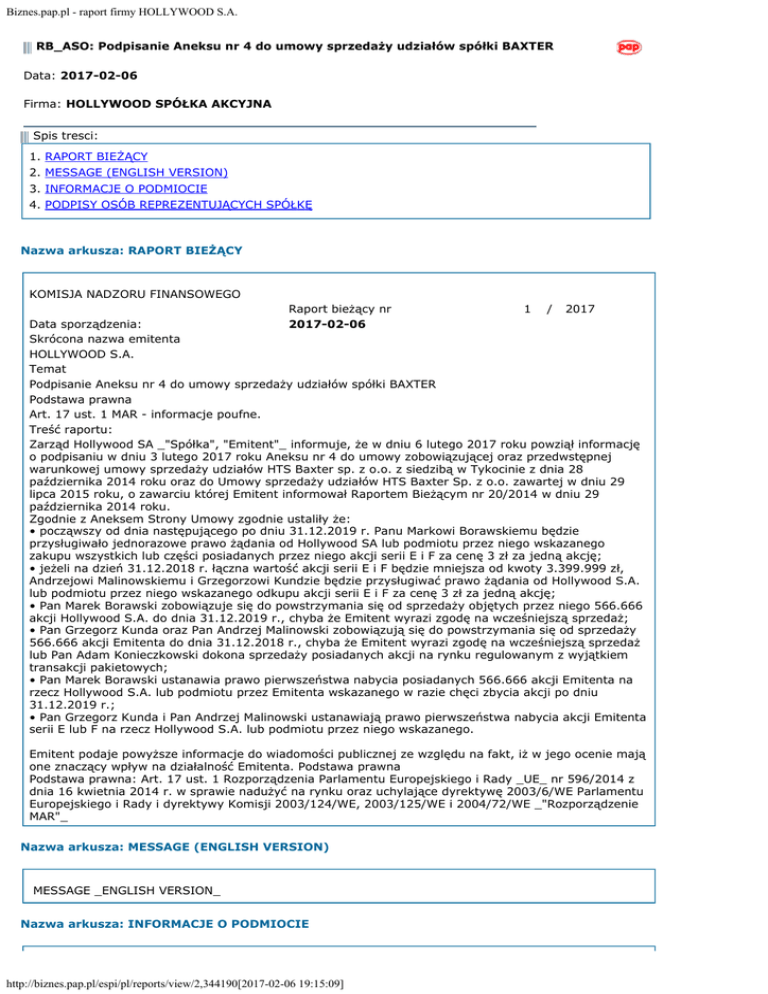 Biznes.pap.pl - raport firmy HOLLYWOOD S.A. RB_ASO: Podpisanie Aneksu nr 4 do umowy sprzedaży udziałów spółki BAXTER Data: 2017-02-06 Firma: HOLLYWOOD SPÓŁKA AKCYJNA Spis tresci: 1. 2. 3. 4. RAPORT BIEŻĄCY MESSAGE (ENGLISH VERSION) INFORMACJE O PODMIOCIE PODPISY OSÓB REPREZENTUJĄCYCH SPÓŁKĘ Nazwa arkusza: RAPORT BIEŻĄCY KOMISJA NADZORU FINANSOWEGO Raport bieżący nr 1 / 2017 Data sporządzenia: 2017-02-06 Skrócona nazwa emitenta HOLLYWOOD S.A. Temat Podpisanie Aneksu nr 4 do umowy sprzedaży udziałów spółki BAXTER Podstawa prawna Art. 17 ust. 1 MAR - informacje poufne. Treść raportu: Zarząd Hollywood SA _"Spółka", "Emitent"_ informuje, że w dniu 6 lutego 2017 roku powziął informację o podpisaniu w dniu 3 lutego 2017 roku Aneksu nr 4 do umowy zobowiązującej oraz przedwstępnej warunkowej umowy sprzedaży udziałów HTS Baxter sp. z o.o. z siedzibą w Tykocinie z dnia 28 października 2014 roku oraz do Umowy sprzedaży udziałów HTS Baxter Sp. z o.o. zawartej w dniu 29 lipca 2015 roku, o zawarciu której Emitent informował Raportem Bieżącym nr 20/2014 w dniu 29 października 2014 roku. Zgodnie z Aneksem Strony Umowy zgodnie ustaliły że: •począwszy od dnia następującego po dniu 31.12.2019 r. Panu Markowi Borawskiemu będzie przysługiwało jednorazowe prawo żądania od Hollywood SA lub podmiotu przez niego wskazanego zakupu wszystkich lub części posiadanych przez niego akcji serii E i F za cenę 3 zł za jedną akcję; •jeżeli na dzień 31.12.2018 r. łączna wartość akcji serii E i F będzie mniejsza od kwoty 3.399.999 zł, Andrzejowi Malinowskiemu i Grzegorzowi Kundzie będzie przysługiwać prawo żądania od Hollywood S.A. lub podmiotu przez niego wskazanego odkupu akcji serii E i F za cenę 3 zł za jedną akcję; •Pan Marek Borawski zobowiązuje się do powstrzymania się od sprzedaży objętych przez niego 566.666 akcji Hollywood S.A. do dnia 31.12.2019 r., chyba że Emitent wyrazi zgodę na wcześniejszą sprzedaż; •Pan Grzegorz Kunda oraz Pan Andrzej Malinowski zobowiązują się do powstrzymania się od sprzedaży 566.666 akcji Emitenta do dnia 31.12.2018 r., chyba że Emitent wyrazi zgodę na wcześniejszą sprzedaż lub Pan Adam Konieczkowski dokona sprzedaży posiadanych akcji na rynku regulowanym z wyjątkiem transakcji pakietowych; •Pan Marek Borawski ustanawia prawo pierwszeństwa nabycia posiadanych 566.666 akcji Emitenta na rzecz Hollywood S.A. lub podmiotu przez Emitenta wskazanego w razie chęci zbycia akcji po dniu 31.12.2019 r.; •Pan Grzegorz Kunda i Pan Andrzej Malinowski ustanawiają prawo pierwszeństwa nabycia akcji Emitenta serii E lub F na rzecz Hollywood S.A. lub podmiotu przez niego wskazanego. Emitent podaje powyższe informacje do wiadomości publicznej ze względu na fakt, iż w jego ocenie mają one znaczący wpływ na działalność Emitenta. Podstawa prawna Podstawa prawna: Art. 17 ust. 1 Rozporządzenia Parlamentu Europejskiego i Rady _UE_ nr 596/2014 z dnia 16 kwietnia 2014 r. w sprawie nadużyć na rynku oraz uchylające dyrektywę 2003/6/WE Parlamentu Europejskiego i Rady i dyrektywy Komisji 2003/124/WE, 2003/125/WE i 2004/72/WE _"Rozporządzenie MAR"_ Nazwa arkusza: MESSAGE (ENGLISH VERSION) MESSAGE _ENGLISH VERSION_ Nazwa arkusza: INFORMACJE O PODMIOCIE http://biznes.pap.pl/espi/pl/reports/view/2,344190[2017-02-06 19:15:09] Biznes.pap.pl - raport firmy HOLLYWOOD S.A. HOLLYWOOD SPÓŁKA AKCYJNA _pełna nazwa emitenta_ HOLLYWOOD S.A. _skrócona nazwa emitenta_ 09-200 _kod pocztowy_ Bojanowska _ulica_ +48 24 275 81 29 _telefon_ _e-mail_ 7761698650 _NIP_ Usługi inne _uin_ _sektor wg. klasyfikacji GPW w W-wie_ Sierpc _miejscowość_ 2a _numer_ +48 24 275 81 29 _fax_ _www_ 146351367 _REGON_ Nazwa arkusza: PODPISY OSÓB REPREZENTUJĄCYCH SPÓŁKĘ PODPISY OSÓB REPREZENTUJĄCYCH SPÓŁKĘ Data Imię i Nazwisko 2017-02-06 Adam Andrzej Konieczkowski Identyfikator raportu Nazwa raportu Symbol raportu Nazwa emitenta Symbol Emitenta Tytul Sektor Kod Miasto Ulica Nr Tel. Fax e-mail NIP REGON Data sporzadzenia Rok biezacy Numer adres www Stanowisko/Funkcja Prezes Zarządu Podpis g3rnkvrut1 RB_ASO RB_ASO HOLLYWOOD SPÓŁKA AKCYJNA HOLLYWOOD S.A. Podpisanie Aneksu nr 4 do umowy sprzedaży udziałów spółki BAXTER Usługi inne (uin) 09-200 Sierpc Bojanowska 2a +48 24 275 81 29 +48 24 275 81 29 7761698650 146351367 2017-02-06 2017 1 Serwis Ekonomiczny Polskiej Agencji Prasowej SA http://biznes.pap.pl/espi/pl/reports/view/2,344190[2017-02-06 19:15:09] 2017 Copyright PAP SA - Wszelkie prawa zastrzezone.