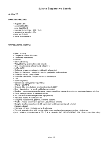 Szkoła Żeglarstwa Szekla Antila 26 DANE TECHNICZNE: długość 7,8m szerokość 2,88m pow. żagli 30m2 zanurzenie min/max - 0,38 / 1,45 wysokość w kabinie 1,85m ilość koji 8 (6+2) Silniki Yamaha 6KM WYPOSAŻENIE JACHTU: Miecz uchylny Zamykana kabina dziobowa Zabudowa mahoniowa lodówka Silnik zaburtowy Wszystkie liny sprowadzone do kokpitu Grot z możliwością refowania ( 2 refbanty ) LAZY JACK Rolfok na sztywnym sztagu ( możliwość refowania ) Rama do kładzenia i stawiania masztu , podpórka podmasztowa Podwójny reling , pasy rufowe Drabinka zaburtowa , stopień na koszu dziobowym Tent Stolik kokpitowy Oświetlenie elektryczne ( 6 punktów ) RADIO / CD/MP3 Gniazdo 12v, przedłużacz, prostownik,gniazdo 220V Koje : 4 podwójne ( w tym 2 rozkładane w mesie) Kambuz : kuchenka dwupalnikowa ze zlewozmywakiem, naczynia kuchenne, zastawa stołowa, sztućce Pełna butla gazowa + 5l paliwa do silnika WC chemiczne w osobnej kabinie (opcjonalnie) Instalacja wodna w kambuzie i wc Skrzynka narzędziowa, gaśnica, siekiera, saperka Wiadro , miska, szczotka do pokładu , szufelka ze zmiotką Komplet środków ratunkowych ( 8 kamizelek w różnych rozmiarach + koło ) 2 pagaje , bosak 2 kotwice z linami , 3 długie cumy, 4 odbijacze Zbiornik na wodę pitna (40l) pompa elektryczna, woda zaburtowa pompa elek. ciśnieniowa jacht i silnik są ubezpieczone w PZU S.A. w zakresie : OC, JACHT CASCO, NW i Rzeczy osobiste załogi strona 1/2 strona 2/2 Powered by TCPDF (www.tcpdf.org)