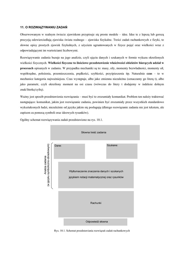 11. O ROZWIĄZYWANIU ZADAŃ Obserwowanym w realnym świecie zjawiskom przypisuje się proste modele – idee. Idee te z lepszą lub gorszą precyzją odzwierciedlają zjawiska świata realnego – zjawiska fizykalne. Treści zadań rachunkowych z fizyki, to słowne opisy prostych zjawisk fizykalnych, z użyciem ugruntowanych w fizyce pojęć oraz wielkości wraz z odpowiadającymi im wartościami liczbowymi. Rozwiązywanie zadania bazuje na jego analizie, czyli ujęciu danych i szukanych w formie wykazu określonych wielkości fizycznych. Wielkości fizyczne to ilościowe przedstawienie właściwości obiektów biorących udział w procesach opisanych w zadaniu. W przypadku mechaniki są to: masy, siły, momenty bezwładności, momenty sił, współrzędne, położenia, przemieszczenia, prędkości, szybkości, przyśpieszenia itp. Naturalnie czas – to w mechanice kategoria najważniejsza. Czas występuje, albo jako zmienna niezależna (oznaczamy go literą t), albo jako parametr, czyli określony moment na osi czasu (wówczas do litery t dodajemy w indeksie dolnym znak/literkę/cyfrę). Ważny jest sposób przedstawienia rozwiązania – musi być to zrozumiały komunikat. Problem ten należy traktować następująco: komunikat, jakim jest rozwiązanie zadania, powinien być zrozumiały przez wszystkich standardowo wykształconych ludzi, niezależnie od języka jakim się posługują (dlatego rozwiązanie zadania nie jest tekstem, ale zapisem za pomocą symboli oraz ideowych rysunków). Ogólny schemat rozwiązywania zadań przedstawiono na rys. 10.1. Rys. 10.1. Schemat przedstawiania rozwiązań zadań rachunkowych Z. Otremba Fizyka na starcie – O rozwiązywaniu zadań Zadanie najlepiej rozwiązywać na liczbach ogólnych. Wskazane jest, aby na początku uporządkować jednostki w zestawie danych. Najlepiej, jeżeli wszystkie dane podajemy w układzie SI – wówczas łatwiej przeprowadzić rachunek jednostek. Po rozwiązaniu zadania, jego wynik należy zweryfikować jakościowo, to znaczy zbadać czy jest zgodny z intuicją. Druga weryfikacja – to przeprowadzenie rachunku na jednostkach. Otóż rozwiązanie byłoby na pewno wadliwe, gdyby jednostka wyniku nie zgadzała się z jednostką wyliczanej wielkości. Poniżej przedstawione są przykłady rozwiązywania zadań (kilka zadań z mechaniki i po jednym z każdego z pozostałych działów. Zadania z mechaniki Zadanie 1a. Z dwóch miejscowości położonych w odległości 70 km ruszyli w swoim kierunku motocykliści. Jeden z szybkością 50 km/h, drugi 70 km/h. Kiedy i gdzie spotkali się? Rozwiązanie Idea zjawiska: Jest to prostoliniowy, jednostajny ruch dwóch punktów materialnych, z różnymi prędkościami z przeciwnymi zwrotami, z różnymi współrzędnymi początkowymi. Motocyklistę o większej szybkości oznaczmy literą A (jako że wyrusza z miejscowości A), motocyklistę wolniejszego - B (wyrusza z miejscowości B). Oś współrzędnych skierujmy od A do B, a jej początek obierzmy w punkcie A (czytelnik dla ugruntowania umiejętności może skierować oś w drugą stronę, a współrzędną początkową umieścić w innym miejscu – i przekona się, że otrzyma ten sam wynik). Dane: Szukane: vA = 70 km/h dA = ? vB = 50 km/h ts = ? d = 70 km Przebiegi na powyższym wykresie odzwierciedlają graficznie znajdujący się poniżej układ funkcji x A (t) = v A t xB (t) = d − v B t Po wstawieniu do powyższych funkcji par wartości zmiennych (ts, d) otrzymamy następujący układ równań (jego graficznym odzwierciedleniem jest punkt przecięcia przebiegów na powyższym wykresie). ds = v A t s ds = d − v B t s z którego wyliczamy ds i ts Z. Otremba Fizyka na starcie – O rozwiązywaniu zadań Zadanie 1b. Punkt porusza się ruchem jednostajnie zmiennym. Współrzędna tego punktu jako funkcja czasu przedstawiona jest na poniższym rysunku. Przedstawić wykresy zależności prędkości i przyspieszenia tego punktu od czasu. Rozwiązanie Jak widzimy na powyższym rysunku, punkt przez czas 1 sekundy porusza się do przodu, zatrzymuje na moment i zaczyna rozpędzać w przeciwnym kierunku. Po trzech sekundach mija początek osi i rozpędza się dalszym ciągu po ujemnej stronie osi. Cała ta historia przemieszczania się punktu ujęta jest w funkcji x(t). Ruch jednostajnie zmienny omówiony jest w rozdziale 1 („Podstawy mechaniki”) i opisany zależnością 1.8: x(t) = x o + v o t + gdzie: xo – współrzędna początkowa vo – szybkość początkowa a - przyśpieszenie Na podanym wykresie odczytujemy parametry funkcji x(t): xo = 3 m vo = 2 m/s a = 2 m/s2 Prędkość w funkcji czasu to zależność liniowa: v(t) = v o + a t a t2 2 Z. Otremba Fizyka na starcie – O rozwiązywaniu zadań Przyśpieszenie w ruchu jednostajnie zmiennym jest funkcją stałą: a(t) = a Komentarz do zad. 1a: Na wykresie x-t, tam gdzie linia opada, mamy do czynienia z prędkością ujemną, natomiast tam gdzie rośnie – z prędkością dodatnią. W miejscu ekstremum funkcji x(t) punkt zatrzymał się (nie ma zmiany współrzędnej), zatem prędkość musi w tym momencie maleć do zera (bo prędkość zmienia znak). Tam, gdzie linia wykresu x-t jest stroma – prędkość duża, natomiast tam, gdzie nachylenie linii wykresu x-t małe – prędkość mała (bo małe zmiany współrzędnej punktu w jednostce czasu). Można do tego zagadnienia podejść czysto matematycznie. Mianowicie, prędkość to pochodna współrzędnej względem czasu: v(t) = dx(t) ⇒ v(t) = dt d(x o + v o t + dt at 2 ) 2 = v + at o i badać znak pochodnej (nachylenie linii wykresu) w różnych miejscach wykresu x-t. Zadanie 1c. Punkt porusza się z przyśpieszeniem -0,5 m/s2 z punktu o współrzędnej -3 m, z prędkością początkową 2 m/s, co ukazane jest na poniższym rysunku. Dorysować wykresy v(t) oraz x(t). Z. Otremba Fizyka na starcie – O rozwiązywaniu zadań Rozwiązanie Ruch jednostajnie zmienny omówiony jest w rozdziale 1 („Podstawy mechaniki”)