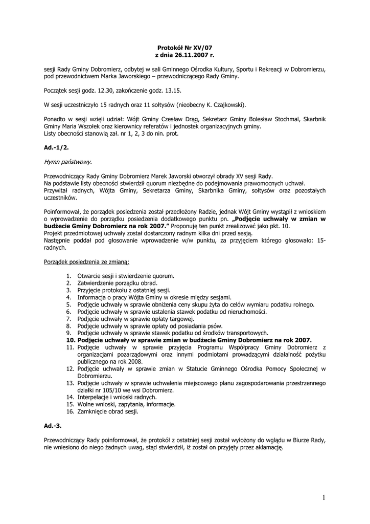 Protokół Nr XV/07 z dnia 26.11.2007 r. sesji Rady Gminy Dobromierz, odbytej w sali Gminnego Ośrodka Kultury, Sportu i Rekreacji w Dobromierzu, pod przewodnictwem Marka Jaworskiego – przewodniczącego Rady Gminy. Początek sesji godz. 12.30, zakończenie godz. 13.15. W sesji uczestniczyło 15 radnych oraz 11 sołtysów (nieobecny K. Czajkowski). Ponadto w sesji wzięli udział: Wójt Gminy Czesław Drąg, Sekretarz Gminy Bolesław Stochmal, Skarbnik Gminy Maria Wszołek oraz kierownicy referatów i jednostek organizacyjnych gminy. Listy obecności stanowią zał. nr 1, 2, 3 do nin. prot. Ad.-1/2. Hymn państwowy. Przewodniczący Rady Gminy Dobromierz Marek Jaworski otworzył obrady XV sesji Rady. Na podstawie listy obecności stwierdził quorum niezbędne do podejmowania prawomocnych uchwał. Przywitał radnych, Wójta Gminy, Sekretarza Gminy, Skarbnika Gminy, sołtysów oraz pozostałych uczestników. Poinformował, że porządek posiedzenia został przedłożony Radzie, jednak Wójt Gminy wystąpił z wnioskiem o wprowadzenie do porządku posiedzenia dodatkowego punktu pn. „Podjęcie uchwały w zmian w budżecie Gminy Dobromierz na rok 2007.” Proponuję ten punkt zrealizować jako pkt. 10. Projekt przedmiotowej uchwały został dostarczony radnym kilka dni przed sesją. Następnie poddał pod głosowanie wprowadzenie w/w punktu, za przyjęciem którego głosowało: 15radnych. Porządek posiedzenia ze zmianą: 1. 2. 3. 4. 5. 6. 7. 8. 9. 10. 11. 12. 13. 14. 15. 16. Otwarcie sesji i stwierdzenie quorum. Zatwierdzenie porządku obrad. Przyjęcie protokołu z ostatniej sesji. Informacja o pracy Wójta Gminy w okresie między sesjami. Podjęcie uchwały w sprawie obniżenia ceny skupu żyta do celów wymiaru podatku rolnego. Podjęcie uchwały w sprawie ustalenia stawek podatku od nieruchomości. Podjęcie uchwały w sprawie opłaty targowej. Podjęcie uchwały w sprawie opłaty od posiadania psów. Podjęcie uchwały w sprawie stawek podatku od środków transportowych. Podjęcie uchwały w sprawie zmian w budżecie Gminy Dobromierz na rok 2007. Podjęcie uchwały w sprawie przyjęcia Programu Współpracy Gminy Dobromierz z organizacjami pozarządowymi oraz innymi podmiotami prowadzącymi działalność pożytku publicznego na rok 2008. Podjęcie uchwały w sprawie zmian w Statucie Gminnego Ośrodka Pomocy Społecznej w Dobromierzu. Podjęcie uchwały w sprawie uchwalenia miejscowego planu zagospodarowania przestrzennego działki nr 105/10 we wsi Dobromierz. Interpelacje i wnioski radnych. Wolne wnioski, zapytania, informacje. Zamknięcie obrad sesji. Ad.-3. Przewodniczący Rady poinformował, że protokół z ostatniej sesji został wyłożony do wglądu w Biurze Rady, nie wniesiono do niego żadnych uwag, stąd stwierdził, iż został on przyjęty przez aklamację. 1 Ad.-4. Nie zgłoszono żadnych zapytań do przedstawionej informacji o pracy Wójta Gminy w okresie między sesjami. Ad.-5. -przewodnicząca Komisji Budżetowej M. Jerie-Reczuch- poinformowała, że kierowana przez nią komisja, w głosowaniu: 4-za, 1-wstrzymał się, pozytywnie zaopiniowała projekt uchwały w sprawie obniżenia ceny skupu żyta do celów wymiaru podatku rolnego. -radna D. Świerk- zapytała, jakie stawki podatku rolnego ustaliły ościenne gminy wiejskie? -p. Wójt- powiedział, że obecnie nie ma takiej informacji. -radna M. Jerie-Reczuch- poinformowała, że Komisja Budżetowa została poinformowana o stawkach ustalonych w ościennych gminach. Za przyjęciem Uchwały Nr XV/81/07w sprawie obniżenia ceny skupu żyta do celów wymiaru podatku rolnego, głosowało: 13-radnych, 2-wstrzymało się. Uchwała została podjęta. Ad.-6. -przewodnicząca Komisji Budżetowej M. Jerie-Reczuch- poinformowała, że kierowana przez nią komisja, jednogłośnie: 5-za, pozytywnie zaopiniowała projekt uchwały w sprawie ustalenia stawek podatku od nieruchomości. Za przyjęciem Uchwały Nr XV/82/07 w sprawie ustalenia stawek podatku od nieruchomości, głosowało: 13-radnych, 2-wstrzymało się. Uchwała została podjęta. Ad.-7. -przewodnicząca Komisji Budżetowej M. Jerie-Reczuch- poinformowała, że kierowana przez nią komisja, jednogłośnie: 5-za, pozytywnie zaopiniowała projekt uchwały w sprawie opłaty targowej. -radny Z. Zieliński- zapytał, czy w 2007r. nie było dużych dochodów z tytułu opłaty targowej? Czy handel przewodniczącego Rady jest handlem obwoźnym i czy jest pan podatnikiem z tytułu tej opłaty? -przewodniczący Rady M. Jaworski- wyjaśnił, że jest podatnikiem prowadzącym handel obwoźny i sklep i dwóch podatków nie będzie płacił i jeżeli to nie pasuje p. Zielińskiemu to o tę sprawę może zapytać wyżej. Za przyjęciem Uchwały Nr XV/83/07 w sprawie opłaty targowej, głosowało: 15-radnych. Uchwała została podjęta. Ad.-8. -przewodnicząca Komisji Budżetowej M. Jerie-Reczuch- poinformowała, że kierowana przez nią komisja, jednogłośnie: 5-za, pozytywnie zaopiniowała projekt uchwały w sprawie opłaty od posiadania psów. -radny S. Biernacki- zapytał, w jaki sposób gmina planuje policzyć psy?, bo psów wałęsających się po wsiach jest bardzo dużo. Psy powinny być oznakowane. Informuję jednocześnie, że moja żona nie zajmuje się tymi czynnościami. Może w końcu zająć się tym tematem i oczipować psy. Wprowadzamy opłatę za psy, ale jak je policzymy, bo to jest fikcja. -radna D. Świerk- zapytała, czy w roku 2007 były jakieś wpływy z tytułu posiadania psa? -Skarbnik gminy M. Wszołek- wyjaśniła, że przedmiotowy projekt uchwały został wprowadzony, ponieważ zmienił się charakter i od 2008r. będzie to opłata, a nie podatek. Z opłaty są zwolnieni rolnicy posiadający do 2 psów. W tym roku tylko 1 osoba dokonała płatności tego podatku. Za przyjęciem Uchwały Nr XV/84/07 w sprawie opłaty od posiadania psów, głosowało: 12radnych, 3-wstrzymało się. Uchwała została podjęta. 2 Ad.-9. -przewodnicząca Komisji Budżetowej M. 