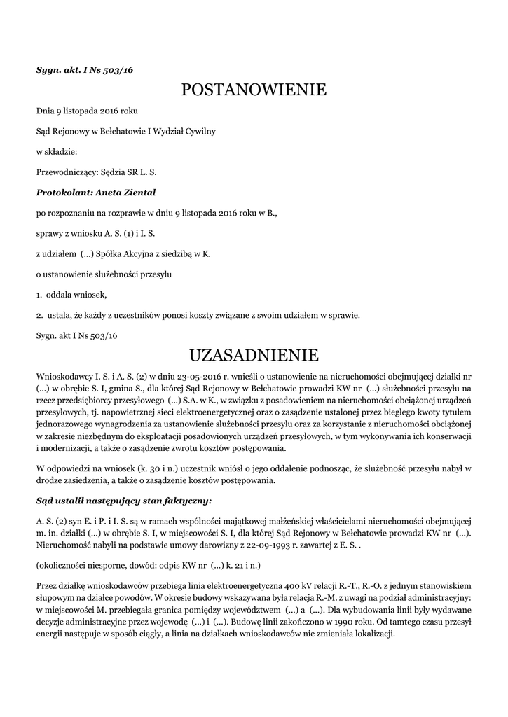 Sygn. akt. I Ns 503/16 POSTANOWIENIE Dnia 9 listopada 2016 roku Sąd Rejonowy w Bełchatowie I Wydział Cywilny w składzie: Przewodniczący: Sędzia SR L. S. Protokolant: Aneta Ziental po rozpoznaniu na rozprawie w dniu 9 listopada 2016 roku w B., sprawy z wniosku A. S. (1) i I. S. z udziałem (...) Spółka Akcyjna z siedzibą w K. o ustanowienie służebności przesyłu 1. oddala wniosek, 2. ustala, że każdy z uczestników ponosi koszty związane z swoim udziałem w sprawie. Sygn. akt I Ns 503/16 UZASADNIENIE Wnioskodawcy I. S. i A. S. (2) w dniu 23-05-2016 r. wnieśli o ustanowienie na nieruchomości obejmującej działki nr (...) w obrębie S. I, gmina S., dla której Sąd Rejonowy w Bełchatowie prowadzi KW nr (...) służebności przesyłu na rzecz przedsiębiorcy przesyłowego (...) S.A. w K., w związku z posadowieniem na nieruchomości obciążonej urządzeń przesyłowych, tj. napowietrznej sieci elektroenergetycznej oraz o zasądzenie ustalonej przez biegłego kwoty tytułem jednorazowego wynagrodzenia za ustanowienie służebności przesyłu oraz za korzystanie z nieruchomości obciążonej w zakresie niezbędnym do eksploatacji posadowionych urządzeń przesyłowych, w tym wykonywania ich konserwacji i modernizacji, a także o zasądzenie zwrotu kosztów postępowania. W odpowiedzi na wniosek (k. 30 i n.) uczestnik wniósł o jego oddalenie podnosząc, że służebność przesyłu nabył w drodze zasiedzenia, a także o zasądzenie kosztów postępowania. Sąd ustalił następujący stan faktyczny: A. S. (2) syn E. i P. i I. S. są w ramach wspólności majątkowej małżeńskiej właścicielami nieruchomości obejmującej m. in. działki (...) w obrębie S. I, w miejscowości S. I, dla której Sąd Rejonowy w Bełchatowie prowadzi KW nr (...). Nieruchomość nabyli na podstawie umowy darowizny z 22-09-1993 r. zawartej z E. S. . (okoliczności niesporne, dowód: odpis KW nr (...) k. 21 i n.) Przez działkę wnioskodawców przebiega linia elektroenergetyczna 400 kV relacji R.-T., R.-O. z jednym stanowiskiem słupowym na działce powodów. W okresie budowy wskazywana była relacja R.-M. z uwagi na podział administracyjny: w miejscowości M. przebiegała granica pomiędzy województwem (...) a (...). Dla wybudowania linii były wydawane decyzje administracyjne przez wojewodę (...) i (...). Budowę linii zakończono w 1990 roku. Od tamtego czasu przesył energii następuje w sposób ciągły, a linia na działkach wnioskodawców nie zmieniała lokalizacji. W 2013 i 2014 r. były wykonywane wycinki drzew pod linią. W 2015 r. był przeprowadzony przegląd linii, wymienione izolatory, naprawiony przewód odgromowy, przewód fazowy i uzupełnione tabliczki z numerami słupów. Do 2015 r. właściciele przedmiotowej nieruchomości nie zgłaszali roszczeń związanych z usytuowaniem urządzeń przesyłowych. (dowód: zeznania świadka K. S. k. 138-139) Decyzją nr (...) z 27-05-1988 r. Wojewoda (...) na wniosek Zakładu (...) w Ł. ustalił lokalizację inwestycji polegającej na budowie linii energetycznej 400 kV R.-M. na terenie województwa (...). (dowód: decyzja k. 65-66) Decyzją z 16-11-1988 r. Urząd Wojewódzki w P. Tryb. udzielił Zakładowi (...) w Ł. pozwolenia na budowę i zatwierdził plan linii energetycznej 400 kV R.-M. na terenie województwa (...). (dowód: decyzja k. 17, 69) E. S. jako właściciel działki (...) wyraził zgodę na przeprowadzenie przez Zakład (...) w Ł. przez ww. działki w S. I linii energetycznej 400 kV zgodnie z decyzją o lokalizacji inwestycji nr 49/88 z 27-05-1988 r. (dowód: oświadczenie k. 18, 72) Zakład (...) wchodził w skład Zakładów (...). (dowód: zarządzenie nr 16 Naczelnego Dyrektora Zjednoczenia (...) z dnia 12 sierpnia 1975 roku w sprawie dostosowania terenowej organizacji energetyki do podziału administracyjnego karta 73-80) W wyniku podziału przedsiębiorstwa państwowego pod nazwą Centralny O. Energetyczny w W. na bazie Zakładu (...) w Ł. zarządzeniem Nr 14/ORG/89 Ministra Przemysłu z dnia 16 stycznia 1989 r. utworzone zostało z dniem 1 stycznia 1989 r. przedsiębiorstwo państwowe pod nazwą „ Zakład (...) w Ł.”. (dowód: zarządzenie nr 14/ORG/89 Ministra Przemysłu - karta 89-91) Zarządzeniem nr 182/O./93 Ministra Przemysłu i Handlu z 09-07-1993 r. dokonano podziału przedsiębiorstwa państwowego pod nazwą „ Zakład (...) w Ł.” w celu wniesienia przez Skarb Państwa zorganizowanej części mienia przedsiębiorstwa do spółki akcyjnej (...) S.A. w W.. (...) S.A. przekazano m. in. linię 400 kV R.-T.. (dowód: zarządzenie k. 92, załącznik do zarządzenia k. 94, protokół zdawczo-odbiorczy k. 96 na odwrocie) Dnia 24-10-2007 r. (...) S.A. zmieniły nazwę na (...) S.A. (...) S. A. 31-12-2007 r. uległa podziałowi. W podziale uczestniczyła (...) S.A., która przejęła wydzieloną część majątku (...) S. A., w tym linię 400 kV R.-T. ( (...) S.A. przejęła cały majątek sieciowy (...) S. A.) (dowód: protokół nadzwyczajnego walnego zgromadzenia (...) S.A. k. 116-121, odpis z rejestru przedsiębiorców k. 60 i k. 54 na odwrocie) (...) S.A. 12-12-2008 r. zmieniła nazwę na (...) S.A. (...) S.A 09-01-2013 r. zmieniła nazwę na (...) S.A. (dowód: odpis z rejestru przedsiębiorców k. 55-56) W piśmie z dnia 03-03-2015 r. pełnomocnik I. S. i A. S. (2) wezwał (...) S.A. do umownego ustanowienia służebności przesyłu na nieruchomości obejmującej działki (...), dla której jest prowadzona księga wieczysta nr (...). (niesporne, dowód: pismo pełnomocnika I. S. i A. S. (2) – k. 19) Stan faktyczny niniejszej sprawy został ustalony w oparciu o dokumenty przedstawione przez uczestnika oraz zeznania świadka, a ponadto treść księgi wieczystej nr (...). Z zeznań świadka wprost wynika, iż przez działkę wnioskodawców przechodzi napowietrzna linia energetyczna wchodząca w skład przedsiębiorstwa uczestnika, kiedy rozpoczęto eksploatację linii oraz to, w jaki sposób uc