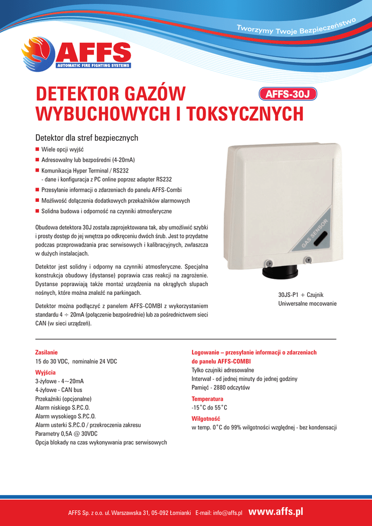 Tworzym y ze Twoje Bezpiec o ństw DETEKTOR GAZÓW WYBUCHOWYCH I TOKSYCZNYCH Detektor dla stref bezpiecznych ■ Wiele opcji wyjść ■ Adresowalny lub bezpośredni (4-20mA) ■ Komunikacja Hyper Terminal / RS232 - dane i konfiguracja z PC online poprzez adapter RS232 ■ Przesyłanie informacji o zdarzeniach do panelu AFFS-Combi ■ Możliwość dołączenia dodatkowych przekaźników alarmowych ■ Solidna budowa i odporność na czynniki atmosferyczne Obudowa detektora 30J została zaprojektowana tak, aby umożliwić szybki i prosty dostęp do jej wnętrza po odkręceniu dwóch śrub. Jest to przydatne podczas przeprowadzania prac serwisowych i kalibracyjnych, zwłaszcza w dużych instalacjach. Detektor jest solidny i odporny na czynniki atmosferyczne. Specjalna konstrukcja obudowy (dystanse) poprawia czas reakcji na zagrożenie. Dystanse poprawiają także montaż urządzenia na okrągłych słupach nośnych, które można znaleźć na parkingach. Detektor można podłączyć z panelem AFFS-COMBI z wykorzystaniem standardu 4 ÷ 20mA (połączenie bezpośrednie) lub za pośrednictwem sieci CAN (w sieci urządzeń). Zasilanie 15 do 30 VDC, nominalnie 24 VDC Wyjścia 3-żyłowe - 4~20mA 4-żyłowe - CAN bus Przekaźniki (opcjonalne) Alarm niskiego S.P.C.O. Alarm wysokiego S.P.C.O. Alarm usterki S.P.C.O / przekroczenia zakresu Parametry 0,5A @ 30VDC Opcja blokady na czas wykonywania prac serwisowych 30JS-P1 + Czujnik Uniwersalne mocowanie Logowanie – przesyłanie informacji o zdarzeniach do panelu AFFS-COMBI Tylko czujniki adresowalne Interwał - od jednej minuty do jednej godziny Pamięć - 2880 odczytów Temperatura -15˚C do 55˚C Wilgotność w temp. 0˚C do 99% wilgotności względnej - bez kondensacji AFFS Sp. z o.o. ul. Warszawska 31, 05-092 Łomianki E-mail: [email protected] www.affs.pl SENSOR DETEKTORA SKRZYNKA POŁĄCZENIOWA Typ P1 - Przeznaczony do stref bezpiecznych Typ 30J - do użycia tylko w strefach bezpiecznych Skrzynka głęboka (D) lub płytka (S) Stopień ochrony IP63, + Osprzęt uniwersalny IP65 Klasa ochrony IP64 Materiał Czarne tworzywo ABS Materiał Tworzywo ABS Trudnopalne FR 40 Śruby pokrywy M4SS Sensor - 4 serii Elektrochemiczne Podczerwieni Półprzewodnikowe Pellistor - katalityczne PID Wykończenie Kolor biały wg palety RAL 9003 Waga 380 gram Akcesoria - Opcjonalne Kolektor stożkowy zbierający + Osprzęt uniwersalny Osprzęt uniwersalny (aplikator gazu testowego/detektor aerozolu) Zespół zasysający Zestaw do montażu w kanałach Osłona przeciwdeszczowa Wejścia przewodów Z tyłu, wycięcia 5-20 mm Mocowanie Dystans - śruby M4 lub No 8 Nr wzoru UE 01359723-0001 C C A A 145 B B A G as Se ns or A 10 85.0 (D) 60.0 (S) 147.0 C C Cover Lid Removed Niniejszy dokument nie ma charakteru zobowiązania umownego i specyfikacja urządzeń może ulec zmianie w dowolnym czasie, bez uprzedniego zawiadomienia.