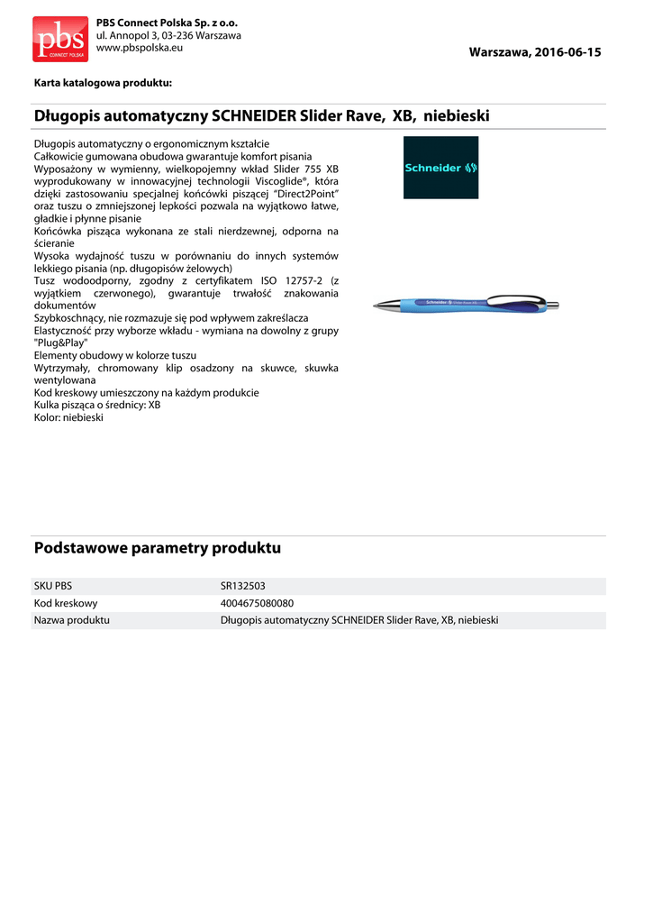 PBS Connect Polska Sp. z o.o. ul. Annopol 3, 03-236 Warszawa www.pbspolska.eu Warszawa, 2016-06-15 Karta katalogowa produktu: Długopis automatyczny SCHNEIDER Slider Rave, XB, niebieski Długopis automatyczny o ergonomicznym kształcie Całkowicie gumowana obudowa gwarantuje komfort pisania Wyposażony w wymienny, wielkopojemny wkład Slider 755 XB wyprodukowany w innowacyjnej technologii Viscoglide®, która dzięki zastosowaniu specjalnej końcówki piszącej “Direct2Point” oraz tuszu o zmniejszonej lepkości pozwala na wyjątkowo łatwe, gładkie i płynne pisanie Końcówka pisząca wykonana ze stali nierdzewnej, odporna na ścieranie Wysoka wydajność tuszu w porównaniu do innych systemów lekkiego pisania (np. długopisów żelowych) Tusz wodoodporny, zgodny z certyfikatem ISO 12757-2 (z wyjątkiem czerwonego), gwarantuje trwałość znakowania dokumentów Szybkoschnący, nie rozmazuje się pod wpływem zakreślacza Elastyczność przy wyborze wkładu - wymiana na dowolny z grupy "Plug&Play" Elementy obudowy w kolorze tuszu Wytrzymały, chromowany klip osadzony na skuwce, skuwka wentylowana Kod kreskowy umieszczony na każdym produkcie Kulka pisząca o średnicy: XB Kolor: niebieski Podstawowe parametry produktu SKU PBS SR132503 Kod kreskowy 4004675080080 Nazwa produktu Długopis automatyczny SCHNEIDER Slider Rave, XB, niebieski PBS Connect Polska Sp. z o.o. ul. Annopol 3, 03-236 Warszawa www.pbspolska.eu Warszawa, 2016-06-15 Karta katalogowa produktu cd. Długopis automatyczny SCHNEIDER Slider Rave, XB, niebieski Podstawowe parametry produktu Kategoria Długopisy Marka SCHNEIDER Certyfikaty Nowy produkt w ofercie Standard Hit Standard Kolor Kolor Niebieski Cecha Produkt Długopis automatyczny Typ Gumowana obudowa W ofercie od 2015-01 Wymiary Grubość linii (mm) XB Wspólny słownik zamówień CPV 30192121-5 Długopisy kulkowe Jednostki logistyczne Opakowanie 1 5 szt Opakowanie 2 200 szt Opakowanie 3 22400 szt