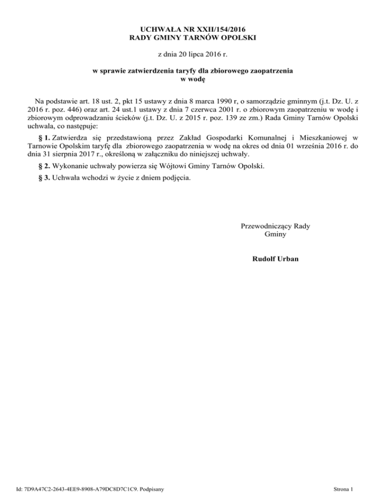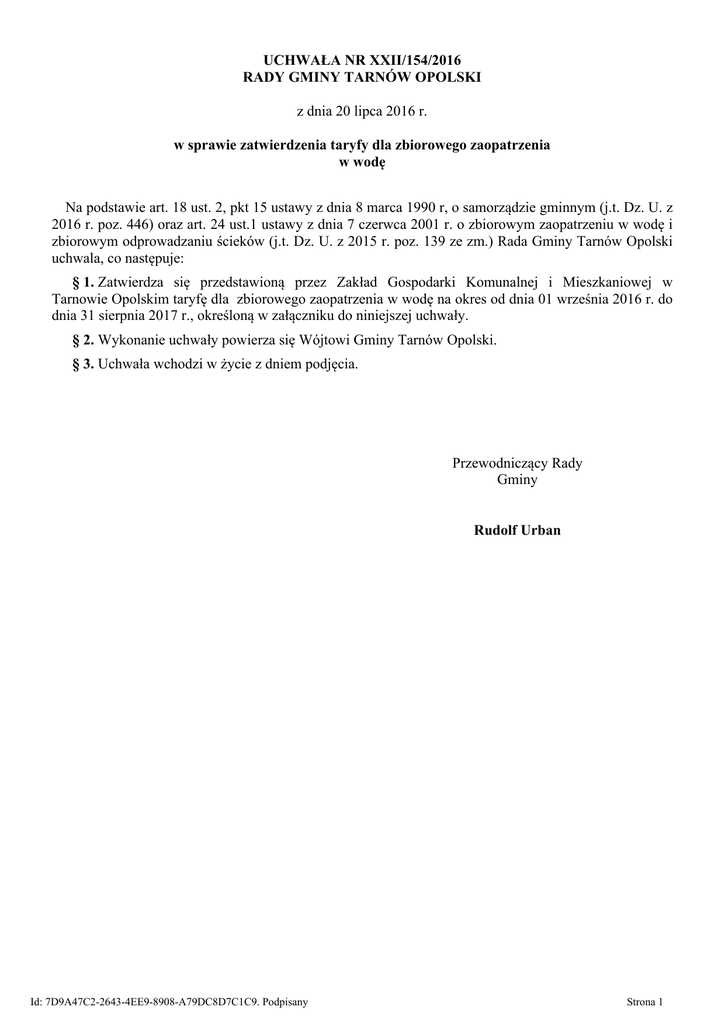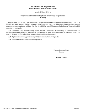 UCHWAŁA NR XXII/154/2016 RADY GMINY TARNÓW OPOLSKI z dnia 20 lipca 2016 r. w sprawie zatwierdzenia taryfy dla zbiorowego zaopatrzenia w wodę Na podstawie art. 18 ust. 2, pkt 15 ustawy z dnia 8 marca 1990 r, o samorządzie gminnym (j.t. Dz. U. z 2016 r. poz. 446) oraz art. 24 ust.1 ustawy z dnia 7 czerwca 2001 r. o zbiorowym zaopatrzeniu w wodę i zbiorowym odprowadzaniu ścieków (j.t. Dz. U. z 2015 r. poz. 139 ze zm.) Rada Gminy Tarnów Opolski uchwala, co następuje: § 1. Zatwierdza się przedstawioną przez Zakład Gospodarki Komunalnej i Mieszkaniowej w Tarnowie Opolskim taryfę dla zbiorowego zaopatrzenia w wodę na okres od dnia 01 września 2016 r. do dnia 31 sierpnia 2017 r., określoną w załączniku do niniejszej uchwały. § 2. Wykonanie uchwały powierza się Wójtowi Gminy Tarnów Opolski. § 3. Uchwała wchodzi w życie z dniem podjęcia. Przewodniczący Rady Gminy Rudolf Urban Id: 7D9A47C2-2643-4EE9-8908-A79DC8D7C1C9. Podpisany Strona 1 Załącznik do Uchwały Nr XXII/154/2016 Rady Gminy Tarnów Opolski z dnia 20 lipca 2016 r. TARYFA DLA ZBIOROWEGO ZAOPATRZENIA W WODĘ na okres od 01.09.2016r. do dnia 31.08.2017r. Spis treści: 1. Informacje ogólne. 2. Rodzaje prowadzonej działalności. 3. Rodzaj i struktura taryfy. 4. Taryfowe grupy odbiorców usług. 5. Rodzaje i wysokość cen i stawek opłat. 6. Warunki rozliczeń z uwzględnieniem wyposażenia nieruchomości w przyrządy i urządzenia pomiarowe. 7. Warunki stosowania cen i stawek opłat. ZGKiM Tarnów Opolski Id: 7D9A47C2-2643-4EE9-8908-A79DC8D7C1C9. Podpisany Strona 2 1. Informacje ogólne Niniejsze taryfy stanowią zestawienie cen i stawek za zbiorowe zaopatrzenie w wodę obowiązujące na terenie Gminy Tarnów Opolski oraz Gminy Izbicko miejscowość Grabów na okres 12 miesięcy od dnia 01 września 2016r. do 31 sierpnia 2017r. Taryfy określają także warunki ich stosowania i opracowane zostały na podstawie zasad określonych w art. 20 – 23 ustawy z dnia 7 czerwca 2001 o zbiorowym zaopatrzeniu w wodę i zbiorowym odprowadzeniu ścieków, zwanej dalej Ustawą oraz przepisami rozporządzenia Ministra budownictwa z dnia 28 czerwca 2006 w sprawie określania taryf, wzoru wniosku o zatwierdzenie taryf oraz warunków rozliczeń za zbiorowe zaopatrzenie w wodę i zbiorowe odprowadzanie ścieków (Dz. U. z 2006 r. Nr 127 poz. 886) zwanego dalej Rozporządzeniem. Taryfowe ceny i stawki opłat dotyczą wszystkich odbiorców usług wodociągowych świadczonych przez Zakład Gospodarki Komunalnej i Mieszkaniowej w Tarnowie Opolskim zwanym dalej Zakładem na terenie Gminy Tarnów Opolski oraz Gminy Izbicko miejscowość Grabów. Zakład wyznacza koszty uzasadnionych usług wodociągowych w oparciu o zasady rachunku ekonomicznego. Zgodnie z art. 22 ustawy, taryfa obejmuje cenę za wodę do zasilania publicznych fontann i na cele przeciwpożarowe oraz do zraszania publicznych ulic i terenów zielonych. 2. Rodzaje prowadzonej działalności Zakład Gospodarki Komunalnej i Mieszkaniowej w Tarnowie Opolskim prowadzi działalność w zakresie zbiorowego zaopatrzenia w wodę i zbiorowego odprowadzania ścieków na podstawie Uchwały Nr XII/71/95 Rady Gminy w Tarnowie Opolskim z dnia 25 września 1995 r w sprawie utworzenia zakładu budżetowego oraz Uchwały Nr XXXVI/238/06 Rady Gminy Tarnów Opolski z dnia 27 marca 2006 r. w sprawie nadania statutu Zakładowi Gospodarki Komunalnej i Mieszkaniowej. Przedmiotem działania zakładu w zakresie zbiorowego zaopatrzenia w wodę jest: - pobór i uzdatnianie wody; - rozprowadzanie wody; - wymiana i legalizacja wodomierzy głównych; - konserwacja sieci wodociągowej z hydrantami oraz kanalizacyjnej; - wydawanie warunków technicznych przyłączeń dla odbiorców wody; Zakład prowadzi, ponadto inną działalność na terenie gminy obejmującą: - wywóz nieczystości płynnych; - zimowe utrzymanie dróg - na zlecenie gminy; - administrowanie budynkami mieszkalnymi i lokalami użytkowymi; Id: 7D9A47C2-2643-4EE9-8908-A79DC8D7C1C9. Podpisany Strona 3 - pielęgnacja terenów zielonych - na zlecenie gminy; - inne usługi zlecone przez gminę; Zakład jest samorządowym zakładem budżetowym i w myśl ustawy nie wymaga zezwolenia na prowadzenie działalności z zakresie zbiorowego zaopatrzenia w wodę i zbiorowego odprowadzania ścieków. Zakład działa zgodnie z Regulaminem dostarczania wody i odprowadzania ścieków uchwalonym przez Radę Gminy Tarnów Op. 3. Rodzaj i struktura taryfy. Taryfa za zaopatrzenie w wodę jest taryfą jednolitą zawierającą jednolitą cenę usługi i jednolitą stawkę opłaty za 1m3 wody dla wszystkich odbiorców, wieloczłonową zawierającą cenę abonamentu do 1m3 dostarczonej wody i stawki opłaty stałej (abonament). 4. Taryfowe grupy odbiorców usług. W zakresie zbiorowego zaopatrzenia w wodę ( w oparciu o zapisy ustawy z dnia 7 czerwca 2001 r. o zbiorowym zaopatrzeniu w wodę i zbiorowym odprowadzaniu ścieków (j.t. Dz. U. z 2015 r., poz.139 ze zm.) oraz przepisy wykonawcze do tej ustawy) wyłoniono jedną grupę taryfową: • gospodarstwa domowe i pozostali odbiorcy – symbol: Grupa 1, obejmującą wszystkich odbiorców usług wodociągowych ze względu na brak możliwości precyzyjnego wydzielenia kosztów na inne grupy. Związane jest to z jednolitą strukturą odbiorców wody stąd alokacja kosztów na inne grupy odbiorców w żaden sposób nie wpłynie na wysokość stawek w podstawowej grupie odbiorców. 5. Rodzaje i wysokość cen i stawek opłat. Wysokość cen i stawek opłat za dostarczanie wody: Lp. Wyszczególnienie Taryfowa grupa odbiorców 1 1 Wysokość cen i stawek opłat Rodzaj cen i stawek opłat Netto Jedn. miary 2 3 4 cena za dostarczoną wodę 3,06 zł/1 m3 stawka opłaty abonamentowej 3,25 zł/jeden przyrząd pomiarowy/m-c Grupa 1 Do wymienionych w tabeli cen i stawek dolicza się podatek od towarów i usług w obowiązującej wysokości. Id: 7D9A47C2-2643-4EE9-8908-A79DC8D7C1C9. Podpisany Strona 4 6. Warunki rozlicze