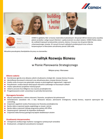 CEMEX to globalny lider w branży materiałów budowlanych. Od ponad 100 lat dostarczamy wysokiej jakości produkty i usługi naszym klientom i społecznościom na całym świecie. CEMEX Polska należy do czołówki krajowych producentów cementu, betonu i kruszyw oraz do grona liderów zrównoważonego rozwoju. W naszych licznych zakładach produkcyjnych oraz w biurze korporacyjnym w Warszawie zatrudniamy ponad 1100 osób. Aktualnie poszukujemy Kandydatów do pracy na stanowisku: Analityk Rozwoju Biznesu w Pionie Planowania Strategicznego Miejsce pracy: Warszawa Główne zadania: Koordynacja agendy oraz aktywny udział w budowaniu strategii dot. rozwoju biznesu Kruszyw, Identyfikacja kluczowych zmiennych oraz aktualizacja planu rozwoju biznesu Kruszyw Analiza rynku kruszyw oraz potencjału rozwoju w poszczególnych segmentach i regionach Pozyskiwanie i analiza danych dotyczących otoczenia rynkowego na kluczowych rynkach Analiza opłacalności projektów inwestycyjnych Udział w procesie Due Dilligence oraz wyceny przedsiębiorstw Przygotowywanie analiz i prezentacji na potrzeby kierownictwa Wymagania formalne: Wyższe wykształcenie z zakresu ekonomii, finansów, zarządzania lub pokrewnych Doświadczenie zawodowe min. 2 lata. Wskazane obszary: planowanie strategiczne, rozwój biznesu, wsparcie operacyjne lub controlling, Znajomość zagadnień analizy finansowej oraz finansów przedsiębiorstw Bardzo dobra znajomość języka angielskiego w mowie i piśmie Bardzo dobra znajomość obsługi programów pakietu MS Office Dyspozycyjność i gotowość do wyjazdów służbowych Znajomość dokumentacji geologicznej będzie dodatkowym atutem Oczekiwania interpersonalne: Umiejętność analitycznego myślenia i wyciągania syntetycznych wniosków Kreatywność, umiejętność poszukiwania rozwiązań Umiejętność samodzielnego planowania i organizacji pracy Umiejętność estetycznego i intuicyjnego przedstawienia efektów pracy w finalnych prezentacjach Wysoko rozwinięte zdolności interpersonalne i komunikacyjne Zaangażowanie i aktywność w działaniu Odporność na stres i umiejętność pracy pod presją czasu Co możesz zyskać pracując w CEMEX? Szansę na rozwój zawodowy w stabilnej firmie o globalnym zasięgu Dostęp do najnowszych metodologii i rozwiązań biznesowych Konkurencyjny pakiet wynagrodzeń i świadczeń W naszych rekrutacjach stosujemy zasady równości i poszanowania różnorodności. Zatrudniamy kandydatów najlepiej spełniających wymagania na danym stanowisku, bez względu na stopień sprawności, wiek, płeć, pochodzenie lub inne cechy podmiotowe. Jeżeli czujesz, że ta praca jest dla Ciebie, kliknij Informujemy, że wszystkie nadesłane aplikacje zostaną poddane wnikliwej analizie, jednak odpowiemy tylko na wybrane zgłoszenia. Poznaj CEMEX: Prosimy o zamieszczenie w aplikacji następującej klauzuli: „Wyrażam zgodę na przetwarzanie moich danych osobowych zawartych w dokumentach rekrutacyjnych dla potrzeb związanych z realizacją obecnie prowadzonego procesu rekrutacji oraz procesów rekrutacji prowadzonych w przyszłości przez administratora danych CEMEX Polska Sp. z o.o., ul. Łopuszańska 38D, 02-232 Warszawa („Spółka”), zgodnie z ustawą z dnia 29 sierpnia 1997 r. o ochronie danych osobowych (tekst jednolity: Dz. U. z 2002 r. Nr 101 poz. 926)”. Zostałem(am) poinformowany(a) o przysługującym mi prawie dostępu do treści moich danych oraz prawie ich poprawiania. Podanie danych jest dobrowolne, lecz niezbędne dla celów rekrutacji prowadzonej przez Spółkę.”