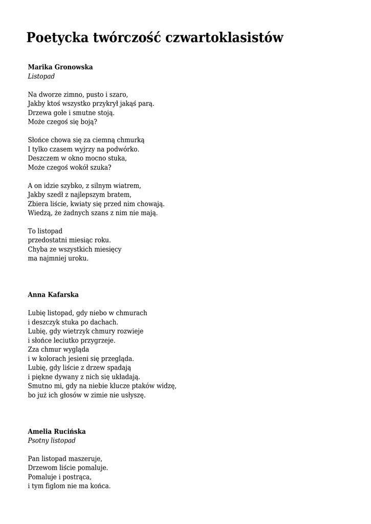 Poetycka twórczość czwartoklasistów Marika Gronowska Listopad Na dworze zimno, pusto i szaro, Jakby ktoś wszystko przykrył jakąś parą. Drzewa gołe i smutne stoją. Może czegoś się boją? Słońce chowa się za ciemną chmurką I tylko czasem wyjrzy na podwórko. Deszczem w okno mocno stuka, Może czegoś wokół szuka? A on idzie szybko, z silnym wiatrem, Jakby szedł z najlepszym bratem, Zbiera liście, kwiaty się przed nim chowają. Wiedzą, że żadnych szans z nim nie mają. To listopad przedostatni miesiąc roku. Chyba ze wszystkich miesięcy ma najmniej uroku. Anna Kafarska Lubię listopad, gdy niebo w chmurach i deszczyk stuka po dachach. Lubię, gdy wietrzyk chmury rozwieje i słońce leciutko przygrzeje. Zza chmur wygląda i w kolorach jesieni się przegląda. Lubię, gdy liście z drzew spadają i piękne dywany z nich się układają. Smutno mi, gdy na niebie klucze ptaków widzę, bo już ich głosów w zimie nie usłyszę. Amelia Rucińska Psotny listopad Pan listopad maszeruje, Drzewom liście pomaluje. Pomaluje i postrąca, i tym figlom nie ma końca. Lunie deszczem, sypnie śniegiem. - A czym jeszcze? - Szczerze, nie wiem. Natalia Wójtowicz Listopad Za oknem już jesienna słota, Szaro, ponuro, bo to listopad. Liście już dawno zdmuchnął psotnego wiatru zimny powiew. Gdy chcę na spacer iść, to proszę, by mama podała mi ciepłe kalosze. Duży parasol ze sobą biorę, przyda się w deszczową porę. Idę i patrzę, a tu kałuża, Cieszę się bardzo, że taka duża. Kalosze mam, dobrze się składa. W kałuży będzie świetna zabawa. Dzień listopadowy jest krótki, Jednak wieczór to czas dla rodziny. Ciekawa książka mile widziana, Cieplutkim kocem jestem odziana. Dorian Brzozowski Listopadowy krajobraz W listopadzie drzewa już nagie i szare, A wokół szaruga, plucha. Zieleń odeszła w niepamięć, I wszędzie półmrok, deszcz i zawierucha. Ludzie zamaskowani przed mrozem w swych ciepłych ubraniach, W rękach parasole, Bo deszcz może przyjść nie w porę. Listopad to miesiąc nieciekawy, Lecz potrzebny By wszyscy z utęsknieniem na wiosnę czekali. Wiktoria Dudar Listopad Listopad jest tajemniczy nocą widać blask zniczy. Poranne mgły nas witają, ostatnie liście spadają. Nie śpiewa na łące skowronek, bo coraz krótszy jest dzionek. Przyroda swe barwy straciła, bo z kapuśniaczka woda je zmyła. Jagoda Łojek Poranek listopadowy Poranek już wstał, chłodny wiatr zawiał. Biały szron pojawił się na łące. Oto nasz listopadowy poranek. Niebo szare, chłodne powietrze drzewa zmarniałe, Lecz to nie jest ważne, Nasz listopad jest piękny jak zawsze. Anna Pabich Listopad Za oknem listopad. Pod krzaczkiem listopad. W kalendarzu listopad. Wszędzie listopad. Otworzył listopad parasol, popłynął szarugi deszcz. Dmuchnął listopad w las i wiatr poniósł liście hen. Założył listopad czapkę, szalik i kalosze włożył też. Srebrny szron okrył świat koronkowym płaszczem łez. Zadumał się listopad, przy grobie paląc znicz. „Przeminę, przyjdą święta, o listopadzie nikt nie będzie pewnie pamiętać”.