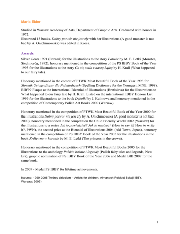 Maria Ekier Studied in Warsaw Academy of Arts, Department of Graphic Arts. Graduated with honors in 1972. Illustrated 13 books. Dobry potwór nie jest zły with her illustrations (A good monster is not bad by A. Onichimowska) was edited in Korea. Awards: Silver Goats 1991 (Poznań) for the illustrations to the story Potwór by M. E. Letki (Monster, Siedmioróg, 1992), honorary mentioned in the competition of the PS IBBY Book of the Year 1993 for the illustrations to the story Co się stało z naszą bajką by H. Krall (What happened to our fairy tale). Honorary mentioned in the contest of PTWK Most Beautiful Book of the Year 1998 for Słownik Ortograficzny dla Najmłodszych (Spelling Dictionary for the Youngest, MNE, 1998). BIB'99 Plaque at the International Biennial of Illustrations (Bratislava) for the illustrations to What happened to our fairy tale by H. Krall. Listed on the international IBBY Honour List 1999 for the illustrations to the book Dębołki by J. Kulmowa and honorary mentioned in the competition of Contemporary Polish Art Books 2000 (Warsaw). Honorary mentioned in the competition of PTWK Most Beautiful Book of the Year 2000 for the illustrations Dobry potwór nie jest zły by A. Onichimowska (A good monster is not bad, 2000), honorary mentioned in the competition the Child Friendly World 2002 (Warsaw) for the illustrations to a series Jak to powiedzieć? Jak to napisać? (How to say it? How to write it?, PWN), the second prize at the Biennial of Illustrations 2004 (Aki Town, Japan), honorary mentioned in the competition of PS IBBY Book of the Year 2005 for the illustrations in the book Królewna w koronie by M. E. Letki (The princess in the crown). Honorary mentioned in the competition of PTWK Most Beautiful Books 2005 for the illustrations to the anthology Polskie baśnie i legendy (Polish fairy tales and legends, New Era), graphic nomination of PS IBBY Book of the Year 2006 and Medal BIB 2007 for the same book. In 2009 - Medal PS IBBY for lifetime achievements. (source: 1990-2005 Twórcy dzieciom – Artists for children, Almanach Polskiej Sekcji IBBY, Warsaw: 2006) 1