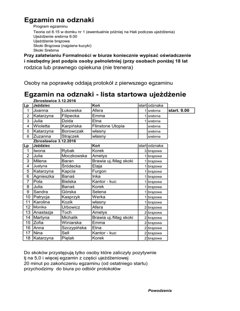 Egzamin na odznaki Program egzaminu Teoria od 8.15 w domku nr 1 (ewentualnie później na Hali podczas ujeżdżenia) Ujeżdżenie srebrna 9.00 Ujeżdżenie brązowa Skoki Brązowa (najpierw kucyki) Skoki Srebrna Przy załatwianiu Formalności w biurze koniecznie wypisać oświadczenie i niezbędny jest podpis osoby pełnoletniej (przy osobach poniżej 18 lat rodzica lub prawnego opiekuna (nie trenera) Osoby na poprawkę oddają protokół z pierwszego egzaminu Egzamin na odznaki - lista startowa ujeżdżenie Lp 1 2 3 4 5 6 Lp 1 2 3 4 5 6 7 8 9 10 11 12 13 14 15 16 17 18 Zbrosławice 3.12.2016 Jeździec Koń Joanna Katarzyna Julia Wioletta Katarzyna Zuzanna Afera Emma Etna Flinstone Utopia własny własny Łukowska Filipecka Dzida Karpińska Borowczak Strączek Zbrosławice 3.12.2016 Jeździec Iwona Julia Milena Justyna Katarzyna Agnieszka Pola Julia Sandra Patrycja Karolina Monika Anastazja Martyna Zofia Anna Nina Katarzyna Rybak Moczkowska Baran Śródecka Kapcia Banaś Bielska Banaś Górska Kasprzyk Kozik Urbowicz Toch Michalik Winiarska Szczypińska Sell Piętak Koń Korek Ametys Brawia uj./Mag skoki Elaja Furgon Inka Kantor - kuc Korek Selena Werka własny Afera Ametys Brawia uj./Mag skoki Emma Etna Kantor - kuc Korek start odznaka 1 srebrna start. 9.00 1 srebrna 1 srebrna srebrna srebrna srebrna start odznaka 3 brązowa 1 brązowa 1 brązowa 1 brązowa 1 brązowa 1 brązowa 1 brązowa 1 brązowa 1 brązowa 1 brązowa 1 brązowa 2 brązowa 2 brązowa 2 brązowa 2 brązowa 2 brązowa 2 brązowa 2 brązowa Do skoków przystępują tylko osoby które zaliczyły pozytywnie tj na 5,0 i więcej egzamin z części ujeżdżeniowej 20 minut po zakończeniu egzaminu (od ostatniego startu) przychodzimy do biura po odbiór protokołów Powodzenia Egzamin na odznaki Program egzaminu Teoria od 8.15 w domku nr 1 (ewentualnie później na Hali podczas ujeżdżenia) Ujeżdżenie srebrna 9.00 Ujeżdżenie brązowa Skoki Brązowa (najpierw kucyki) Skoki Srebrna Osoby na poprawkę oddają protokół z pierwszego egzaminu Przy załatwianiu Formalności w biurze koniecznie wypisać oświadczenie i niezbędny jest podpis osoby pełnoletniej (przy osobach poniżej 18 lat rodzica lub prawnego opiekuna (nie trenera) Egzamin na odznaki - lista startowa ujeżdżenie Lp Zbrosławice 4.12.2016 Jeździec 1 Klaudia 2 Katarzyna 3 Natalia 4 Lp 1 2 3 4 5 6 7 8 9 10 11 12 13 14 15 16 17 18 19 20 21 22 Hajok Karmańska Liszka Katarzyna Agnieszka Zuzanna Patrycja Vanessa Anna Agata Katarzyna Milena Joanna Wiktoria Aleksandra Zofia Gabriela Maja Agata Kaja Ewa start odznaka własny uj. Lawika/sk. Latiago Ametys srebrna 1 srebrna 1 srebrna srebrna Zbrosławice 4.12.2016 Jeździec Aleksandra Julia Karolina Koń Hajzyk Gąska Jurowska Bielecka Gronowicz Rainholc Kasprzyk Waleryszak Warcholińska Węzyk Kler Hołda Suszka Mazelanik Szymków Winiarska Szumlińska Szytow Kachel Cot Barzyk Koń start odznaka Afera Brawia uj./Mag skoki Etna Korek Markiza uj./ Emma skoki Rowenta Werka Afera Ametys Brawia uj./Mag skoki Etna Korek Latiago Markiza uj./ Emma skoki Rowenta Brawia uj./Mag skoki Emma Etna 1 brązowa Latiago 3 brązowa 1 brązowa 1 brązowa 1 brązowa 1 brązowa 1 brązowa 1 brązowa 2 brązowa 2 brązowa 2 brązowa 2 brązowa 2 brązowa 2 brązowa 2 brązowa 2 brązowa 3 brązowa 3 brązowa 3 brązowa Markiza uj./Polo Boy skoki3 brązowa Korek 3 brązowa brązowa Do skoków przystępują tylko osoby które zaliczyły pozytywnie tj na 5,0 i więcej egzamin z części ujeżdżeniowej 20 minut po zakończeniu egzaminu (od ostatniego startu) przychodzimy do biura po odbiór protokołów Powodzenia