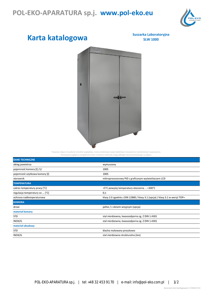POL-EKO-APARATURA sp.j. www.pol-eko.eu Suszarka Laboratoryjna SLW 1000 Karta katalogowa Powyższe zdjęcie ma jedynie charakter poglądowy, może przedstawiad opcje dodatkowe niezawarte w standardowym wyposażeniu. Rzeczywisty wygląd w szczególności kolor i struktura materiału mogą odbiegad od prezentowanego na zdjęciu. DANE TECHNICZNE obieg powietrza wymuszony pojemnośd komory *l+ /1/ 1005 pojemnośd użytkowa komory *l+ 1005 sterownik mikroprocesorowy PID z graficznym wyświetlaczem LCD TEMPERATURA zakres temperatury pracy *°C+ +5°C powyżej temperatury otoczenia … +300°C regulacja temperatury co ... *°C+ 0,1 ochrona nadtemperaturowa klasy 2.0 zgodnie z DIN 12880 / klasy 3.1 (opcja) / klasy 3.1 w wersji TOP+ KOMORA drzwi pełne / z oknem wizyjnym (opcja) materiał komory STD stal nierdzewna, kwasoodporna zg. Z DIN 1.4301 INOX/G stal nierdzewna, kwasoodporna zg. Z DIN 1.4301 materiał obudowy STD blacha malowana proszkowo INOX/G stal nierdzewna strukturalna (len) POL-EKO-APARATURA sp.j. | tel: +48 32 453 91 70 | e-mail: [email protected] | 1/2 Generator kart katalogowych v7 2016-07-21 POL-EKO-APARATURA sp.j. www.pol-eko.eu wymiary zewnętrzne urządzenia [mm] /2/ szerokośd A 1260 wysokośd B 2000 głębokośd C 850 wymiary komory [mm] szerokośd D 1040 wysokośd E 1610 głębokośd F 600 ilośd półek (standard / max) 6 / 22 maksymalne obciażenie półki *kg+ /5/ - - wersja wzmocniona półki (PW) /3/ 100 maksymalne obciążenie urządzenia *kg+ - - wersja wzmocniona urządzenia (W) /4/ 300 waga urządzenia *kg+ 330 PARAMETRY ELEKTRYCZNE zasilanie 400 3/N moc znamionowa urządzenia *W+ 5400 gwarancja 24 miesiące producent POL-EKO-APARATURA powyższe parametry dotyczą urządzeo standardowych (bez wyposażenia opcjonalnego) 1 - pojemnośd komory jest zawsze mniejsza 2 - głębokośd nie obejmuje przyłącza kabla zasilającego - 50 mm 3 - półka wzmocniona 4 - wersja wzmocniona 5 - przy równomiernym obciążeniu całej powierzchni OPCJE I AKCESORIA POL-EKO-APARATURA sp.j. | tel: +48 32 453 91 70 | e-mail: [email protected] | 2/2 Generator kart katalogowych v7 2016-07-21