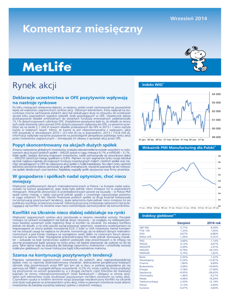 Wrzesień 2014 Komentarz miesięczny Rynek akcji Indeks WIG* 54 000 Deklaracje uczestnictwa w OFE pozytywnie wpływają na nastroje rynkowe Po kilku miesiącach relatywnej słabości, w sierpniu, polski rynek zachowywał się zauważalnie lepiej od większości zagranicznych rynków akcji. Głównym elementem, który wpłynął na stosunkowo mocne zachowanie polskich akcji był zaskakująco duży (w stosunku do oczekiwań sprzed kilku poprzednich tygodni) odsetek osób pozostających w OFE. Ostatecznie dalsze przekazywanie składek emerytalnych do otwartych funduszy emerytalnych zadeklarowało 15,1% dotychczasowych członków OFE. Dodatkowo pozytywne było to, że składki ze strony tych osób stanowiły nieco ponad 20% dotychczasowych wpływów do OFE, co powinno przełożyć się na około 2,7 mld zł nowych składek przekazanych do OFE w 2015 r. i nieco wyższe kwoty w kolejnych latach. Mimo, że kwota ta jest nieporównywalna z wpływami, jakie OFE pozyskały w rekordowym 2010 r. (23 mld zł) czy w poprzednim, 2013 r. (10,8 mld zł), informacja wpłynęła wyraźnie pozytywnie na postrzeganie perspektyw polskiego rynku akcji przez inwestorów zagranicznych – zmniejszyła ich obawy o sprzedaż akcji przez OFE. Popyt skoncentrowany na akcjach dużych spółek Zmiana nastawienia globalnych inwestorów znalazła odzwierciedlenie przede wszystkim w notowaniach akcji dużych polskich spółek – WIG20 zyskał w ciągu miesiąca 4,1% a mWIG40 – 3,1%. Małe spółki, będące domeną krajowych inwestorów, nadal zachowywały się stosunkowo słabo – WIG250 zakończył miesiąc spadkiem o 0,8%. Piętnem na tym segmencie rynku wciąż odciskał się brak napływu kapitału do krajowych funduszy inwestycyjnych małych i średnich spółek oraz niechęć zarządzających w OFE do nabywania akcji spółek o małej kapitalizacji. Na całym rynku spośród sektorów ponownie dobrze zachowały się spółki energetyczne, wyraźnie poprawiły się też notowania spółek detalicznych oraz banków. Najsłabiej wypadły spółki spożywcze oraz firmy ukraińskie. 53 000 52 000 51 000 50 000 31 gru 30 sty 28 lut 31 mar 30 kwi 31 maj 30 cze 31 lip 49 000 Wskaźnik PMI Manufacturing dla Polski* W gospodarce i spółkach nadal optymizm, choć nieco mniejszy Większość publikowanych danych makroekonomicznych w Polsce i w Europie nadal wskazywało na wzrost gospodarczy, jego skala była jednak nieco mniejsza niż w poprzednich miesiącach. Wskaźniki aktywności w przedsiębiorstwach powoli się osuwały – w Polsce PMI spadł szósty miesiąc z rzędu (zaczynał jednak spadki z czwartego najwyższego poziomu w ciągu ostatnich 15 lat). Wyniki finansowe polskich spółek za drugi kwartał wskazywały na kontynuację pozytywnych tendencji, skala optymizmu była jednak nieco mniejsza niż po publikacji wyników za pierwszy kwartał. Główną przyczyną mniejszego optymizmu był przeciągający się konflikt na Ukrainie oraz nieco ostrożniejsze zachowywanie się konsumentów. Konflikt na Ukrainie nieco słabiej oddziałuje na rynki Większość zagranicznych rynków akcji zanotowała w sierpniu niewielkie wzrosty. Początek miesiąca na rynkach europejskich był jednak dosyć nerwowy – ze względu na niebezpieczeństwo bardziej wyraźnych prób ingerencji Rosji w konflikt na Ukrainie. Do eskalacji konfliktu jednak nie doszło, a na rynki powoli zaczął powracać optymizm, wspierany oczekiwaniami na wspomaganie ze strony polityki monetarnej ECB. Z kolei w USA inwestorzy niemal kompletnie nie zwracali uwagi na napięcia na Ukrainie, koncentrując się na dobrych danych makroekonomicznych a pod koniec miesiąca na wystąpieniu Janet Yellen na corocznym forum ekonomicznym w Jackson Hole. Wystąpienie przewodniczącej FED miało jednak stonowany charakter – wskazała na brak konieczności szybkich podwyżek stóp procentowych o ile inflacja nie zacznie przyspieszać bądź sytuacja na rynku pracy nie będzie poprawiać się szybciej niż do tej pory. Takie opinie stały się pożywką dla dalszego optymizmu inwestorów i umożliwiły wzrosty indeksów giełdowych na nowe historyczne bądź kilkunastoletnie maksima. Szansa na kontynuację pozytywnych tendencji Poprawa nastawienia zagranicznych inwestorów do polskich akcji najprawdopodobniej będzie mieć co najmniej średnioterminowy charakter. Jednocześnie perspektywa kolejnych obniżek stóp procentowych przez RPP (po tym jak w lipcu w polskiej gospodarce po raz pierwszy od 1989 r. wystąpiła deflacja na poziomie -0,2% r/r), może z jednej strony przełożyć się pozytywnie na wzrost gospodarczy, a z drugiej zachęcić część klientów do realokacji kapitału ze strony niskooprocentowanych lokat bankowych i obligacji w stronę akcji. Splot tych elementów może skutkować pozytywnym trendem cenowym na rynku akcji. Czynnikiem ryzyka w krótkim terminie wciąż pozostaje niezakończony konflikt na Ukrainie oraz duże wykupienie na amerykańskim rynku akcji, które w pewnym momencie może skłonić inwestorów do bardziej wyraźnej realizacji zysków z ostatnich miesięcy. Indeksy giełdowe** Sierpieñ 2014 rok S&P 500 FTSE 100 DAX Nikkei 225 3,77% 1,33% 0,67% -1,26% 8,39% 1,05% -0,86% -5,32% WIG WIG20 WIG20TR WIG250 MWIG40 3,66% 4,14% 4,39% -0,79% 3,10% 1,14% 0,67% 2,91% -16,74% 1,62% Banki Deweloperzy Chemia Budowlanka Energia Spo¿ywczy Informatyka Media Telekomunikacja Paliwa Surowce 5,35% -5,24% 1,80% 3,69% 3,78% -4,93% 1,46% 4,48% 2,50% 3,13% 0,47% 1,22% -12,81% 6,69% -10,94% 27,99% -26,63% -9,27% 10,29% 12,19% -3,64% 4,65% Wrzesień 2014 Komentarz miesięczny Rynek długu City Index Obligacji Rządowych* 345 Kolejny spadek rentowności w sierpniu 340 Indeks obligacji Citigroup Poland GBI zyskał w sierpniu 1,56%. Największy wzrost 3,35% zanotował sektor 10+, czyli obligacje o terminach zapadalności powyżej 10 lat. Najsłabiej wypadł natomiast sektor 1-3, czyli obligacje o terminach zapadalności od 1 do 3 lat, zyskując 0,68%. W sier