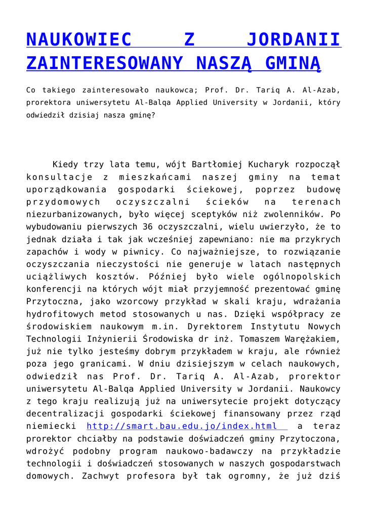 NAUKOWIEC Z JORDANII ZAINTERESOWANY NASZĄ GMINĄ Co takiego zainteresowało naukowca; Prof. Dr. Tariq A. Al-Azab, prorektora uniwersytetu Al-Balqa Applied University w Jordanii, który odwiedził dzisiaj nasza gminę? Kiedy trzy lata temu, wójt Bartłomiej Kucharyk rozpoczął konsultacje z mieszkańcami naszej gminy na temat uporządkowania gospodarki ściekowej, poprzez budowę przydomowych oczyszczalni ścieków na terenach niezurbanizowanych, było więcej sceptyków niż zwolenników. Po wybudowaniu pierwszych 36 oczyszczalni, wielu uwierzyło, że to jednak działa i tak jak wcześniej zapewniano: nie ma przykrych zapachów i wody w piwnicy. Co najważniejsze, to rozwiązanie oczyszczania nieczystości nie generuje w latach następnych uciążliwych kosztów. Później było wiele ogólnopolskich konferencji na których wójt miał przyjemność prezentować gminę Przytoczna, jako wzorcowy przykład w skali kraju, wdrażania hydrofitowych metod stosowanych u nas. Dzięki współpracy ze środowiskiem naukowym m.in. Dyrektorem Instytutu Nowych Technologii Inżynierii Środowiska dr inż. Tomaszem Warężakiem, już nie tylko jesteśmy dobrym przykładem w kraju, ale również poza jego granicami. W dniu dzisiejszym w celach naukowych, odwiedził nas Prof. Dr. Tariq A. Al-Azab, prorektor uniwersytetu Al-Balqa Applied University w Jordanii. Naukowcy z tego kraju realizują już na uniwersytecie projekt dotyczący decentralizacji gospodarki ściekowej finansowany przez rząd niemiecki http://smart.bau.edu.jo/index.html a teraz prorektor chciałby na podstawie doświadczeń gminy Przytoczona, wdrożyć podobny program naukowo-badawczy na przykładzie technologii i doświadczeń stosowanych w naszych gospodarstwach domowych. Zachwyt profesora był tak ogromny, że już dziś podjęto konkretne działania. Do końca przyszłego tygodnia powstanie film promujący w/w technologie, realizowany przez telewizję a finansowany przez Ministerstwo Ochrony Środowiska. Trafi on do ambasad na całym świecie. Czy mogliśmy sobie wymarzyć lepszą promocję gminy Przytoczna??? img_4346 img_4347 img_4348 img_4349 img_4350 img_4354 img_4355 img_4356 img_4357 img_4358 img_4360 img_4361 img_4362 img_4365 img_4366 img_4367 img_4369 img_4373 img_4376 img_4379 img_4381