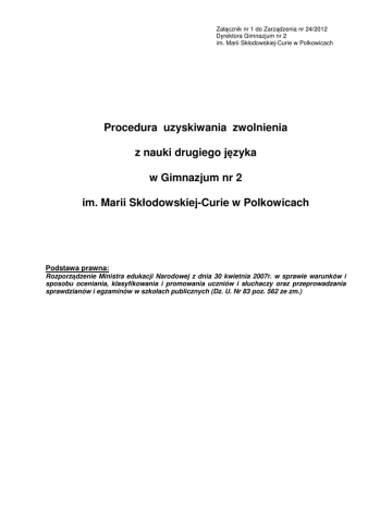 Załącznik nr 1 do Zarządzenia nr 24/2012 Dyrektora Gimnazjum nr 2 im. Marii Skłodowskiej-Curie w Polkowicach Procedura uzyskiwania zwolnienia z nauki drugiego języka w Gimnazjum nr 2 im. Marii Skłodowskiej-Curie w Polkowicach Podstawa prawna: Rozporządzenie Ministra edukacji Narodowej z dnia 30 kwietnia 2007r. w sprawie warunków i sposobu oceniania, klasyfikowania i promowania uczniów i słuchaczy oraz przeprowadzania sprawdzianów i egzaminów w szkołach publicznych (Dz. U. Nr 83 poz. 562 ze zm.) Procedura uzyskiwania zwolnienia z nauki drugiego języka Spis treści: Procedura uzyskiwania zwolnienia z nauki drugiego języka ……………..…..........…………….3 Postanowienia ogólne ….........................……………….……......……………….…….………….4 Wzory załączników ……….......................……………….……......……………….…….………….5 2 Procedura uzyskiwania zwolnienia z nauki drugiego języka obcego 1. Dyrektor szkoły na wniosek rodziców/prawnych opiekunów oraz na podstawie opinii poradni psychologiczno – pedagogicznej, w tym poradni specjalistycznej, zwalnia do końca etapu edukacyjnego ucznia z wadą słuchu, głęboką dysleksją rozwojową, z afazją, z niepełnosprawnościami sprzężonymi lub z autyzmem w tym z zespołem Aspergera z nauki drugiego języka obcego (drugi język obcy – obowiązkowy język nauczany w oddziale klasowym w mniejszym wymiarze godzin zgodnie z ramowym planem nauczania). 2. W przypadku ucznia posiadającego orzeczenie o potrzebie kształcenia specjalnego albo indywidualnego nauczania, zwolnienie z nauki drugiego języka obcego może nastąpić na podstawie tego orzeczenia, na pisemny wniosek rodzica/prawnego opiekuna. 3. Rodzic/prawny opiekun składa w sekretariacie szkoły pisemny wniosek (załącznik nr 1) wraz z oryginałem opinii publicznej poradni psychologiczno – pedagogicznej, w tym poradni specjalistycznej. 4. Dyrektor szkoły wydaje decyzję o zwolnieniu ucznia z nauki drugiego języka do 7 dni roboczych od daty wpływu wniosku. Rodzic/prawny opiekun odbiera decyzję dyrektora w sekretariacie szkoły. Nauczyciel uczący ucznia otrzymuje egzemplarz decyzji od sekretarza szkoły i odnotowuje zwolnienie w dzienniku lekcyjnym, a wychowawca po otrzymaniu informacji w arkuszu ocen ucznia. Czwarty egzemplarz pozostaje w dokumentacji szkolnej ucznia. 5. W przypadku decyzji odmownej rodzicowi/prawnemu opiekunowi przysługuje prawo do odwołania za pośrednictwem organu, który decyzję wydał do Dolnośląskiego Kuratora Oświaty w terminie 14 dni. 6. W przypadku zwolnienia ucznia z nauki drugiego języka obcego wychowawca w dokumentacji przebiegu nauczania ucznia zamiast oceny klasyfikacyjnej wpisuje „zwolniony” albo „zwolniona”. 7. Uczeń zwolniony z danych zajęć edukacyjnych ma obowiązek być obecnym na tych zajęciach. W szczególnych przypadkach, gdy lekcje te są pierwszym bądź ostatnimi zajęciami w danym dniu, uczeń może być zwolniony z tego obowiązku na podstawie pisemnego „Podania” rodzica/prawnego opiekuna/pełnoletniego ucznia (załącznik nr 3). O tym fakcie informowani są nauczyciel uczący danego przedmiotu i wychowawca klasy, Potwierdzają to złożeniem podpisu na „Podaniu” rodzica. Podpisany dokument zostaje u wychowawcy. 8. Uczeń zwolniony z zajęć do domu ma odznaczone w dzienniku nieobecności usprawiedliwione. W czasie gdy uczeń jest zwolniony do domu nie może przebywać na terenie szkoły. 3 Postanowienia ogólne 1. Procedury obowiązują od II semestru roku szkolnego 2012/2013. 2. Nauczyciele zostaną zapoznani przez dyrektora z niniejszymi procedurami na zebraniu Rady Pedagogicznej 3. Z niniejszymi procedurami godzinie wychowawczej. zapozna uczniów wychowawca klasy na najbliższej 4. Rodzice/prawni opiekunowie zostaną zapoznani z powyższymi procedurami przez wychowawcę klasy na najbliższym zebraniu. 5. Na początku każdego roku szkolnego dyrektor szkoły zapoznaje nauczycieli z w/w procedurami (zebranie organizacyjne Rady Pedagogicznej). 6. Na początku każdego roku szkolnego wychowawca klasy zapoznaje rodziców/prawnych opiekunów z w/w procedurami na pierwszym zebraniu klasowym. 4 Załącznik nr 1 Polkowice .................................................... ...................................................................... imię, nazwisko rodzica/prawnego opiekuna ...................................................................... ulica ...................................................................... miejscowość Dyrektor Gimnazjum nr 2 im. Marii Skłodowskie - Curie w Polkowicach WNIOSEK Zwracam się z prośbą o zwolnienie z zajęć nauki drugiego języka obcego*: angielskiego, francuskiego, niemieckiego** syna/córki** ……………………..………………..………....……….. Imię i nazwisko PESEL........................................ ur. ................................... data urodzenia ucznia ……………………...…………..………………….………..…….……………. na podstawie złożonych klasa, szkoła dokumentów. .......................................................................... podpis wnioskodawcy W załączeniu: 1. ……………………………………………………….. * drugi język obcy – obowiązkowy język nauczany w oddziale klasowym w mniejszym wymiarze godzin zgodnie z ramowym planem nauczania ** niepotrzebne skreślić 5 Załącznik nr 2 Polkowice ................................................... (Symbol i nr z rzeczowego wykazu akt) D E C Y Z J A Nr …./20…. w sprawie zwolnienie ucznia z nauki drugiego języka obcego Na podstawie § 10 ust. 1 i 2 Rozporządzenia MEN z dnia 20 sierpnia 2010r. w sprawie warunków i sposobu oceniania, klasyfikowania i promowania uczniów i słuchaczy oraz przeprowadzania sprawdzianów i egzaminów w szkołach publicznych ( Dz. U. z 2010r. Nr 156, poz. 1046) na pise