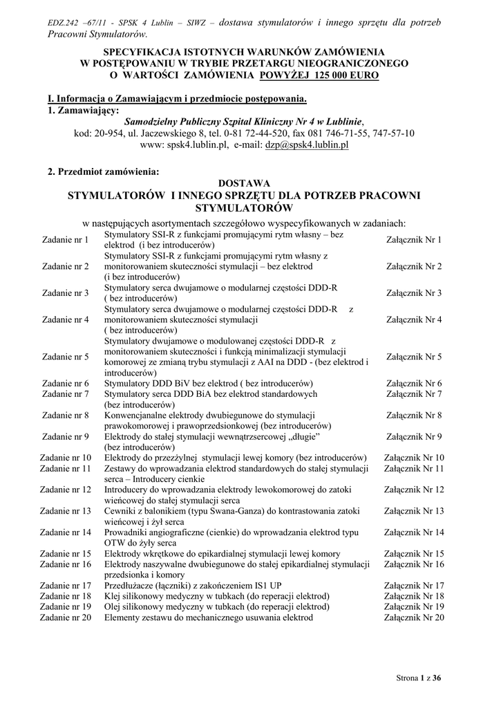 EDZ.242 –67/11 - SPSK 4 Lublin – SIWZ – dostawa stymulatorów i innego sprzętu dla potrzeb Pracowni Stymulatorów. SPECYFIKACJA ISTOTNYCH WARUNKÓW ZAMÓWIENIA W POSTĘPOWANIU W TRYBIE PRZETARGU NIEOGRANICZONEGO O WARTOŚCI ZAMÓWIENIA POWYŻEJ 125 000 EURO I. Informacja o Zamawiającym i przedmiocie postępowania. 1. Zamawiający: Samodzielny Publiczny Szpital Kliniczny Nr 4 w Lublinie, kod: 20-954, ul. Jaczewskiego 8, tel. 0-81 72-44-520, fax 081 746-71-55, 747-57-10 www: spsk4.lublin.pl, e-mail: [email protected] 2. Przedmiot zamówienia: DOSTAWA STYMULATORÓW I INNEGO SPRZĘTU DLA POTRZEB PRACOWNI STYMULATORÓW w następujących asortymentach szczegółowo wyspecyfikowanych w zadaniach: Zadanie nr 1 Zadanie nr 2 Zadanie nr 3 Zadanie nr 4 Zadanie nr 5 Zadanie nr 6 Zadanie nr 7 Zadanie nr 8 Zadanie nr 9 Zadanie nr 10 Zadanie nr 11 Zadanie nr 12 Zadanie nr 13 Zadanie nr 14 Zadanie nr 15 Zadanie nr 16 Zadanie nr 17 Zadanie nr 18 Zadanie nr 19 Zadanie nr 20 Stymulatory SSI-R z funkcjami promującymi rytm własny – bez elektrod (i bez introducerów) Stymulatory SSI-R z funkcjami promującymi rytm własny z monitorowaniem skuteczności stymulacji – bez elektrod (i bez introducerów) Stymulatory serca dwujamowe o modularnej częstości DDD-R ( bez introducerów) Stymulatory serca dwujamowe o modularnej częstości DDD-R z monitorowaniem skuteczności stymulacji ( bez introducerów) Stymulatory dwujamowe o modulowanej częstości DDD-R z monitorowaniem skuteczności i funkcją minimalizacji stymulacji komorowej ze zmianą trybu stymulacji z AAI na DDD - (bez elektrod i introducerów) Stymulatory DDD BiV bez elektrod ( bez introducerów) Stymulatory serca DDD BiA bez elektrod standardowych (bez introducerów) Konwencjanalne elektrody dwubiegunowe do stymulacji prawokomorowej i prawoprzedsionkowej (bez introducerów) Elektrody do stałej stymulacji wewnątrzsercowej „długie” (bez introducerów) Elektrody do przezżylnej stymulacji lewej komory (bez introducerów) Zestawy do wprowadzania elektrod standardowych do stałej stymulacji serca – Introducery cienkie Introducery do wprowadzania elektrody lewokomorowej do zatoki wieńcowej do stałej stymulacji serca Cewniki z balonikiem (typu Swana-Ganza) do kontrastowania zatoki wieńcowej i żył serca Prowadniki angiograficzne (cienkie) do wprowadzania elektrod typu OTW do żyły serca Elektrody wkrętkowe do epikardialnej stymulacji lewej komory Elektrody naszywalne dwubiegunowe do stałej epikardialnej stymulacji przedsionka i komory Przedłużacze (łączniki) z zakończeniem IS1 UP Klej silikonowy medyczny w tubkach (do reperacji elektrod) Olej silikonowy medyczny w tubkach (do reperacji elektrod) Elementy zestawu do mechanicznego usuwania elektrod Załącznik Nr 1 Załącznik Nr 2 Załącznik Nr 3 Załącznik Nr 4 Załącznik Nr 5 Załącznik Nr 6 Załącznik Nr 7 Załącznik Nr 8 Załącznik Nr 9 Załącznik Nr 10 Załącznik Nr 11 Załącznik Nr 12 Załącznik Nr 13 Załącznik Nr 14 Załącznik Nr 15 Załącznik Nr 16 Załącznik Nr 17 Załącznik Nr 18 Załącznik Nr 19 Załącznik Nr 20 Strona 1 z 36 EDZ.242 –67/11 - SPSK 4 Lublin – SIWZ – dostawa stymulatorów i innego sprzętu dla potrzeb Pracowni Stymulatorów. Szczegółowe wymagania w stosunku do w/w asortymentu zamówienia i zakres zamówienia zawiera „Specyfikacja istotnych warunków zamówienia”, załącznik nr 1-20. Każde z powyższych zadań będzie podlegało odrębnej procedurze przetargowej związanej z wyborem oferty i nie istnieje obowiązek składania ofert na wszystkie z zadań. UWAGA: Zamawiający nie dopuszcza składania ofert wariantowych ani częściowych w zakresie pakietów, w których Wykonawca przystępuje do postępowania. Zamawiający nie zamierza udzielić zamówień uzupełniających, o których mowa w art. 67 ust.1 pkt. 7 Prawa zamówień publicznych. Zamawiający nie planuje zawarcia umowy ramowej ani dynamicznego systemu zakupów i zastosowania aukcji elektronicznej. Zamawiający nie wymaga, aby całość zamówienia była wykonana samodzielnie przez Wykonawcę. Oznaczenie wg Wspólnego Słownika Zamówień CPV: 33.15.82.10-Stymulatory II. Wymagany termin realizacji umowy Dostawy sukcesywne w ciągu 12 miesięcy od dnia zawarcia umowy. Dla zadań nr 1, 2, 3, 4, 5, 6, 7 i 8 Zamawiający wymaga utworzenia w Pracowni Stymulatorów w ciągu 7 dni depozytu w ilości do 1/6 ogólnej ilości asortymentu objętego zamówieniem, który – po otrzymaniu informacji o wykorzystaniu sprzętu będzie uzupełniany w ciągu 3 dni roboczych. Dla pozostałych zadań - dostawy cząstkowe na podstawie składanych sukcesywnie zamówień – nie dłużej niż w 5 dni roboczych. III. Opis warunków udziału w postępowaniu oraz opis sposobu dokonywania oceny spełnienia tych warunków: A) O udzielenia zamówienia mogą ubiegać się Wykonawcy, którzy nie podlegają wykluczeniu z postępowania zgodnie z art. 24 pzp oraz spełniają warunki dotyczące: a) posiadania uprawnień do wykonywania określonej działalności lub czynności, jeżeli przepisy prawa nakładają obowiązek ich posiadania – w prowadzonym postępowaniu nie zachodzi taka okoliczność; b) posiadania wiedzy i doświadczenia – Zamawiający uzna spełnienie warunku udziału w postępowaniu, jeśli wykonawca wykonał w okresie ostatnich trzech lat przed upływem terminu składania ofert, a jeżeli okres prowadzenia działalności jest krótszy – w tym okresie - co najmniej jedno zamówienie, którego przedmiotem była dostawa stymulatorów i/lub sprzętu do elektroterapii i/lub innego sprzętu medycznego jednorazowego użytku o wartości nie mniejszej niż 1 783 000,00 PLN w przypadku składania ofert na wszystkie pakiety, a w przypadku składania ofert na wybrane pakiety – o wartości nie niższej niż suma wartości podanych w poniższej tabeli - łącznie dla zadań, na które składana jest oferta Nr zadania 1. 2. Poziom warunku (zł) Nr zadania 11 150 000,00 Poziom warunku (