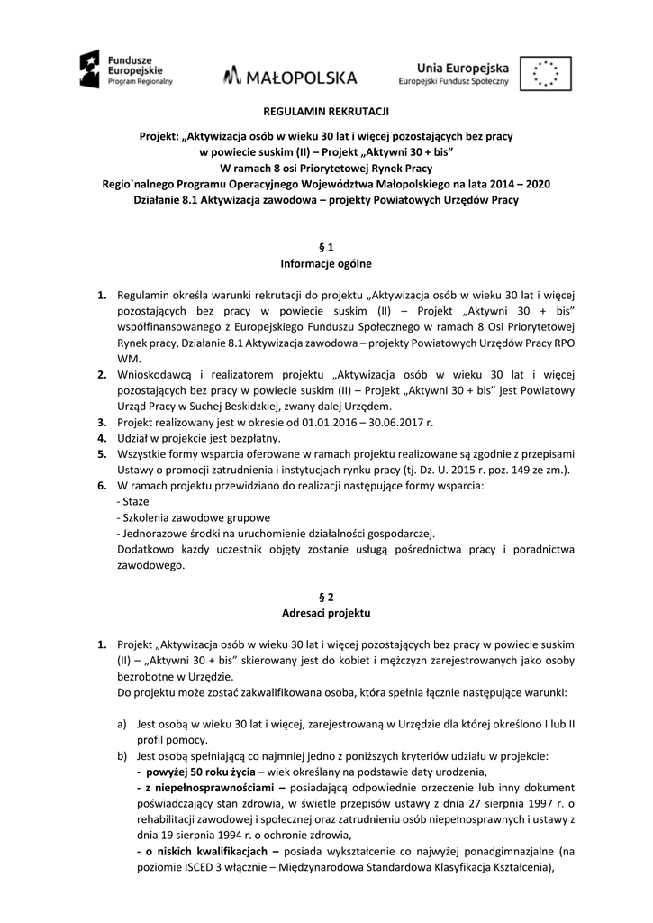 REGULAMIN REKRUTACJI Projekt: „Aktywizacja osób w wieku 30 lat i więcej pozostających bez pracy w powiecie suskim (II) – Projekt „Aktywni 30 + bis” W ramach 8 osi Priorytetowej Rynek Pracy Regio`nalnego Programu Operacyjnego Województwa Małopolskiego na lata 2014 – 2020 Działanie 8.1 Aktywizacja zawodowa – projekty Powiatowych Urzędów Pracy §1 Informacje ogólne 1. Regulamin określa warunki rekrutacji do projektu „Aktywizacja osób w wieku 30 lat i więcej pozostających bez pracy w powiecie suskim (II) – Projekt „Aktywni 30 + bis” współfinansowanego z Europejskiego Funduszu Społecznego w ramach 8 Osi Priorytetowej Rynek pracy, Działanie 8.1 Aktywizacja zawodowa – projekty Powiatowych Urzędów Pracy RPO WM. 2. Wnioskodawcą i realizatorem projektu „Aktywizacja osób w wieku 30 lat i więcej pozostających bez pracy w powiecie suskim (II) – Projekt „Aktywni 30 + bis” jest Powiatowy Urząd Pracy w Suchej Beskidzkiej, zwany dalej Urzędem. 3. Projekt realizowany jest w okresie od 01.01.2016 – 30.06.2017 r. 4. Udział w projekcie jest bezpłatny. 5. Wszystkie formy wsparcia oferowane w ramach projektu realizowane są zgodnie z przepisami Ustawy o promocji zatrudnienia i instytucjach rynku pracy (tj. Dz. U. 2015 r. poz. 149 ze zm.). 6. W ramach projektu przewidziano do realizacji następujące formy wsparcia: - Staże - Szkolenia zawodowe grupowe - Jednorazowe środki na uruchomienie działalności gospodarczej. Dodatkowo każdy uczestnik objęty zostanie usługą pośrednictwa pracy i poradnictwa zawodowego. §2 Adresaci projektu 1. Projekt „Aktywizacja osób w wieku 30 lat i więcej pozostających bez pracy w powiecie suskim (II) – „Aktywni 30 + bis” skierowany jest do kobiet i mężczyzn zarejestrowanych jako osoby bezrobotne w Urzędzie. Do projektu może zostać zakwalifikowana osoba, która spełnia łącznie następujące warunki: a) Jest osobą w wieku 30 lat i więcej, zarejestrowaną w Urzędzie dla której określono I lub II profil pomocy. b) Jest osobą spełniającą co najmniej jedno z poniższych kryteriów udziału w projekcie: - powyżej 50 roku życia – wiek określany na podstawie daty urodzenia, - z niepełnosprawnościami – posiadającą odpowiednie orzeczenie lub inny dokument poświadczający stan zdrowia, w świetle przepisów ustawy z dnia 27 sierpnia 1997 r. o rehabilitacji zawodowej i społecznej oraz zatrudnieniu osób niepełnosprawnych i ustawy z dnia 19 sierpnia 1994 r. o ochronie zdrowia, - o niskich kwalifikacjach – posiada wykształcenie co najwyżej ponadgimnazjalne (na poziomie ISCED 3 włącznie – Międzynarodowa Standardowa Klasyfikacja Kształcenia), - długotrwale bezrobotną – pozostająca w ewidencji PUP w suchej Beskidzkiej nieprzerwanie przez okres ponad 12 miesięcy, - kobietą. 2. Powyższe warunki uczestnictwa w projekcie weryfikują pracownicy merytoryczni odpowiedzialni za udzielenie danej formy wsparcia. 3. W związku z koniecznością objęcia wsparciem osób będących w najtrudniejszej sytuacji na rynku pracy oraz realizacją obligatoryjnych wskaźników dotyczących projektu, pierwszeństwo do udziału w projekcie będą miały osoby spełniające kilka kryteriów łącznie np.: osoba długotrwale bezrobotna o niskich kwalifikacjach. §3 Zasady Rekrutacji 1. Rekrutacja do projektu będzie prowadzona zgodnie z harmonogramem realizacji projektu, i uzależniona będzie od dostępności środków finansowych przewidzianych na realizację poszczególnych form wsparcia. Planuje się zrekrutować wszystkie osoby do projektu w 2016r. 2. Rekrutacja na staż będzie miała charakter ciągły, natomiast rekrutacja na szkolenia grupowe oraz rekrutacja dotycząca wsparcia na uruchomienie działalności gospodarczej rozpocznie się odpowiednim naborem wniosków. 3. Informacja o naborze na poszczególne formy wsparcia zostanie zamieszczona na tablicy informacyjnej w siedzibie Urzędu oraz na stronie internetowej www.pupsuchabeskidzka.pl. 4. Osoby bezrobotne zainteresowane udziałem w projekcie powinny się zgłosić do pracownika merytorycznego odpowiedzialnego za realizację danej formy wsparcia i złożyć Formularz rekrutacyjny wraz z odpowiednim do formy wsparcia wnioskiem - o ile jest wymagany. 5. Wnioski wymagane są przy ubieganiu się o skierowanie na szkolenie grupowe lub wsparcie na uruchomienie działalności gospodarczej. 6. Wnioski o zorganizowanie stażu składa pracodawca. 7. Formularz rekrutacyjny oraz wnioski dostępne są w siedzibie i na stronie internetowej Urzędu. 8. Formularz rekrutacyjny oraz wnioski, o których mowa powyżej winny być złożone w siedzibie Urzędu u pracownika merytorycznego lub dostarczone drogą pocztową (liczy się data wpływu). 9. Rekrutacja do projektu przebiegać będzie zgodnie z zasadą równości szans, w tym zasadą równości płci aby zapewnić równy dostęp zarówno dla kobiet i mężczyzn znajdujących się w grupie potencjalnych uczestniczek/uczestników projektu. §4 Etapy Rekrutacji 1. Rekrutacja do projektu przebiegać będzie według następujących etapów: ETAP I – przyjmowanie formularzy rekrutacyjnych wraz z wnioskami (jeśli są wymagane). ETAP II - weryfikacja kryteriów kwalifikowalności do projektu (określonych w § 2) przez pracownika merytorycznego, na podstawie Formularza rekrutacyjnego. ETAP III – kwalifikacja do projektu (w przypadku pozytywnego wyniku etapu II) według następujących schematów w zależności od formy wsparcia: a) Schemat doboru uczestników na staż: - Osoby zainteresowane skorzystaniem ze stażu, kierowane będą przez doradcę klienta na rozmowę kwalifikacyjną na zgłoszone wolne miejsce stażu do organizatora, - Organizator stażu dokonuje ostatecznego wyboru kandydata/kandydatki, - W przypadku niedostępności danej oferty z powodu wyboru przez organizatora innej/go kandydatki/kandydata, osoby zainteresowane tą formą wsparcia mogą korzystać z innych propozycji stażowych w rama