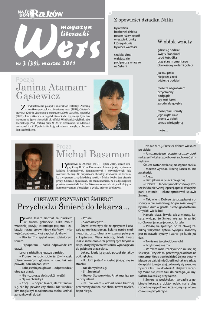 magazyn literacki Wers nr 3 (39), marzec 2011 Z opowieści dziadka Nitki była warta bochenek chleba potem już tylko pół wreszcie kromkę któregoś dnia była bez wartości sztabka złota walająca się pod pryczą w łagrze na Syberii Poezja Janina AtamanGąsiewicz Z wykształcenia plastyk i instruktor teatralny. Autorką tomików poetyckich: Zwodzony most (1989), Odcienie szarości (2004), Rozmowy z mistrzem (2005) Jesteśmy igraszką (2007). Laureatka wielu nagród literackich. Jej poezja była tłumaczona na język słowacki i ukraiński. Współzałożycielka klubu literackiego Pod Drabiną przy WDK w Rzeszowie. W oddziale rzeszowskim ZLP pełniła funkcję sekretarza zarządu, a obecnie jest skarbnikiem. Proza Michał Basamon D ebiutował w „Wersie” (nr 31 – lipiec 2010). Uczeń drugiej klasy II LO w Rzeszowie. Interesuje się czytaniem książek kryminalnych, fantastycznych i obyczajowych, jak również chemią. W przyszłości chciałby studiować na kierunku związanym z tą dziedziną nauki. – Moim hobby jest pisanie prozy. Obecnie opowiadań, ale mam nadzieję, że kiedyś napiszę powieść – mówi Michał. Publikowane opowiadanie jest kolejnym humorystycznym obrazkiem z cyklu, którym debiutował. CIEKAWE PRZYPADKI ŚMIERCI Przychodzi Śmierć do lekarza... P ewien lekarz siedział za biurkiem w swoim gabinecie. Kilka minut wcześniej przyjął ostatniego pacjenta i załatwiał resztę spraw. Kiedy skończył i miał wyjść z gabinetu, ktoś zapukał do drzwi. – Kto tam? – spytał nieco zdziwionym tonem. – Hipopotam – padła odpowiedź zza drzwi. Lekarz zdziwił się jeszcze bardziej. – Proszę nie robić sobie żartów! – rzekł zdenerwowanym głosem. – Kim, tak naprawdę, pan lub pani jest? – Babą z żabą na głowie – odpowiedział głos zza drzwi. – Nie no, proszę dać spokój i wejść! – Oj, nie chciałbyś… – Chcę… – odparł lekarz, ale zastanowił się. Nie był pewien czy chciał. Nie wiedział kim mogła być ta tajemnicza osoba. Jednak zaryzykował i dodał: – Proszę… – Skoro nalegasz… Drzwi otworzyły się ze zgrzytem i ukazały tajemniczą postać. Była to osoba średniego wzrostu, ubrana w czarną pelerynę z kapturem. Miała kościstą, bladą twarz i takie same dłonie. W prawej ręce trzymała sierp, który błyszczał w słońcu wpadającym do gabinetu przez okno. Lekarz, kiedy ją ujrzał, poczuł się jakby połknął głaz. – K…kim jesteś? – spytał, jąkając się ze strachu. – Nie domyślasz się? – Ś…Śmiercią? – Brawo! Sto punktów. A jak myślisz, po co przyszłam? – N…nie wiem – odparł coraz bardziej przerażony doktor. Nie chciał nawet myśleć, że po niego. W obłok wzięty gdzie się podział święty Franciszek spod kościółka przy starym cmentarzu obwieszony wotami gołębi już mu ptaki nie jedzą z ręki gdzie się podział może za nagrobkiem przyczajony podgląda czy ktoś karmi zgłodniałe gołębie może ptaki uniosły jego wątłe ciało prosto w obłoki co nad wieżą płyną może… – No nie żartuj. Przecież dobrze wiesz, że po ciebie. – A m…może po receptę na s…syropek na kaszel? – Lekarz próbował zachować zimną krew. Śmierć zastanowiła się. Następnie rzekła: – Możesz wypisać. Trochę kaszlu mi nie zaszkodzi. – Ale… – Pisz, jak masz pisać i nie gadaj! – Dobrze… Jeden syropek sosnowy. Proszę iść do pierwszej lepszej apteki. Wszędzie pani dostanie – lekarz spróbował spławić Śmierć. – Tak, wiem. Dobrze, że przepisałeś sosnowy, a nie świerkowy, bo po świerkowym by mnie kłuło w gardle. Kiedyś go dostałam. Ohyda! I wielki ból! Nastała cisza. Trwała tak z minutę. Lekarz, widząc, że Śmierć nie zamierza iść, spróbował jeszcze jednego fortelu: – Proszę się śpieszyć, bo za chwilę zamkną wszystkie apteki. Syropek sosnowy jest naprawdę pyszny i warto go kupić już dziś. – To nie ma tu całodobowych? – Przykro mi, nie ma. – W takim razie rzeczywiście muszę się śpieszyć. Przyszła mi przerażająca ochota na ten syrop, kiedy powiedziałeś, że jest pyszny. Muszę go dzisiaj mieć! Jeśli jednak nie zdążę do apteki, to najwyżej zadowolę się sosnową żywicą z lasu. Pa, doktorku! I dzięki za receptę! Może nie jesteś taki do niczego, jak myślałam. Na coś się przydajesz. I Śmierć w podskokach wypadła z gabinetu lekarza, a doktor odetchnął z ulgą i oparł się wygodnie o krzesło, myśląc o tym, co mu się przydarzyło. WERS nr 39, marzec 2011 Poezja Monika Kusztal Rodzice Reklamówka Tańczyła pijana W niebieskiej sukience Deptała chodnikom po palcach Na rogu ulicy przejechał ją tramwaj Zapłakała szelestem Otrzepała kolana A wiatr Znowu porwał ją do tańca Linie papilarne zawiązane wiecznością Zamknięte dwie dłonie Szyfrem Zagląda księżyc szpitalną szybą Sztorm Tratwa pościeli Czerń pod poduszką Nad otchłanią różaniec łez linia rąk trzyma przy życiu U rodziła się 31.01. 1990 r. w Stalowej Woli. Jest studentką drugiego roku filologii polskiej na Uniwersytecie Jagiellońskim. Interesuje się tańcem, literaturą, teatrem. Jej pierwszy tomik Oparta o deszcz, wydany w 2007 r., otrzymał nagrodę Związku Literatów Polskich za najlepszy debiut. Jej wiersze drukowane były na łamach tygodnika „Sztafeta”, kwartalnika „Nadwisłocze”, miesięcznika „Nasz Dom – Rzeszów”. Zostały także przetłumaczone na język słowacki i drukowane w tamtejszej prasie. Monika od kilku lat uczestniczy w Warsztatach Poetyckich prowadzonych w Filii nr 4 Miejskiej Biblioteki Publicznej w Stalowej Woli. Poezja Wiesław Zieliński O d urodzenia mieszka w Rzeszowie. Wydał zbiorki poezji: Zabawa w dorosłych (1979), Bogowie moich czterech ścian (1981), Niestałość wiatru (1993), Przemijanie (1996), Odmiany miłości (2005), Syndrom Nabokowa (2007), Syndrom uczuć (2008), Żart Pana Boga (2009 i 2010 w wersji polskiej i angielski