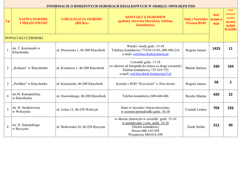 INFORMACJE O RODZINNYCH OGRODACH DZIAŁKOWYCH W OKRĘGU OPOLSKIM PZD Lp NAZWA OGRODU I MIEJSCOWOŚĆ Ilość Ilość wolnych działek LOKALIZACJA OGRODU (BIURA) KONTAKT Z OGRODEM (godziny otwarcia biura/kasy telefony kontaktowe) ul. Dworcowa 1, 46-200 Kluczbork Wtorki i środy godz. 15-18 Telefony kontaktowe 77/418-15-85, 608-496-216 e-mail: [email protected] Rogoża Janusz 1425 11 Błażek Dariusz 330 104 Imię i Nazwisko działek w Prezesa ROD ROD wg stanu na dzień 31.12.2015 POWIAT KLUCZBORSKI 1 im. T. Kościuszki w Kluczborku 2 ,,Kolejarz” w Kluczborku ul. Kwiatowa 1, 46-200 Kluczbork Czwartki godz. 17-18 (w okresie od listopada do marca co drugi czwartek) Telefon kontaktowy 733-419-735 e-mail: [email protected] 3 ,,Prefabet” w Kluczborku ul. Kościuszki, 46-200 Kluczbork Kontakt z ROD "Kościuszki" w Kluczborku Rogoża Janusz 58 2 4 im.M. Konopnickiej w Kluczborku ul. Ossowskiego, 46-200 Kluczbork Telefon kontaktowy 608-648-686 Reszka Marian 420 22 5 im. H. Sienkiewicza w Wołczynie ul. Leśna 12, 46-250 Wołczyn biuro w styczniu i lutym nieczynne, w sezonie-poniedziałki godz. 16-18 Czernik Lesław 704 226 w okresie zimowym w czwartki godz. 15-16 w sezonie pon. i czw. godz. 15-16 Telefon kontaktowy Prezes 608-142-958 Wiceprezes 880-014-299 Żurek Stefan 312 99 6 im. H. Zamojskiego w Byczynie ul. Borkowska 24, 46-220 Byczyna
