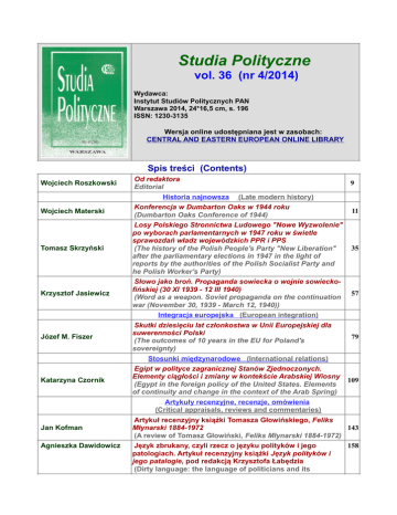 Studia Polityczne vol. 36 (nr 4/2014) Wydawca: Instytut Studiów Politycznych PAN Warszawa 2014, 24*16,5 cm, s. 196 ISSN: 1230-3135 Wersja online udostępniana jest w zasobach: CENTRAL AND EASTERN EUROPEAN ONLINE LIBRARY Spis treści (Contents) Wojciech Roszkowski Od redaktora Editorial Historia najnowsza Wojciech Materski Tomasz Skrzyński Krzysztof Jasiewicz Józef M. Fiszer Katarzyna Czornik Jan Kofman Agnieszka Dawidowicz 9 (Late modern history) Konferencja w Dumbarton Oaks w 1944 roku (Dumbarton Oaks Conference of 1944) Losy Polskiego Stronnictwa Ludowego "Nowe Wyzwolenie" po wyborach parlamentarnych w 1947 roku w świetle sprawozdań władz wojewódzkich PPR i PPS (The history of the Polish People's Party "New Liberation" after the parliamentary elections in 1947 in the light of reports by the authorities of the Polish Socialist Party and he Polish Worker's Party) Słowo jako broń. Propaganda sowiecka o wojnie sowieckofińskiej (30 XI 1939 - 12 III 1940) (Word as a weapon. Soviet propaganda on the continuation war (November 30, 1939 - March 12, 1940)) Integracja europejska (European integration) Skutki dziesięciu lat członkostwa w Unii Europejskiej dla suwerenności Polski (The outcomes of 10 years in the EU for Poland's sovereignty) Stosunki międzynarodowe (International relations) Egipt w polityce zagranicznej Stanów Zjednoczonych. Elementy ciągłości i zmiany w kontekście Arabskiej Wiosny (Egypt in the foreign policy of the United States. Elements of continuity and change in the context of the Arab Spring) 11 35 57 79 109 Artykuły recenzyjne, recenzje, omówienia (Critical appraisals, reviews and commentaries) Artykuł recenzyjny książki Tomasza Głowińskiego, Feliks Młynarski 1884-1972 143 (A review of Tomasz Głowiński, Feliks Młynarski 1884-1972) Język zbrukany, czyli rzecz o języku polityków i jego patologiach. Artykuł recenzyjny książki Język polityków i jego patalogie, pod redakcją Krzysztofa Łabędzia (Dirty language: the language of politicians and its 158 pathologies. A review of Język polityków i jego patologie (The language of politicians and its pathologies), edited by Krzysztof Łabędź) Agnieszka K. Cianciara Paweł A. Leszczyński Marek W. Kozak Wojciech Roszkowski Wojciech Roszkowski Jacek Bartyzel Jacek Bartyzel Unia Europejska - Chiny. Dziś i w przyszłości, pod redakcją Józefa M. Fiszera (Unia Europejska - Chiny. Dziś i w przyszłości (European Union and China. Current and past times), edited by Józef M. Fiszer) Influencing Tomorrow. Future Challenges for British Foreign Policy, pod redakcją Douglasa Alexandra i Iana Kearnsa (Influencing Tomorrow. Future Challenges for British Foreign Policy, edited by Douglas Alexander and Ian Kearns) Andrzej Harasimowicz, Bezpieczeństwo Polski 1918-2004. Granice, system międzynarodowy, siła własna (Andrzej Harasimowicz, Bezpieczeństwo Polski 1918-2004. Granice, system międzynarodowy, siła własna (Polish Safety 1918-2004. The Borders, the International Order, the Country's Own Strenght) Noty o książkach (Bibliographical Notes) Anne Applebaum, Za żelazną kurtyną. Ujarzmienie Europy Wschodniej 1944-1956 (Iron curtain: the crushing of Eastern Europe, 1944-1956), Świat Książki, Warszawa 2013, ss. 662. Bozidar Jezernik, Naga wyspa. Gułag Tity (Naged Island. Tito's Gulag), Wydawnictwo Czarne, Wołowiec 2013, ss. 357 Javier Barraycoa, Cataluňa Hispana. Historias sorprendentes de la espaňolidad de Cataluňa y el fraude del nacionalismo (Spanish Catalonia. Surprising stories about the Spanishness of Catalonia and the deceit of nationalism), LibrosLibres, Madrid 2013, ss. 300 Carl Schmitt, Teologia polityczna 2. Legenda o wykluczeniu wszelkiej politycznej teologii (Political theology II. The Myth of the closure of any political theology), Wydawnictwo Aletheia, Warszawa 2014, ss. 144 Contents 170 174 185 193 194 194 195