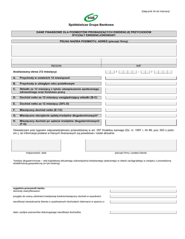 Załącznik 34 do Instrukcji DANE FINANSOWE DLA PODMIOTÓW PROWADZĄCYCH EWIDENCJĘ PRZYCHODÓW RYCZAŁT EWIDENCJONOWANY PEŁNA NAZWA PODMIOTU, ADRES (pieczęć firmy) REGON Analizowany okres (12 miesięcy) A. Przychody w ostatnich 12 miesiącach B. Przychody w ubiegłym roku podatkowym C. Składki za 12 miesięcy z tytułu ubezpieczenia społecznego, zdrowotnego oraz funduszu pracy D. Dochód netto za 12 miesięcy uwzględniający składki (B-C) E. Dochód netto za 12 miesięcy (30% D) F. Miesięczny dochód netto (E÷12) G. Miesięczne obciążenie spłatą kredytów długoterminowych* H. Miesięczny dochód po spłacie kredytów długoterminowych (F-G) NIP / - / Oświadczam pod rygorem odpowiedzialności przewidzianej w art. 297 Kodeksu karnego (Dz. U. 1997 r. Nr 88, poz. 553 z późn. zm.), że informacje podane w Danych finansowych są prawdziwe i nadal aktualne. miejscowość, data pieczęć firmy i podpis klienta *kredyty długoterminowe – rata kapitałowa aktualnego zobowiązania kredytowego spłacanego w ratach zaciągniętego w związku z prowadzoną działalnością gospodarczą (w tym leasing) wypełnia pracownik banku dochody zweryfikowano: przyjęto do oceny zdolności kredytowej średniomiesięczny dochód w wysokości: weryfikacji oświadczenia klienta o uzyskiwanych dochodach dokonano w oparciu o: data i podpis pracownika dokonującego weryfikacji dochodów