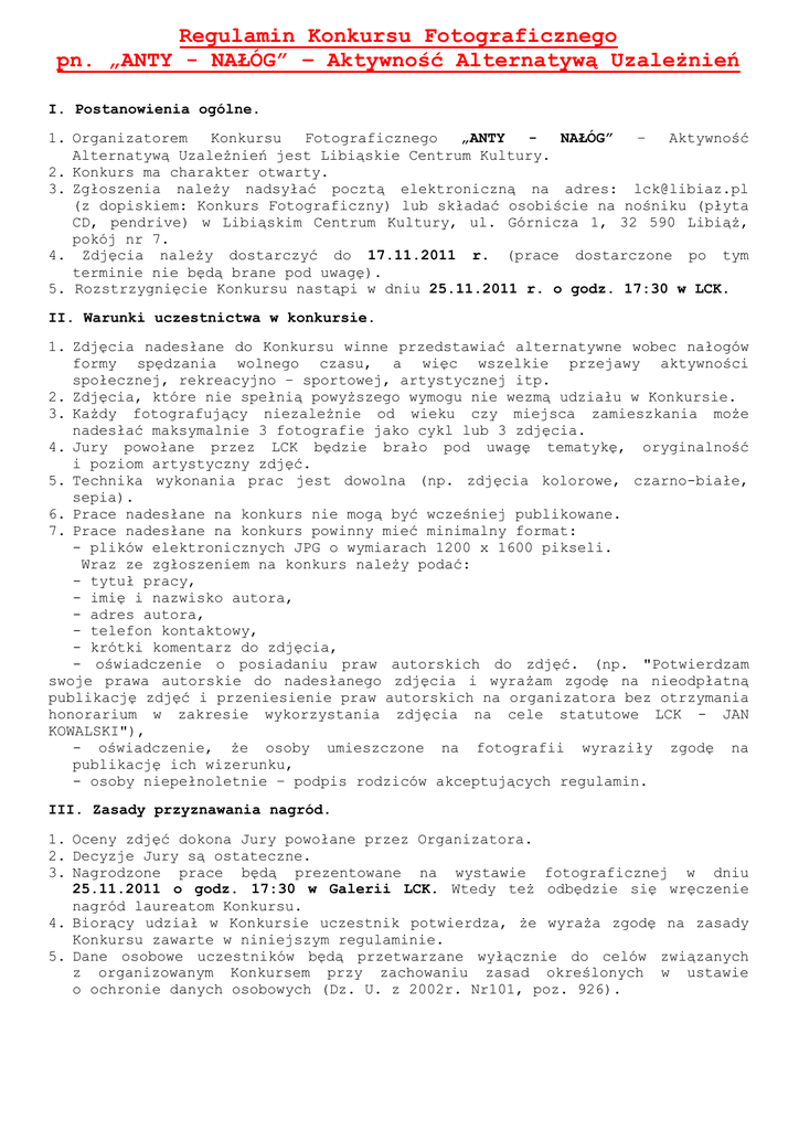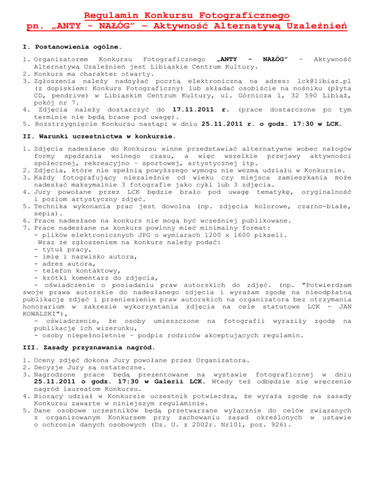 Regulamin Konkursu Fotograficznego pn. „ANTY - NAŁÓG” – Aktywność Alternatywą Uzależnień I. Postanowienia ogólne. 1. Organizatorem Konkursu Fotograficznego „ANTY NAŁÓG” – Aktywność Alternatywą Uzależnień jest Libiąskie Centrum Kultury. 2. Konkurs ma charakter otwarty. 3. Zgłoszenia należy nadsyłać pocztą elektroniczną na adres: [email protected] (z dopiskiem: Konkurs Fotograficzny) lub składać osobiście na nośniku (płyta CD, pendrive) w Libiąskim Centrum Kultury, ul. Górnicza 1, 32 590 Libiąż, pokój nr 7. 4. Zdjęcia należy dostarczyć do 17.11.2011 r. (prace dostarczone po tym terminie nie będą brane pod uwagę). 5. Rozstrzygnięcie Konkursu nastąpi w dniu 25.11.2011 r. o godz. 17:30 w LCK. II. Warunki uczestnictwa w konkursie. 1. Zdjęcia nadesłane do Konkursu winne przedstawiać alternatywne wobec nałogów formy spędzania wolnego czasu, a więc wszelkie przejawy aktywności społecznej, rekreacyjno – sportowej, artystycznej itp. 2. Zdjęcia, które nie spełnią powyższego wymogu nie wezmą udziału w Konkursie. 3. Każdy fotografujący niezależnie od wieku czy miejsca zamieszkania może nadesłać maksymalnie 3 fotografie jako cykl lub 3 zdjęcia. 4. Jury powołane przez LCK będzie brało pod uwagę tematykę, oryginalność i poziom artystyczny zdjęć. 5. Technika wykonania prac jest dowolna (np. zdjęcia kolorowe, czarno-białe, sepia). 6. Prace nadesłane na konkurs nie mogą być wcześniej publikowane. 7. Prace nadesłane na konkurs powinny mieć minimalny format: - plików elektronicznych JPG o wymiarach 1200 x 1600 pikseli. Wraz ze zgłoszeniem na konkurs należy podać: - tytuł pracy, - imię i nazwisko autora, - adres autora, - telefon kontaktowy, - krótki komentarz do zdjęcia, - oświadczenie o posiadaniu praw autorskich do zdjęć. (np. "Potwierdzam swoje prawa autorskie do nadesłanego zdjęcia i wyrażam zgodę na nieodpłatną publikację zdjęć i przeniesienie praw autorskich na organizatora bez otrzymania honorarium w zakresie wykorzystania zdjęcia na cele statutowe LCK - JAN KOWALSKI"), - oświadczenie, że osoby umieszczone na fotografii wyraziły zgodę na publikację ich wizerunku, - osoby niepełnoletnie – podpis rodziców akceptujących regulamin. III. Zasady przyznawania nagród. 1. Oceny zdjęć dokona Jury powołane przez Organizatora. 2. Decyzje Jury są ostateczne. 3. Nagrodzone prace będą prezentowane na wystawie fotograficznej w dniu 25.11.2011 o godz. 17:30 w Galerii LCK. Wtedy też odbędzie się wręczenie nagród laureatom Konkursu. 4. Biorący udział w Konkursie uczestnik potwierdza, że wyraża zgodę na zasady Konkursu zawarte w niniejszym regulaminie. 5. Dane osobowe uczestników będą przetwarzane wyłącznie do celów związanych z organizowanym Konkursem przy zachowaniu zasad określonych w ustawie o ochronie danych osobowych (Dz. U. z 2002r. Nr101, poz. 926).