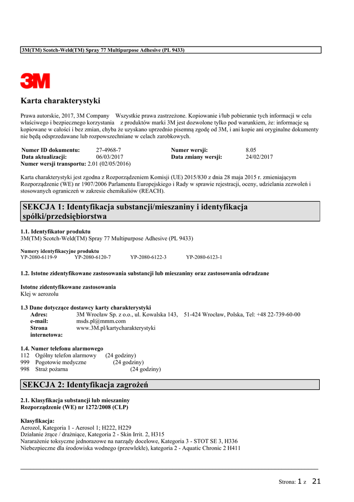 3M(TM) Scotch-Weld(TM) Spray 77 Multipurpose Adhesive (PL 9433) Karta charakterystyki Prawa autorskie, 2017, 3M Company Wszystkie prawa zastrzeżone. Kopiowanie i/lub pobieranie tych informacji w celu właściwego i bezpiecznego korzystania z produktów marki 3M jest dozwolone tylko pod warunkiem, że: informacje są kopiowane w całości i bez zmian, chyba że uzyskano uprzednio pisemną zgodę od 3M, i ani kopie ani oryginalne dokumenty nie będą odsprzedawane lub rozpowszechniane w celach zarobkowych. Numer ID dokumentu: 27-4968-7 Data aktualizacji: 06/03/2017 Numer wersji transportu: 2.01 (02/05/2016) Numer wersji: Data zmiany wersji: 8.05 24/02/2017 Karta charakterystyki jest zgodna z Rozporządzeniem Komisji (UE) 2015/830 z dnia 28 maja 2015 r. zmieniającym Rozporządzenie (WE) nr 1907/2006 Parlamentu Europejskiego i Rady w sprawie rejestracji, oceny, udzielania zezwoleń i stosowanych ograniczeń w zakresie chemikaliów (REACH). SEKCJA 1: Identyfikacja substancji/mieszaniny i identyfikacja spółki/przedsiębiorstwa 1.1. Identyfikator produktu 3M(TM) Scotch-Weld(TM) Spray 77 Multipurpose Adhesive (PL 9433) Numery identyfikacyjne produktu YP-2080-6119-9 YP-2080-6120-7 YP-2080-6122-3 YP-2080-6123-1 1.2. Istotne zidentyfikowane zastosowania substancji lub mieszaniny oraz zastosowania odradzane Istotne zidentyfikowane zastosowania Klej w aerozolu 1.3 Dane dotyczące dostawcy karty charakterystyki Adres: 3M Wrocław Sp. z o.o., ul. Kowalska 143, e-mail: [email protected] Strona www.3M.pl/kartycharakterystyki internetowa: 51-424 Wrocław, Polska, Tel: +48 22-739-60-00 1.4. Numer telefonu alarmowego 112 Ogólny telefon alarmowy (24 godziny) 999 Pogotowie medyczne (24 godziny) 998 Straż pożarna (24 godziny) SEKCJA 2: Identyfikacja zagrożeń 2.1. Klasyfikacja substancji lub mieszaniny Rozporządzenie (WE) nr 1272/2008 (CLP) Klasyfikacja: Aerozol, Kategoria 1 - Aerosol 1; H222, H229 Działanie żrące / drażniące, Kategoria 2 - Skin Irrit. 2, H315 Nararażenie toksyczne jednorazowe na narządy docelowe, Kategoria 3 - STOT SE 3, H336 Niebezpieczne dla środowiska wodnego (przewlekłe), kategoria 2 - Aquatic Chronic 2 H411 __________________________________________________________________________________________ Strona: 1 z 21 3M(TM) Scotch-Weld(TM) Spray 77 Multipurpose Adhesive (PL 9433) Pełne brzmienie zwrotów H w sekcji 16. 2.2. Elementy oznakowania Rozporządzenie (WE) nr 1272/2008 (CLP) Hasło ostrzegawcze: NIEBEZPIECZEŃSTWO Symbole:: GHS02 (Płomień)GHS07 (Wykrzyknik)GHS09 (Środowisko) Piktogramy: Zawiera: Nazwa substancji Węglowodory, C7, n-alkany, izoalkany, cykliczne Cykloheksan Zwroty H222 H229 H315 H336 Nr CAS 927-510-4 110-82-7 Stężenie % 10 - 30 7 - 13 wskazujące rodzaj zagrożenia: Skrajnie łatwopalny aerozol. Pojemnik pod ciśnieniem: Ogrzanie grozi wybuchem. Działa drażniąco na skórę. Może wywoływać uczucie senności lub zawroty głowy. H411 Działa toksycznie na organizmy wodne, powodując długotrwałe skutki. Zwroty wskazujące środki ostrożności: Ogólne: P102 Chronić przed dziećmi. Zapobieganie: P210A P211 P251 Przechowywanie: P410 + P412 Przechowywać z dala od źródeł ciepła, gorących powierzchni, iskrzenia, otwartego ognia i innych źródeł zapłonu. Palenie wzbronione. Nie rozpylać nad otwartym ogniem lub innym źródłem zapłonu. Nie przekłuwać ani nie spalać, nawet po zużyciu. Chronić przed światłem słonecznym. Nie wystawiać na działanie temperatury przekraczającej 50 ⁰C/122 ⁰F. Usuwanie: P501 Zawartość/pojemnik usuwać zgodnie z miejscowymi/regionalnymi/krajowymi/międzynarodowymi przepisami. 10% w mieszaninie znajdują się składniki o nieznanej toksyczności ostrej doustnej. Zawiera: 57% składników stanowi nieznane zagrożenie dla środowiska wodnego. Wskazówki dotyczące oznakowania: Zwrot H304 nie jest wymagany na etykiecie, ponieważ produkt jest aerozolem __________________________________________________________________________________________ Strona: 2 z 21 3M(TM) Scotch-Weld(TM) Spray 77 Multipurpose Adhesive (PL 9433) 2.3. Inne zagrożenia Nieznane SEKCJA 3: Skład/informacja o składnikach Nazwa substancji Nr CAS Składniki nielotne Tajemnica handlowa EC Nr Numer rejestracyjny REACH Stężenie % Klasyfikacja 10 - 30 Substancja niesklasyfikowana jako niebezpieczna Węglowodory, C7, n-alkany, izoalkany, 927-510-4 01-2119475515-33 10 - 30 Flam. Liq. 2, H225; Asp. Tox. 1 cykliczne H304; Skin Irrit. 2, H315; STOT SE 3, H336; Aquatic Chronic 2, H411 Propan 74-98-6 200-827-9 10 - 20 Flam. Gas 1, H220; Skroplony gaz, H280 - Nota U Kopolimer Butadienu Tajemnica 7 - 13 Substancja niesklasyfikowana handlowa jako niebezpieczna Węglowodory, C6, izoalkany, < 5% n931-254-9 01-2119484651-34 7 - 13 Flam. Liq. 2, H225; Asp. Tox. 1 heksan H304; STOT SE 3, H336; Aquatic Chronic 2, H411 Eter dimetylowy 115-10-6 204-065-8 7 - 13 Flam. Gas 1, H220; Skroplony gaz, H280 - Nota U Cykloheksan 110-82-7 203-806-2 7 - 13 Flam. Liq. 2, H225; Asp. Tox. 1 H304; Skin Irrit. 2, H315; STOT SE 3, H336; Aquatic Acute 1, H400,M=1; Aquatic Chronic 1, H410,M=1 Związek nielotny Tajemnica 5 - 10 Substancja niesklasyfikowana handlowa jako niebezpieczna Żywica termoplastyczna Tajemnica 5 - 10 Substancja niesklasyfikowana handlowa jako niebezpieczna Pentan 109-66-0 203-692-4 5 - 10 Flam. Liq. 2, H225; Asp. Tox. 1 H304; STOT SE 3, H336; EUH066; Aquatic Chronic 2, H411 - Nota C Butan 106-97-8 203-448-7 01-2119474691-32 3- 7 Flam. Gas 1, H220; Skroplony gaz, H280 - Nota C,U Węglan wapnia 1317-65-3 215-279-6 0- 5 Substancja niesklasyfikowana jako niebezpieczna Izobutan 75-28-5 200-857-2 1- 5 Flam. Gas 1, H220; Skroplony gaz, H280 - Nota C,U Izopentan 78-78-4 201-142-8 0,5 - 5 Flam. Liq. 1, H224; Asp. Tox. 1 H304; STOT SE 3, H336; EUH066; Aquatic Chronic 2, H411 Uwaga: Każdy wpis w kolumnie #WE, który zaczyna się od cyfr 6, 7, 8 lub 9 jest tymczasowym numerem zawartym w wykazie udostępnionego przez ECHA w oczekiwaniu na publikację oficja