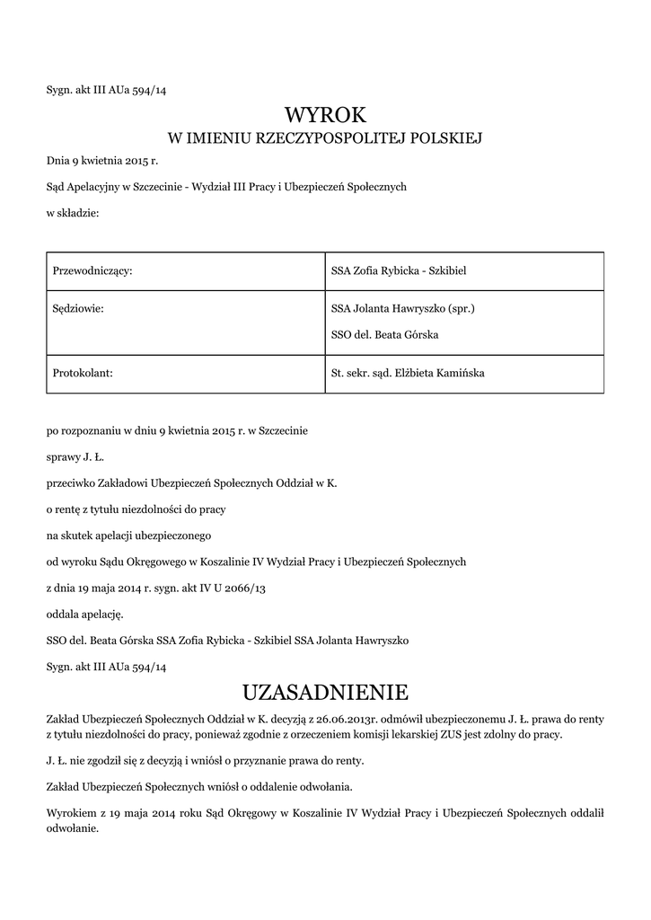 Sygn. akt III AUa 594/14 WYROK W IMIENIU RZECZYPOSPOLITEJ POLSKIEJ Dnia 9 kwietnia 2015 r. Sąd Apelacyjny w Szczecinie - Wydział III Pracy i Ubezpieczeń Społecznych w składzie: Przewodniczący: SSA Zofia Rybicka - Szkibiel Sędziowie: SSA Jolanta Hawryszko (spr.) SSO del. Beata Górska Protokolant: St. sekr. sąd. Elżbieta Kamińska po rozpoznaniu w dniu 9 kwietnia 2015 r. w Szczecinie sprawy J. Ł. przeciwko Zakładowi Ubezpieczeń Społecznych Oddział w K. o rentę z tytułu niezdolności do pracy na skutek apelacji ubezpieczonego od wyroku Sądu Okręgowego w Koszalinie IV Wydział Pracy i Ubezpieczeń Społecznych z dnia 19 maja 2014 r. sygn. akt IV U 2066/13 oddala apelację. SSO del. Beata Górska SSA Zofia Rybicka - Szkibiel SSA Jolanta Hawryszko Sygn. akt III AUa 594/14 UZASADNIENIE Zakład Ubezpieczeń Społecznych Oddział w K. decyzją z 26.06.2013r. odmówił ubezpieczonemu J. Ł. prawa do renty z tytułu niezdolności do pracy, ponieważ zgodnie z orzeczeniem komisji lekarskiej ZUS jest zdolny do pracy. J. Ł. nie zgodził się z decyzją i wniósł o przyznanie prawa do renty. Zakład Ubezpieczeń Społecznych wniósł o oddalenie odwołania. Wyrokiem z 19 maja 2014 roku Sąd Okręgowy w Koszalinie IV Wydział Pracy i Ubezpieczeń Społecznych oddalił odwołanie. Sad pierwszej instancji ustalił, że J. Ł., ur. (...), wykształcenie średnie – technikum rolnicze, w przebiegu zatrudnienia pracował jako traktorzysta, drwal-pilarz, ostatnio jako pracownik przetwórstwa rybnego. Ostatnim pracodawcą ubezpieczonego był w okresie 1.10.2007/21.09.2012. (...) S.A. w S., gdzie wykonywał pracę jako pracownik przetwórstwa rybnego, później pracownik działu logistyki wewnętrznej. Stosunek pracy uległ rozwiązaniu z uwagi na długotrwałą chorobę pracownika. Od 23.12.2011 do 21.06.2012 pobierał zasiłek chorobowy. Decyzją z 26.07.2012r. Zakład Ubezpieczeń Społecznych Oddział w K. odmówił prawa do świadczenie rehabilitacyjnego, Sąd Rejonowy w Koszalinie wyrokiem z 11 marca 2014 zmienił zaskarżoną decyzję i przyznał prawo do świadczenia rehabilitacyjnego na okres 12 miesięcy, od 22.06.2012 r. Wyrok został zaskarżony do Sądu Okręgowego w Koszalinie. Ubezpieczony w 24.04.2013 złożył wniosek o ustalenie prawa do renty z tytułu niezdolności do pracy. Lekarz orzecznik ZUS orzeczeniem z 23.05.2013 uznał ubezpieczonego za zdolnego do pracy, co potwierdziła komisja lekarska ZUS orzeczeniem z 19.06.2013r. Sąd okręgowy wskazał, że dopuścił dowód z opinii biegłych lekarzy specjalistów: neurologa, ortopedy i internisty, którzy rozpoznali schorzenia: przebyty zespół bólowy barku prawego na podłożu uszkodzenia mięśni stożka rotatorów, przebyte uszkodzenie ścięgna krótkiego mięśnia dwugłowego ramienia prawego, zmiany zwyrodnieniowe kręgosłupa szyjnego bez zespołu bólowego, nadciśnienie tętnicze, otyłość (BMI= 30,25 kg/m2), przebytą amputację paliczka obwodowego kciuka lewego u osoby praworęcznej nie upośledzająca funkcji chwytnej obu rąk i ocenili, że J. Ł. jest zdolny do pracy. Sąd okręgowy rozstrzygnął sprawę kierując się treścią art. 57, art. 12, art. 13 ustawy z 17 grudnia 1998 r. o emeryturach i rentach z Funduszu Ubezpieczeń Społecznych (t.j.Dz. U. z 2009r., Nr 153, poz. 1227 ze zm.). Sąd wskazał, że biegli opinii sądowej zauważyli, że ubezpieczony nie ma uszkodzonego narządu ruchu w sposób, który istotnie ograniczałby jego zdolność do pracy, przy czym rozpoznane uszkodzenie mięśni stożka rotatorów barku prawego, którego następstwem obecnie jest bolesny ruch w zakresie 90-120° stanowi przeciwwskazanie do pracy ciężkiej. Ponadto, zmiany zwyrodnieniowe kręgosłupa szyjnego nie powodują występowania zespołu bólowego i neurologicznych objawów ubytkowych, jak też nadciśnienie tętnicze nie jest schorzeniem powodującym niezdolności do pracy, co najwyżej wymaga skorygowania leczenia. W odpowiedzi na zarzuty ubezpieczonego biegli jednoznacznie podkreślili, że w toku badania nie stwierdzono u J. Ł. istotnego upośledzenia chwytności ręki lewej spowodowanej amputacją paliczka obwodowego kciuka, jak też badaniem porównawczym nie stwierdzono osłabienia siły mięśniowej kończyny górnej prawej. Sąd okręgowy podzielił wnioski opinii biegłych, ponieważ były logiczne, spójne, zdecydowane i ostatecznie zważył, że rodzaj dolegliwości ubezpieczonego oraz ich aktualny stopień zaawansowania nie były na tyle istotne, aby znacznie ograniczać wykonywanie pracy zgodnej z poziomem kwalifikacji zawodowych. Apelację od wyroku wywiódł ubezpieczony wnosząc o uchylnie wyroku i wydanie rozstrzygnięcia przyznającego mu prawo do renty na okres do przywrócenia zdolności do pracy oraz o wypłatę zaległego świadczenia rentowego za okres od 22.06.2013 roku do dnia, w którym uprawomocni się orzeczenie przyznające mu należne świadczenie rentowe. W uzasadnieniu apelujący wskazał, że przez cały okres pracy wykonywał ciężkie prace fizyczne i takimi były też praca w przetwórstwie rybnym, jak i praca na stanowisku pracownika działu logistyki wewnętrznej, mimo że została określona jako praca umysłowa. J. Ł. powołał się również na opinię biegłych z 9.11.2013, w której biegli stwierdzili, że zachował zdolność do pracy lekkiej oraz na wyrok Sądu Okręgowego w Koszalinie z 30 maja 2014 przyznający prawo do zasiłku rehabilitacyjnego. Sąd apelacyjny rozważył sprawę i uznał, że apelacja nie zasługiwała na uwzględnienie. Sąd okręgowy przeprowadził w sprawie wyczerpujące postępowanie dowodowe, korzystając przy tym z wiedzy specjalistycznej jaką dysponowali biegli sądowi z zakresu medycyny o specjalizacjach adekwatnych do schorzeń ubezpieczonego; przy tym biegli sądowi wnioski opinii sformułowali po zbadaniu ubezpieczonego jak też po zapoznaniu się z dokumentacją lekarską. Trafnie sąd okręgowy ocenił opinię biegłych ja