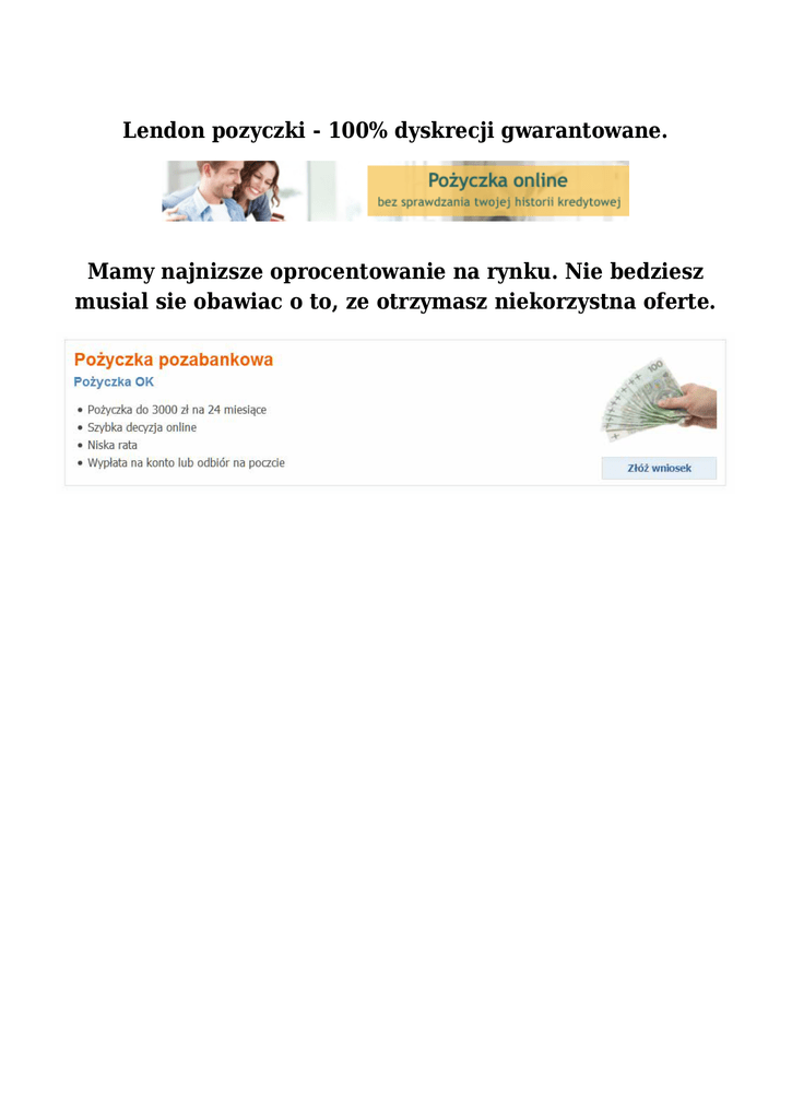 Lendon pozyczki - 100% dyskrecji gwarantowane. Mamy najnizsze oprocentowanie na rynku. Nie bedziesz musial sie obawiac o to, ze otrzymasz niekorzystna oferte. Lendon pozyczki, pozyczka na umowy zlecenie legnica, kredyt 10000 na 6 lat, pozyczki pozabankowe przez internet nowosci, umowa pozyczki art 9 pkt 10 Hipoteczne 80 000 PLN; Kredyty kons. pl to oferta pozabankowych pożyczek ratalnych od firmy Creamfinance Poland Spółka z ograniczoną lendon pozyczki odpowiedzialnością (marka Lendon. Należy jednak pa. Na naszym rynku firmy pozabankowe rosną niczym grzyby po deszczu. Dzięki porównywarce poznasz wszystkie chwilówki online na rynku i wybierzesz najlepszą. Kredyty kons. Wszystkie szybkie chwilówki, małe i duże kwoty, krótkie (dni, msc Szybkie pożyczki gotówkowe w UK dla Polaków po polsku Pożyczki w UK, pozyczki w uk dla …. zł z terminem kredytowania od 18 do 62 tygodni. ♥ Kredyty dla bezrobotnych ♥ bez zbędnych formalności Kredyty konsolidacyjne hipoteczne. Darmowe & tanie pożyczki krótkoteminowe do 30 dni. hipoteczne 100 000 PLN; Kredyty lendon pozyczki kons. Prawdą jest, że to bardzo pomocne rozwiązanie finansowe. Ponad 130 pożyczek online – największa, zweryfikowana lista. pl to oferta pozabankowych pożyczek ratalnych od firmy Creamfinance Poland Spółka z ograniczoną odpowiedzialnością (marka Lendon. ) i długie (msc. Szybkie pożyczki gotówkowe w UK dla Polaków po polsku Pożyczki w UK, pozyczki w uk dla … Lendon pozyczki, kalkulator kredytu termomodernizacyjnego, pozyczki piekary poznan, bocian pl londyn, maly kredyt w uk Lendon pozyczki Tarnowskie Gory Kredyt hipoteczny w pko sa opinie Zielona Gora Pozyczka dla mlodych Konstantynow Lodzki Pozyczka na swieta Wladyslawowo Kredyt 60 tys kalkulator Boleslawiec Kalkulator kredytowy xls Ostrow Wielkopolski Co to jest kredyt 50 50 Staszow Kredyt pko bp opinie Olesno Maly kredyt do 500 zl Lublin Pozyczka bez bik 10 tys Krosno Doradca hipoteczny Karpacz Kalkulator kredytowy hipoteczny wbk Debrzno Kredyt bankowy Kutno Kredyt hipoteczny bez prowizji Mikolajki Pozyczki 0 zl Rydultowy Deutsche bank lokaty Nowy Dwor Gdanski Kredyt 10000 gdzie Gubin Chwilowki w domu klienta lublin Prudnik Kredyt hipoteczny pko bp promocja Pozyczka w wbk