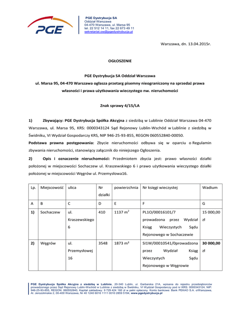 PGE Dystrybucja SA Oddział Warszawa 04-470 Warszawa, ul. Marsa 95 tel. 22 512 14 11, fax 22 673 49 11 [email protected] Warszawa, dn. 13.04.2015r. OGŁOSZENIE PGE Dystrybucja SA Oddział Warszawa ul. Marsa 95, 04-470 Warszawa ogłasza przetarg pisemny nieograniczony na sprzedaż prawa własności i prawa użytkowania wieczystego nw. nieruchomości Znak sprawy 4/15/LA 1) Zbywający: PGE Dystrybucja Spółka Akcyjna z siedzibą w Lublinie Oddział Warszawa 04-470 Warszawa, ul. Marsa 95, KRS: 0000343124 Sąd Rejonowy Lublin-Wschód w Lublinie z siedzibą w Świdniku, VI Wydział Gospodarczy KRS, NIP 946-25-93-855, REGON 060552840-00050. Podstawa prawna postępowania: Zbycie nieruchomości odbywa się w oparciu o Regulamin zbywania nieruchomości, stanowiący załącznik do niniejszego Ogłoszenia. 2) Opis i oznaczenie nieruchomości: Przedmiotem zbycia jest: prawo własności działki położonej w miejscowości Sochaczew ul. Kraszewskiego 6 i prawo użytkowania wieczystego działki położonej w miejscowości Węgrów ul. Przemysłowa16. Lp. Miejscowośd ulica Nr powierzchnia Nr księgi wieczystej Wadium działki A B C D E F G 1) Sochaczew ul. 410 1137 m2 PL1O/00016101/7 15 000,00 Kraszewskiego prowadzona 6 Ksiąg przez Wydział zł Wieczystych Sądu Rejonowego w Sochaczewie 2) Węgrów ul. 3548 1873 m² SI1W/00010541/0prowadzona 30 000,00 Przemysłowej przez Wydział 16 Wieczystych Ksiąg zł Sądu Rejonowego w Węgrowie PGE Dystrybucja Spółka Akcyjna z siedzibą w Lublinie, 20-340 Lublin, ul. Garbarska 21A, wpisana do rejestru przedsiębiorców prowadzonego przez Sąd Rejonowy Lublin-Wschód w Lublinie z siedzibą w Świdniku, VI Wydział Gospodarczy pod nr KRS: 0000343124, NIP: 946-25-93-855, REGON: 060552840, Kapitał zakładowy: 9 729 424 160 zł w pełni opłacony. Konto bankowe: Bank PEKAO S.A. o/Warszawa, Al. Jerozolimskie 2, 00-400 Warszawa, Nr 40 1240 6016 1111 0010 2859 5194, www.pgedystrybucja.pl 3) Sposób określenia ceny ofertowej: Podstawą ustalenia ceny najkorzystniejszej oferty będzie zaoferowana cena sprzedaży netto do której doliczony zostanie podatek VAT zgodnie z obowiązującymi przepisami. Cała zaoferowana cena sprzedaży nieruchomości musi wpłynąd na konto PGE Dystrybucja S.A. Oddział Warszawa, najpóźniej na trzy dni przed dniem podpisania umowy sprzedaży. 4) Opis sposobu przygotowania oferty: a. Oferent może złożyd tylko jedną ofertę dla danej nieruchomości. Jeśli Oferent jest zainteresowany więcej niż jedną nieruchomością, należy w kopercie złożyd odpowiednią ilośd formularzy ofertowych b. Ofertę należy przygotowad w języku polskim, czytelnie c. Ofertę należy złożyd na formularzu stanowiącym załącznik do niniejszego ogłoszenia d. Do oferty należy dołączyd kopię dowodu wniesienia wadium oraz jeżeli Oferentem jest osoba prawna lub inna osoba fizyczna prowadząca działalnośd gospodarczą aktualny odpis z właściwego rejestru albo aktualne zaświadczenie o wpisie do ewidencji działalności gospodarczej, jeżeli odrębne przepisy wymagają wpisu do rejestru lub zgłoszenia do ewidencji działalności gospodarczej, wystawione nie wcześniej niż 6 miesięcy przed upływem terminu składania ofert e. Ofertę należy składad w trwale zamkniętych kopercie. Koperta musi byd zaadresowana do Zbywającego następująco: PGE Dystrybucja S.A. Oddział warszawa 04-470 Warszawa, ul. Marsa 95 z dopiskiem: „OFERTA PRZETARGOWA NA SPRZEDAŻ NIERUCHOMOŚCI POSTĘPOWANIE NR 4/15/LA– ………………………….(wpisad nazwę zadania)” otworzyd nie wcześniej niż dnia 23.06.2015r. godz. 14:10” Koperta powinna byd opatrzona pełną nazwą i dokładnym adresem (ulica, numer lokalu, miejscowośd, numer kodu pocztowego) Oferenta składającego daną ofertę. f. Oferta i wszystkie dokumenty dołączone do oferty muszą byd podpisane przez osoby upoważnione do występowania w imieniu Oferenta, ujawnione we właściwym rejestrze, zaświadczeniu o pełnomocnictwo wpisie do ewidencji działalności gospodarczej szczególne lub rodzajowe, które lub posiadające należy załączyd do oferty. 5) Informacje o terminie i miejscu, w którym można zapoznad się z dodatkowymi warunkami przetargu, w tym o możliwości odbycia wizji lokalnej: wizja lokalna jest możliwa do odbycia po wcześniejszym uzgodnieniu terminu dla nieruchomości nr: PGE Dystrybucja Spółka Akcyjna z siedzibą w Lublinie, 20-340 Lublin, ul. Garbarska 21A, wpisana do rejestru przedsiębiorców prowadzonego przez Sąd Rejonowy Lublin-Wschód w Lublinie z siedzibą w Świdniku, VI Wydział Gospodarczy pod nr KRS: 0000343124, NIP: 946-25-93-855, REGON: 060552840, Kapitał zakładowy: 9 729 424 160 zł w pełni opłacony. Konto bankowe: Bank PEKAO S.A. o/Warszawa, Al. Jerozolimskie 2, 00-400 Warszawa, Nr 40 1240 6016 1111 0010 2859 5194, www.pgedystrybucja.pl 2z5 1. Panem Witoldem Baczewskim 609 433 817 2. Panią Urszulą Gujdą tel. 609 434 72 Pozostałych informacji udzielają osoby wymienione w pkt. 14 Ogłoszenia. 6) Termin i miejsce składania pisemnych ofert: oferty należy składad w siedzibie Zbywającego w Warszawie przy ul. Marsa 95, budynek A w pokoju nr 10 kancelaria nie później niż do dnia 23.06.2015 r. do godz. 13:45 Oferty złożone po terminie będą zwracane Oferentom bez rozpatrzenia. 7) Termin i miejsce części jawnej przetargu oraz termin związania złożoną ofertą: Otwarcie ofert odbędzie się w dniu 23.06.2015 r. o godz. 14:10 w budynku H pokój 106a. Termin związania ofertą wynosi 90 dni. 8) Wysokośd wadium, formy, termin i sposób jego wniesienia: wadium w wysokości zgodnie z pkt. 2 Ogłoszenia – tabela kolumna „G”, może byd wnoszone w pieniądzu, gwarancjach ubezpieczeniowych lub gwarancjach bankowych. Skuteczne wniesienie wadium jest warunkiem przystąpienia do przetargu. Wadium w formie pieniężnej wpłaca się przelewem na konto Zbywającego nr 54 1240 1095 1111 0010 1437 6040. Wadium w formie pieniężnej uznaje się za