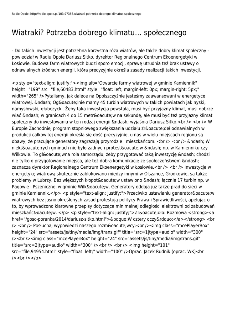 Radio Opole: http://radio.opole.pl/103,97356,wiatraki-potrzeba-dobrego-klimatus-spolecznego Wiatraki? Potrzeba dobrego klimatu… społecznego - Do takich inwestycji jest potrzebna korzystna róża wiatrów, ale także dobry klimat społeczny powiedział w Radiu Opole Dariusz Sitko, dyrektor Regionalnego Centrum Ekoenergetyki w Łosiowie. Budowa farm wiatrowych budzi sporo emocji, sprawę utrudnia też brak ustawy o odnawialnych źródłach energii, która precyzyjnie określa zasady realizacji takich inwestycji. <p style="text-align: justify;"><img alt="Otwarcie farmy wiatrowej w gminie Kamiennik" height="199" src="file,60483.html" style="float: left; margin-left: 0px; margin-right: 5px;" width="265" />Pytaliśmy, jak dalece na Opolszczyźnie jesteśmy zaawansowani w energetyce wiatrowej. – Ogólnie mamy 45 turbin wiatrowych w takich powiatach jak nyski, namysłowski, głubczycki. Żeby taka inwestycja powstała, musi być przyjazny klimat, musi dobrze wiać – w granicach 4 do 15 metrów na sekundę, ale musi być też przyjazny klimat społeczny do inwestowania w ten rodzaj energii – wyjaśnia Dariusz Sitko.<br /> <br /> W Europie Zachodniej program stopniowego zwiększania udziału źródeł odnawialnych w produkcji całkowitej energii określa się dość precyzyjnie, u nas w wielu miejscach regionu są obawy, że pracujące generatory zagrażają przyrodzie i mieszkańcom. <br /> <br /> – W niektórych gminach nie było żadnych protestów – np. w Kamienniku czy Wilkowie. To główna rola samorządu, żeby przygotować taką inwestycję – chodzi nie tylko o przygotowanie miejsca, ale też dobrą komunikację ze społeczeństwem – zaznacza dyrektor Regionalnego Centrum Ekoenergetyki w Łosiowie.<br /> <br /> Inwestycje w energetykę wiatrową skutecznie zablokowano między innymi w Olszance, Grodkowie, są także problemy w Lubrzy. Bez większych kłopotów ustawiono – łącznie 17 turbin np. w Pągowie i Pszenicznej w gminie Wilków. Generatory oddają już także prąd do sieci w gminie Kamiennik.</p> <p style="text-align: justify;">Przeciwko ustawianiu generatorów wiatrowych bez jasno określonych zasad protestują politycy Prawa i Sprawiedliwości, apelując o to, by wprowadzono klarowne przepisy dotyczące minimalnej odległości elektrowni od zabudowań mieszkańców. </p> <p style="text-align: justify;">Źródło: Rozmowa <strong><a href="/gosc-poranka/2014/dariusz-sitko.html">„W cztery oczy”</a></strong>.<br /> <br /> Posłuchaj wypowiedzi naszego rozmówcy:<br /><img class="mcePlayerBox" height="24" src="assets/js/tiny/media/img/trans.gif" title="src=1|type=audio" width="300" /><br /><img class="mcePlayerBox" height="24" src="assets/js/tiny/media/img/trans.gif" title="src=2|type=audio" width="300" /><br /> <br /> <img height="101" src="file,94954.html" style="float: left;" width="100" />Oprac. Jacek Rudnik (oprac. WK)<br /><br /></p>