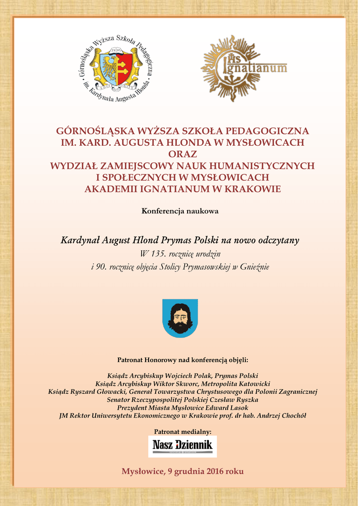 GÓRNOŚLĄSKA WYŻSZA SZKOŁA PEDAGOGICZNA IM. KARD. AUGUSTA HLONDA W MYSŁOWICACH ORAZ WYDZIAŁ ZAMIEJSCOWY NAUK HUMANISTYCZNYCH I SPOŁECZNYCH W MYSŁOWICACH AKADEMII IGNATIANUM W KRAKOWIE Konferencja naukowa Kardynał August Hlond Prymas Polski na nowo odczytany W 135. rocznicę urodzin i 90. rocznicę objęcia Stolicy Prymasowskiej w Gnieźnie Patronat Honorowy nad konferencją objęli: Ksiądz Arcybiskup Wojciech Polak, Prymas Polski Ksiądz Arcybiskup Wiktor Skworc, Metropolita Katowicki Ksiądz Ryszard Głowacki, Generał Towarzystwa Chrystusowego dla Polonii Zagranicznej Senator Rzeczypospolitej Polskiej Czesław Ryszka Prezydent Miasta Mysłowice Edward Lasok JM Rektor Uniwersytetu Ekonomicznego w Krakowie prof. dr hab. Andrzej Chochół Patronat medialny: Mysłowice, 9 grudnia 2016 roku ROZPOCZĘCIE KONFERENCJI GODZINA 8:00 MIEJSCE KONFERENCJI Aula Górnośląskiej Wyższej Szkoły Pedagogicznej im. Kardynała Augusta Hlonda w Mysłowicach ul. Powstańców 19 Program konferencji 8:00 – 8:30 8:30 – 9:00 Rejestracja uczestników Powitanie gości i otwarcie konferencji Rektor Górnośląskiej Wyższej Szkoły Pedagogicznej im. Kardynała Augusta Hlonda w Mysłowicach ks. dr Wacław Królikowski SJ Dziekan Wydziału Zamiejscowego Nauk Humanistycznych i Społecznych w Mysłowicach Akademii Ignatianum w Krakowie ks. dr Krzysztof Homa SJ Wystąpienia gości honorowych 9:00 – 9:20 prof. dr hab. Jerzy Pietrzak, Uniwersytet Wrocławski Odnowa Kościoła Katolickiego w wizji Kardynała Augusta Hlonda 9:20 – 9:40 ks. dr hab. Bernard Kołodziej SChr, prof. Uniwersytetu Adama Mickiewicza w Poznaniu, prof. Górnośląskiej WSP Etos sprawowanej władzy w Państwie według Kardynała Augusta Hlonda 9:40 – 10:00 dr hab. Aleksander Lipski, Uniwersytet Ekonomiczny w Katowicach Polityka a moralność w kontekście idei społeczeństwa obywatelskiego 10:00 – 10:20 ks. prof. nadzw. dr hab. Jan Pietrzykowski SDB, UKSW w Warszawie Relacje na obczyźnie ks. Artura Słomki SDB z prymasem Polski Kardynałem Augustem Hlondem w latach 1939-1945 10:20 – 10:40 ks. dr Stanisław Zimniak SDB, Salezjański Instytut Historyczny w Rzymie Pionier rozwoju dzieła salezjańskiego w Europie Środkowej 10:40 – 10:50 Luiza Kuźnicka, Muzeum Miasta Mysłowice Zaproszenie na wystawę August Hlond Prymas Polski 10:50 – 11:10 Dyskusja 11:10 – 11:40 Przerwa kawowa 11:40 – 12:00 Czesław Ryszka, Senator RP Proroctwa Maryjne Kardynała Augusta Hlonda 12:00 – 12:20 ks. dr Bogusław Kozioł SChr, Ośrodek Postulatorski Towarzystwa Chrystusowego Zagrożenie życia chrześcijańskiego przez ateizm i laicyzację. Studium na podstawie wypowiedzi i listów Kardynała Augusta Hlonda Relacja ze stanu procesu beatyfikacyjnego Kardynała Augusta Hlonda 12:20 – 12:40 12:40 – 13:30 13:30 – 13:50 ks. dr Jacek Brakowski SDB, Collegium Salesianum Bydgoszcz Wizyta ks. Kardynała Augusta Hlonda i ks. Kardynała Bernarda Griffina w Bydgoszczy (14-15 czerwca 1947 roku) Lunch dr Tadeusz Filar, Uniwersytet Ekonomiczny w Krakowie Książę Aleksander Lubomirski, Kardynał August Hlond i Święta Faustyna Kowalska w perspektywie „ekonomii Daru” 13:50 – 14:10 ks. dr Jarosław Wąsowicz SDB, Archiwum Salezjańskie Inspektorii Pilskiej Kardynał August Hlond, jako wychowawca młodego pokolenia Polaków 14:10 – 14:30 dr Mirosław Wójcik, prof. Akademii Ignatianum Znaczenie nauczania społecznego księdza Kardynała Augusta Hlonda dla kształtowania sylwetek zawodowych współczesnych pedagogów 14:30 – 14:50 ks. mgr Marcin Stefanik SChr, Ośrodek Postulatorski Towarzystwa Chrystusowego Integralna wizja życia małżeńskiego i rodzinnego w myśli Kardynała Augusta Hlonda 14:50 – 15:10 Dyskusja, podsumowanie obrad i zamknięcie konferencji