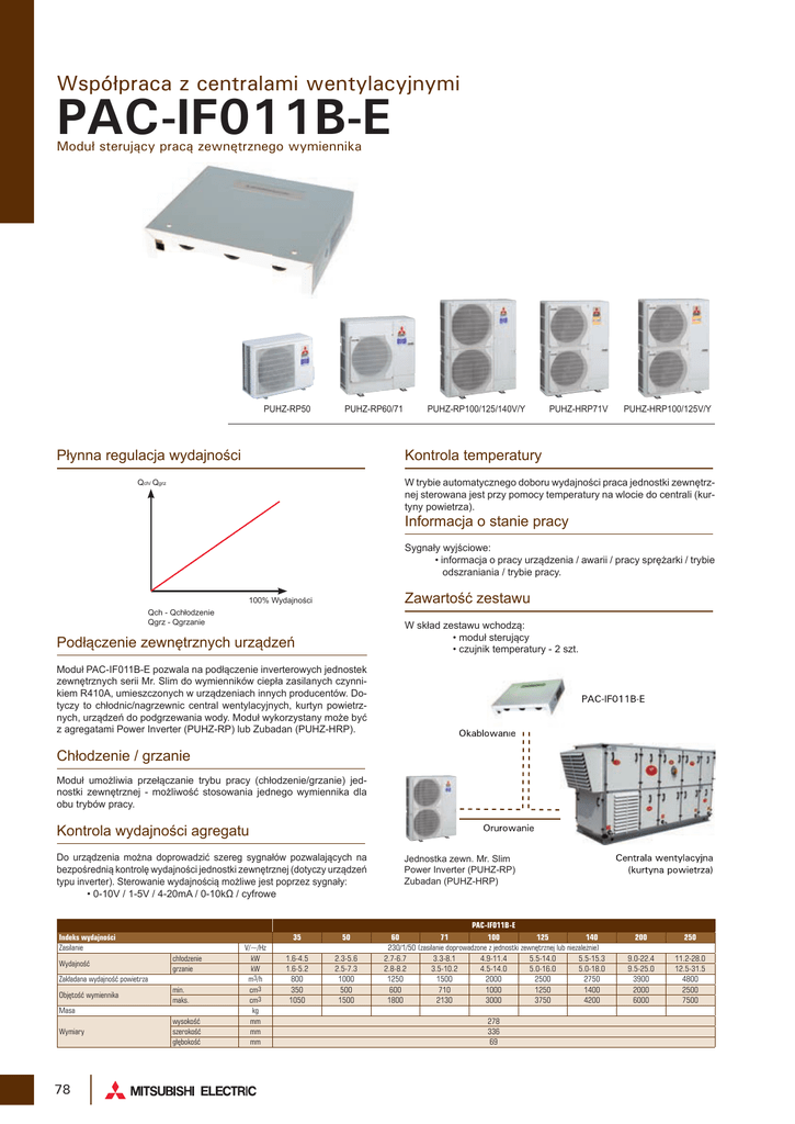Współpraca z centralami wentylacyjnymi Pac-iF011b-E Moduł sterujący pracą zewnętrznego wymiennika PUHZ-RP50 PUHZ-RP60/71 Płynna regulacja wydajności PUHZ-RP100/125/140V/Y PUHZ-HRP71V PUHZ-HRP100/125V/Y Kontrola temperatury W trybie automatycznego doboru wydajności praca jednostki zewnętrznej sterowana jest przy pomocy temperatury na wlocie do centrali (kurtyny powietrza). Qch/ Qgrz Informacja o stanie pracy Sygnały wyjściowe: • informacja o pracy urządzenia / awarii / pracy sprężarki / trybie odszraniania / trybie pracy. Zawartość zestawu 100% Wydajności Qch - Qchłodzenie Qgrz - Qgrzanie W skład zestawu wchodzą: • moduł sterujący • czujnik temperatury - 2 szt. Podłączenie zewnętrznych urządzeń Moduł PAC-IF011B-E pozwala na podłączenie inverterowych jednostek zewnętrznych serii Mr. Slim do wymienników ciepła zasilanych czynnikiem R410A, umieszczonych w urządzeniach innych producentów. Dotyczy to chłodnic/nagrzewnic central wentylacyjnych, kurtyn powietrznych, urządzeń do podgrzewania wody. Moduł wykorzystany może być z agregatami Power Inverter (PUHZ-RP) lub Zubadan (PUHZ-HRP). Chłodzenie / grzanie Moduł umożliwia przełączanie trybu pracy (chłodzenie/grzanie) jednostki zewnętrznej - możliwość stosowania jednego wymiennika dla obu trybów pracy. Kontrola wydajności agregatu Do urządzenia można doprowadzić szereg sygnałów pozwalających na bezpośrednią kontrolę wydajności jednostki zewnętrznej (dotyczy urządzeń typu inverter). Sterowanie wydajnością możliwe jest poprzez sygnały: • 0-10V / 1-5V / 4-20mA / 0-10kΩ / cyfrowe Indeks wydajności Zasilanie Wydajność chłodzenie grzanie Zakładana wydajność powietrza Objętość wymiennika min. maks. Masa Wymiary 78 wysokość szerokość głębokość V/~/Hz kW kW m3/h cm3 cm3 kg mm mm mm 35 50 1.6-4.5 1.6-5.2 800 350 1050 2.3-5.6 2.5-7.3 1000 500 1500 Jednostka zewn. Mr. Slim Power Inverter (PUHZ-RP) Zubadan (PUHZ-HRP) PAC-IF011B-E 60 71 100 125 140 230/1/50 (zasilanie doprowadzone z jednostki zewnętrznej lub niezależnie) 2.7-6.7 3.3-8.1 4.9-11.4 5.5-14.0 5.5-15.3 2.8-8.2 3.5-10.2 4.5-14.0 5.0-16.0 5.0-18.0 1250 1500 2000 2500 2750 600 710 1000 1250 1400 1800 2130 3000 3750 4200 278 336 69 200 250 9.0-22.4 9.5-25.0 3900 2000 6000 11.2-28.0 12.5-31.5 4800 2500 7500 Współpraca z centralami wentylacyjnymi Pac-iF012b-E Moduł sterujący pracą zewnętrznego wymiennika Economy SUZ-KA35 Płynna regulacja wydajności SUZ-KA50/60/71 PUHZ-P100V/Y PUHZ-P100/125/140V/Y Kontrola temperatury W trybie automatycznego doboru wydajności praca jednostki zewnętrznej sterowana jest przy pomocy temperatury na wlocie do centrali (kurtyny powietrza). Qch/ Qgrz Informacja o stanie pracy Sygnały wyjściowe: • informacja o pracy urządzenia / awarii / pracy sprężarki / trybie odszraniania / trybie pracy Zawartość zestawu 100% Wydajności Qch - Qchłodzenie Qgrz - Qgrzanie W skład zestawu wchodzą: • moduł sterujący • czujnik temperatury - 3 szt. Podłączenie zewnętrznych urządzeń Moduł PAC-IF012B-E pozwala na podłączenie inverterowych jednostek zewnętrznych serii Mr. Slim do wymienników ciepła zasilanych czynnikiem R410A, umieszczonych w urządzeniach innych producentów. Dotyczy to chłodnic/nagrzewnic central wentylacyjnych, kurtyn powietrznych, urządzeń do podgrzewania wody. Moduł wykorzystany może być z agregatami serii Mr. Slim (PU-P, PUH-P, SUZ, PUHZ-P, PUHZ-RP, PUHZ-HRP). PAC-IFO12B-E Chłodzenie / grzanie Moduł umożliwia przełączanie trybu pracy (chłodzenie/grzanie) jednostki zewnętrznej - możliwość stosowania jednego wymiennika dla obu trybów pracy. Kontrola wydajności agregatu Do urządzenia można doprowadzić szereg sygnałów pozwalających na bezpośrednią kontrolę wydajności jednostki zewnętrznej (dotyczy urządzeń typu inverter). Sterowanie wydajnością możliwe jest poprzez sygnały: • 0-10V / 1-5V / 4-20mA / 0-10kΩ / cyfrowe Indeks wydajności Zasilanie Wydajność chłodzenie grzanie Zakładana wydajność powietrza Objętość wymiennika min. maks. Masa Wymiary wysokość szerokość głębokość V/~/Hz kW kW m3/h cm3 cm3 kg mm mm mm 35 50 1.6-4.5 1.6-5.2 800 350 1050 2.3-5.6 2.5-7.3 1000 500 1500 Jednostka zewn. Mr. Slim PAC-IF012B-E 60 71 100 125 140 230/1/50 (zasilanie doprowadzone z jednostki zewnętrznej lub niezależnie) 2.7-6.7 3.3-8.1 4.9-11.4 5.5-14.0 5.5-15.3 2.8-8.2 3.5-10.2 4.5-14.0 5.0-16.0 5.0-18.0 1250 1500 2000 2500 2750 600 710 1000 1250 1400 1800 2130 3000 3750 4200 200 250 9.0-22.4 9.5-25.0 3900 2000 6000 11.2-28.0 12.5-31.5 4800 2500 7500 278 336 69 79
